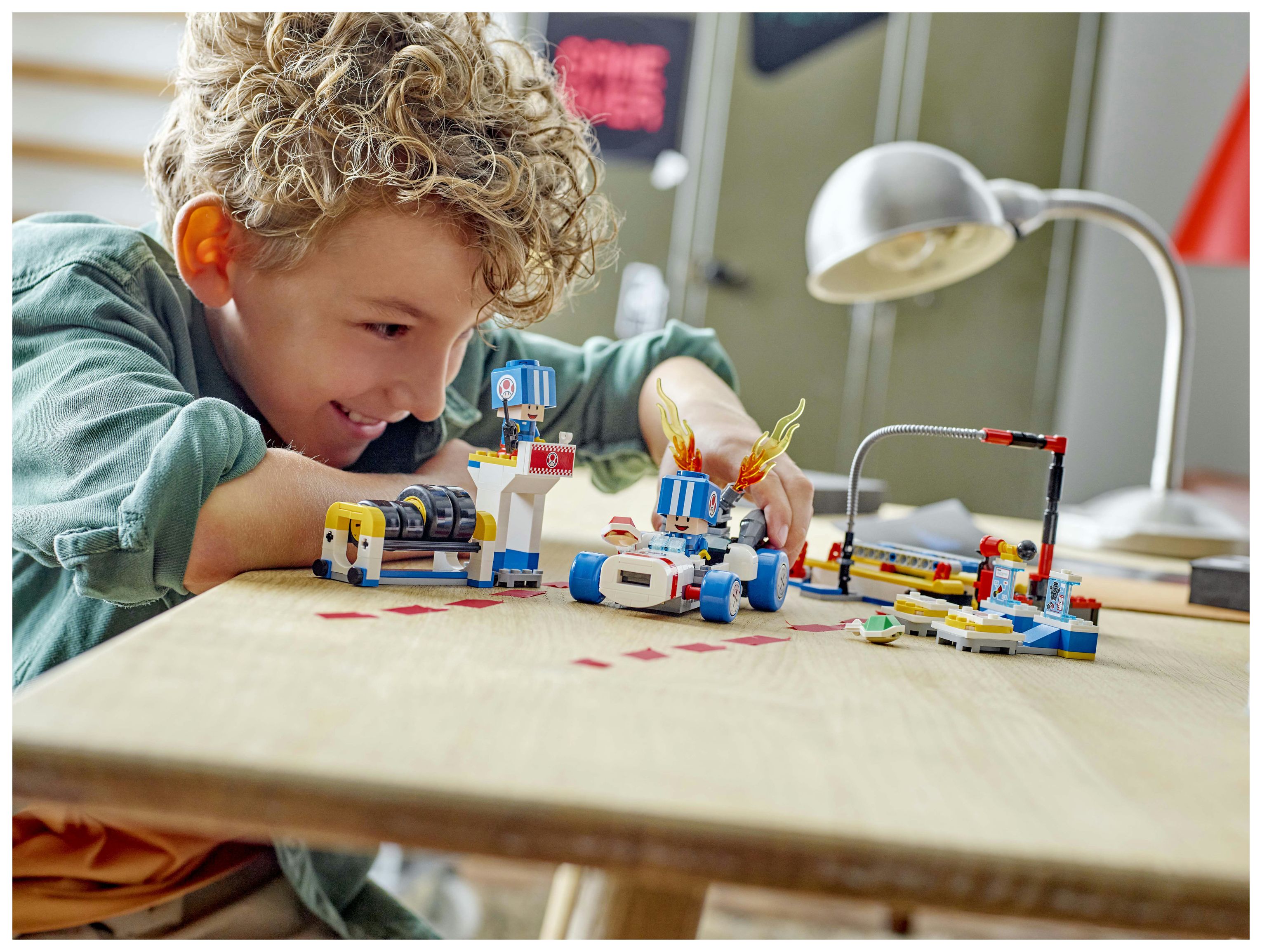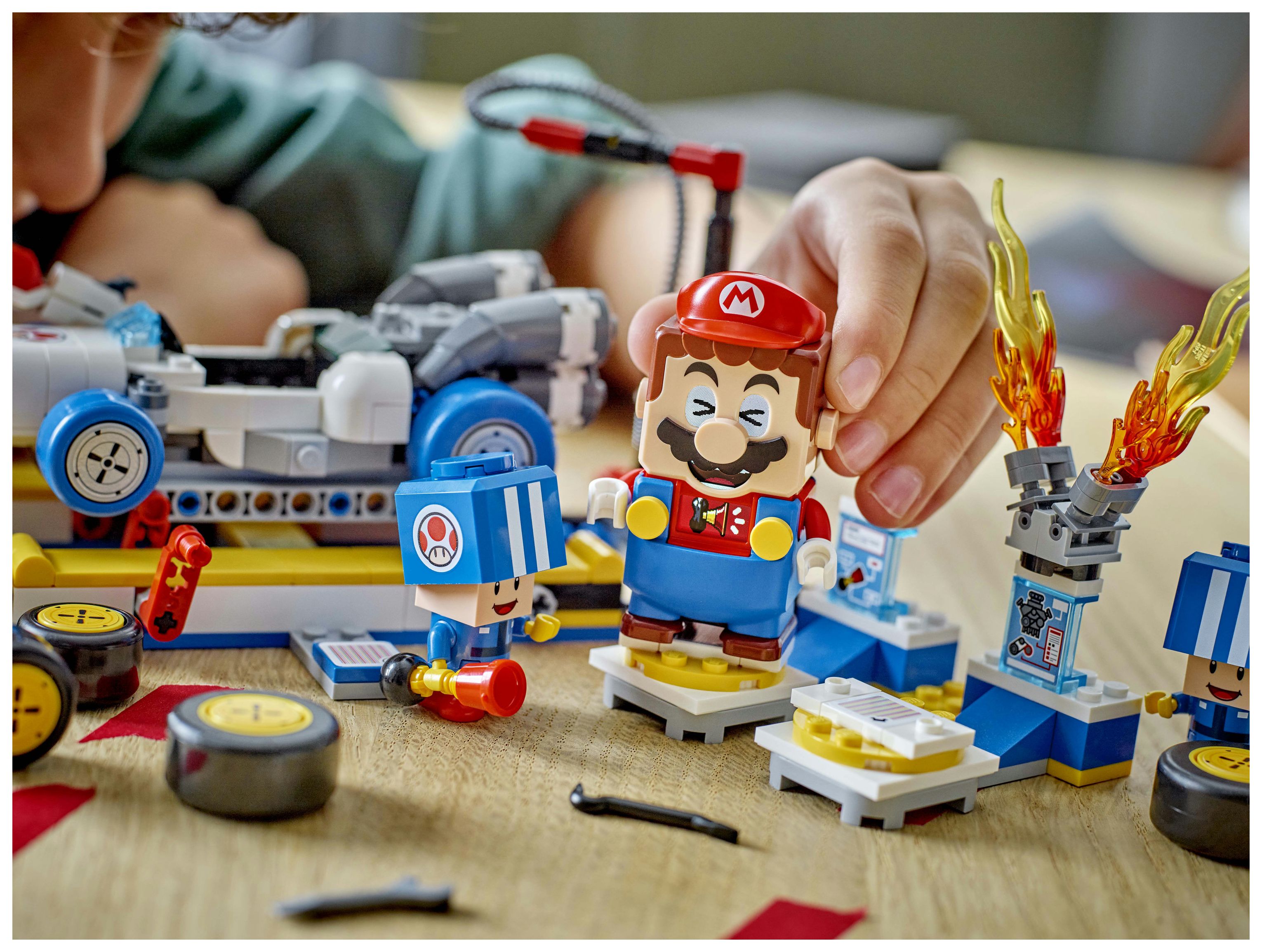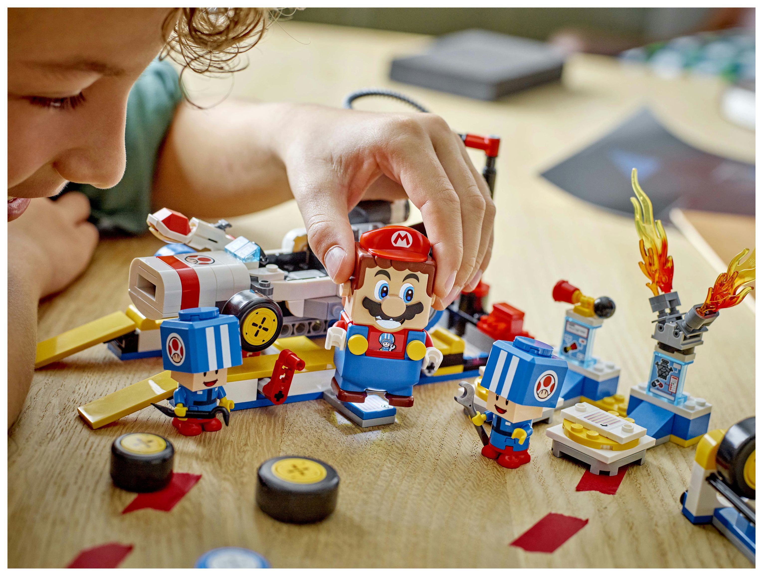 Geschenkidee mit einem Nintendo® Charakter: Dieses LEGO® Super Mario™: Mario Kart™ Spielset lässt Kinder in die Rolle der Boxencrew schlüpfen und den anpassbaren Boliden in Toads Werkstatt für spannende Rennen aufmotzen