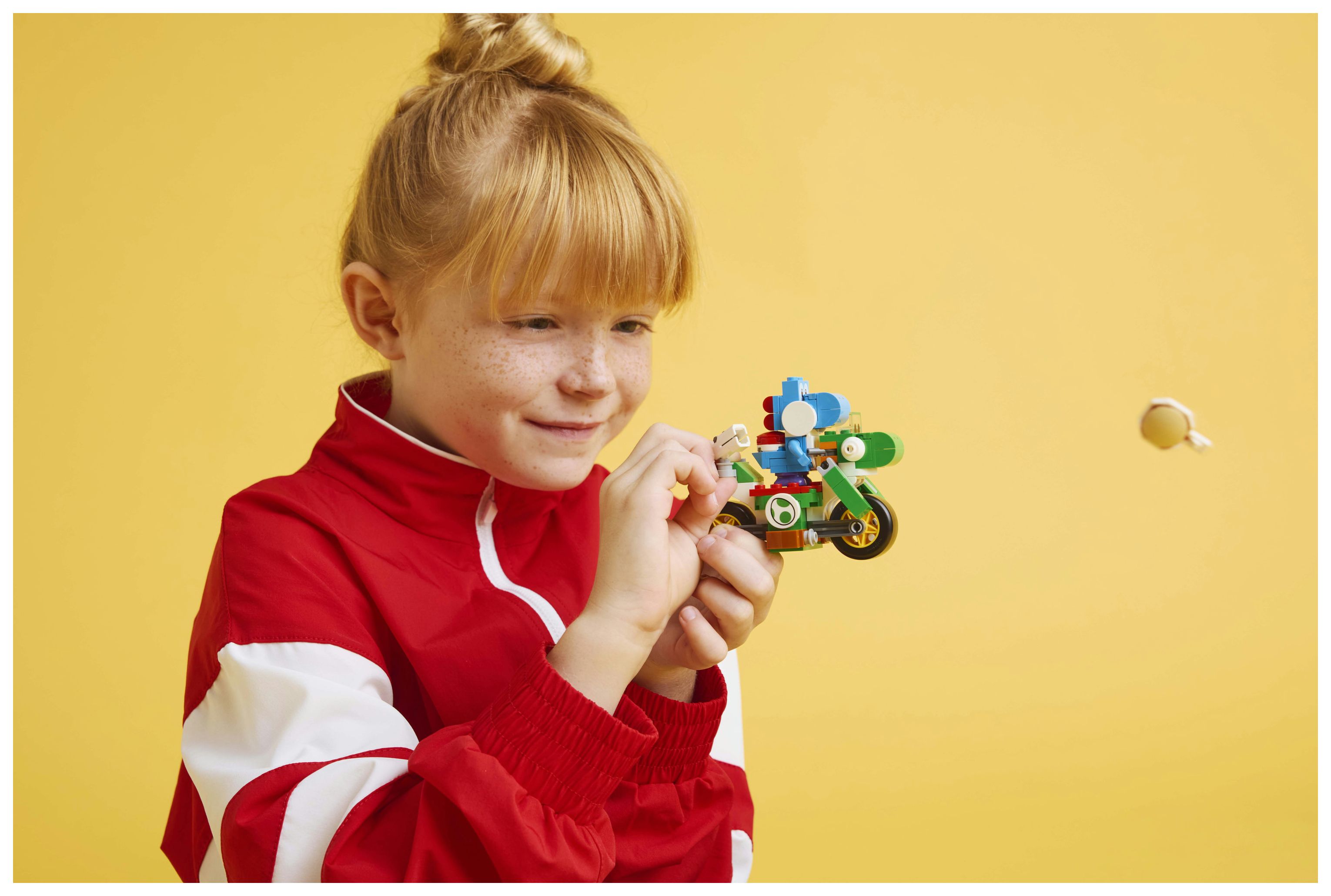 Nintendo® Geschenkidee für Kinder: Dieses LEGO® Super Mario™: Mario Kart™ Abenteuer-Spielset lässt dich ein Modell des Yoshi-Bikes aus LEGO Steinen bauen, mit dem du fahren und wunderbar driften kannst