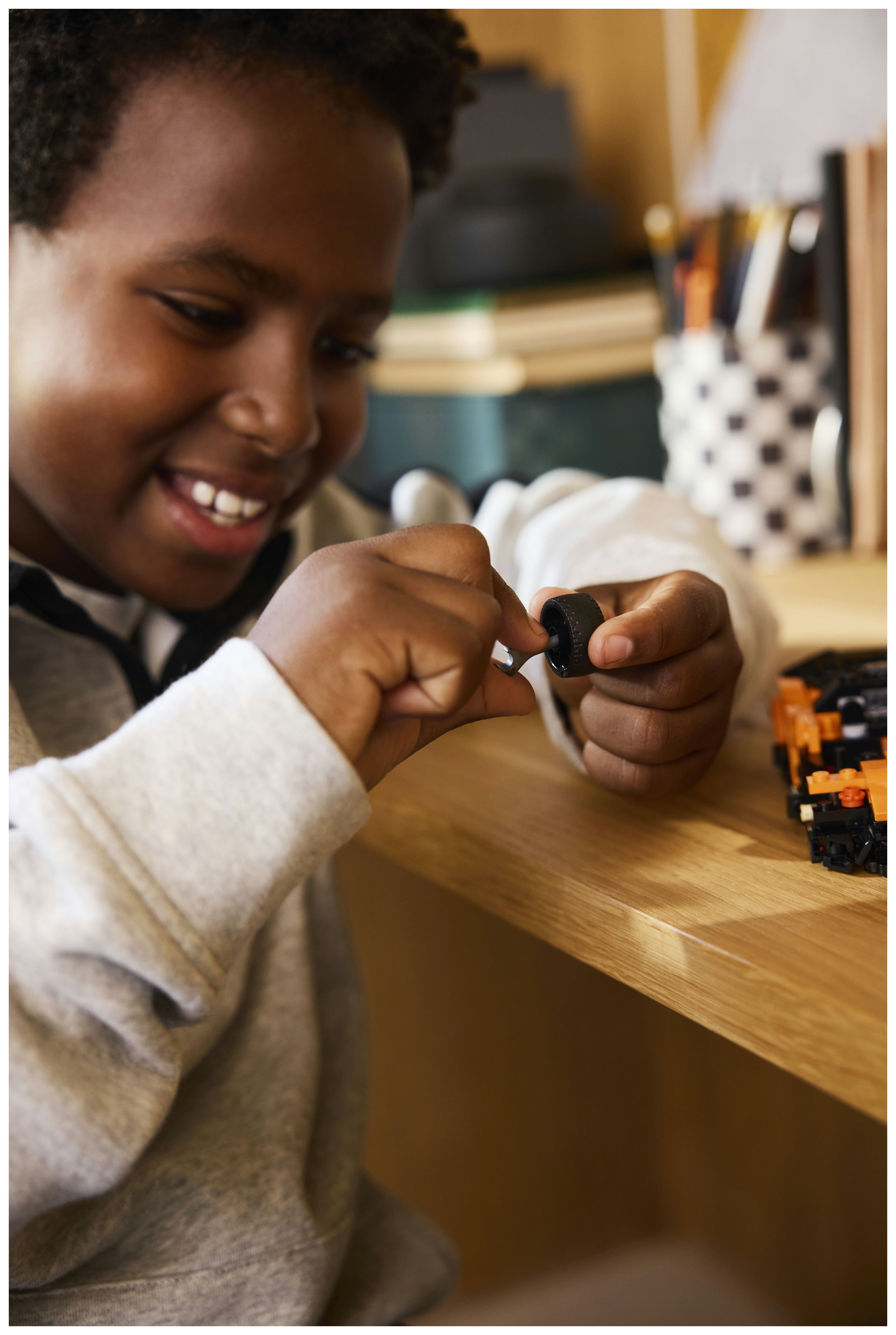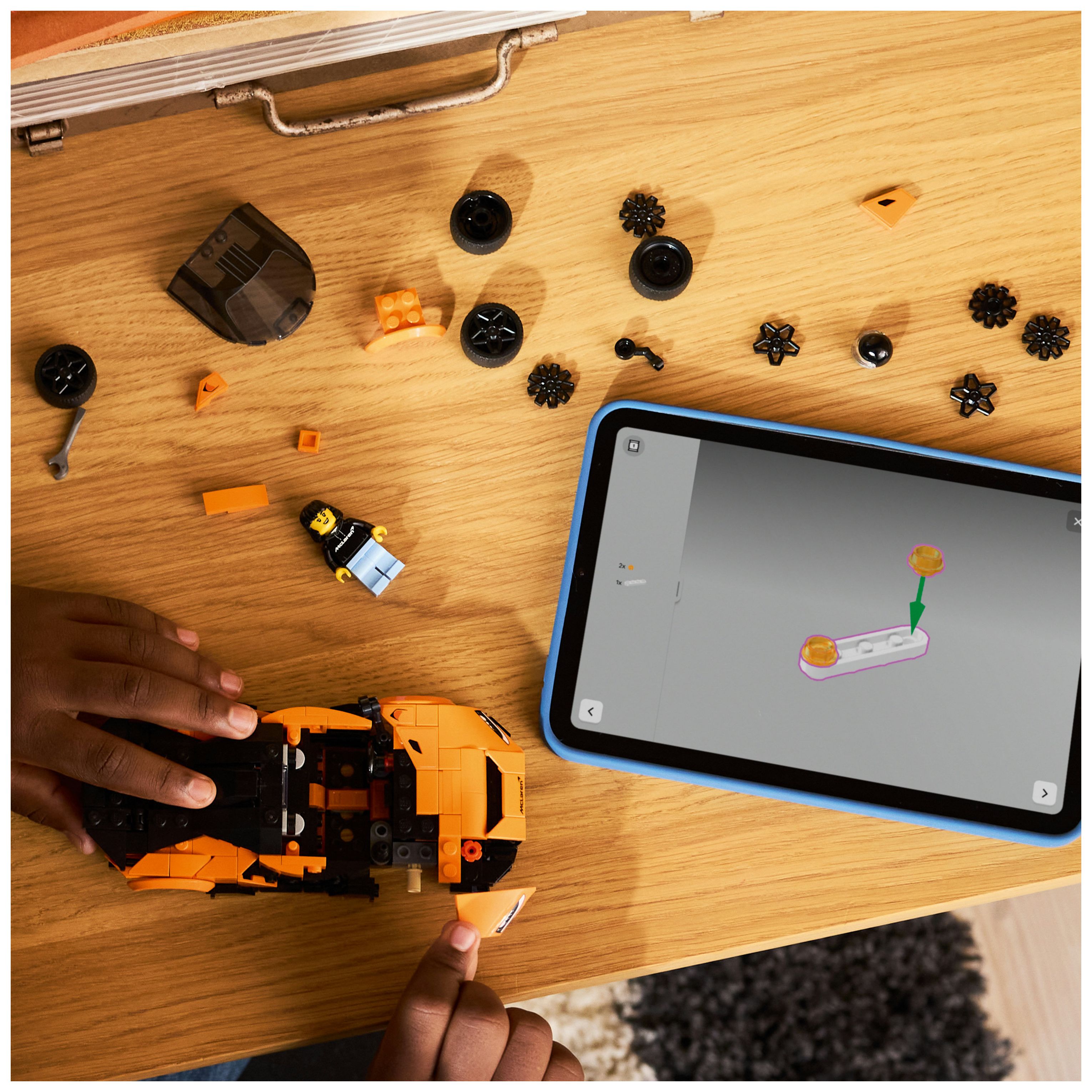 Dieses McLaren-Modell hat einen Heckmotor, ein Cockpit, ein Infotainment-Display, Lufteinlässe an den Seiten und in der Motorhaube sowie einen verstellbaren Heckflügel für Fahrten auf der Straße oder auf der Rennstrecke. Neben dem Spielzeugauto gehört auch eine Minifigur im McLaren-Outfit sowie mit Helm und Haarteil zu dem Set. Mit ihrem Schraubenschlüssel kannst du auch Steine lösen oder Aufkleber aufbringen.