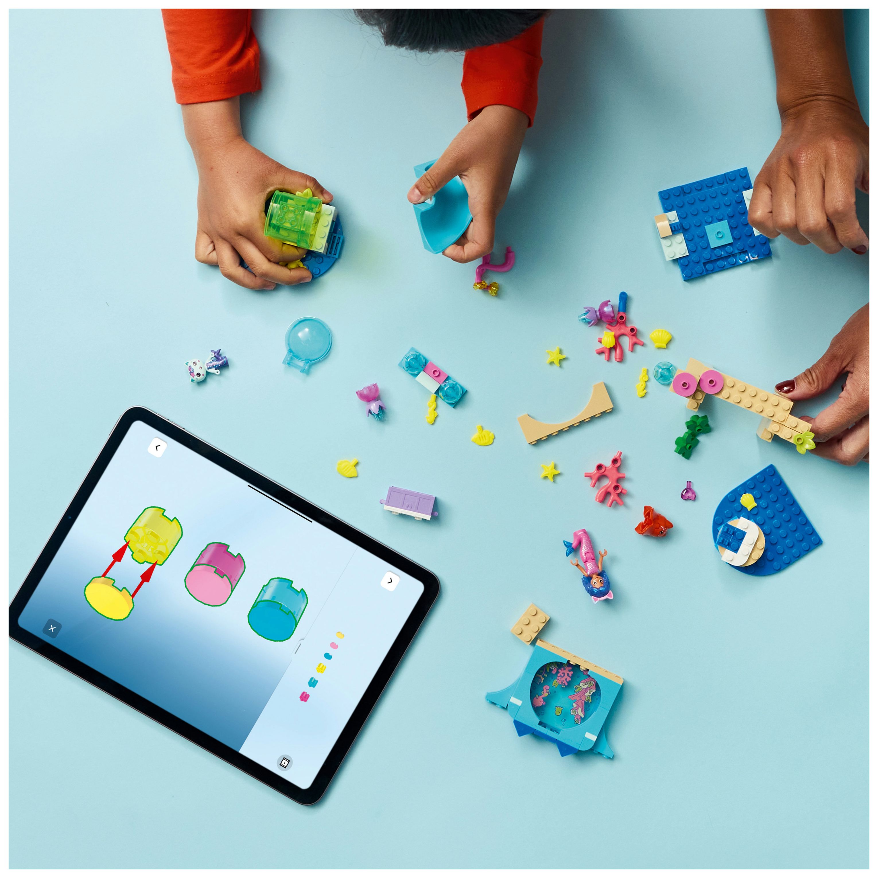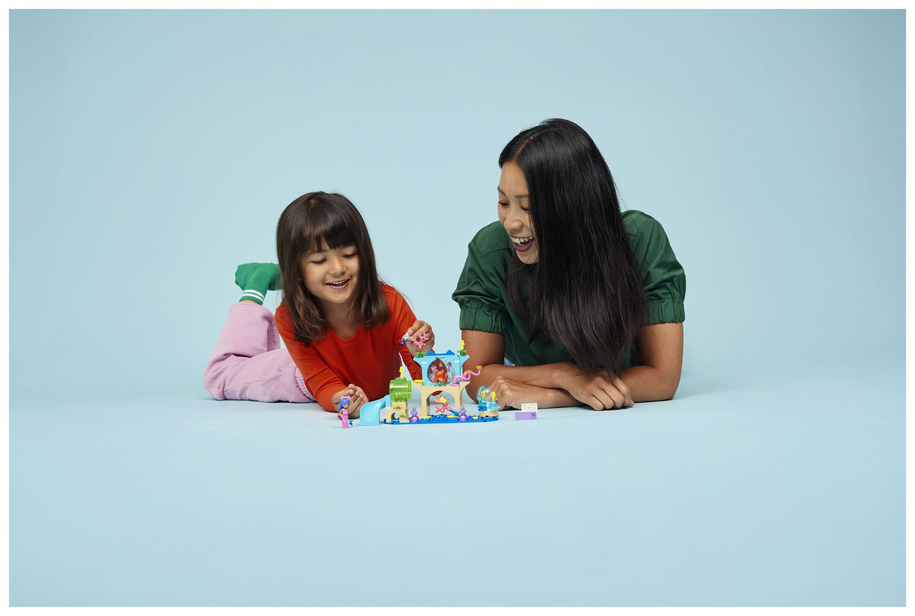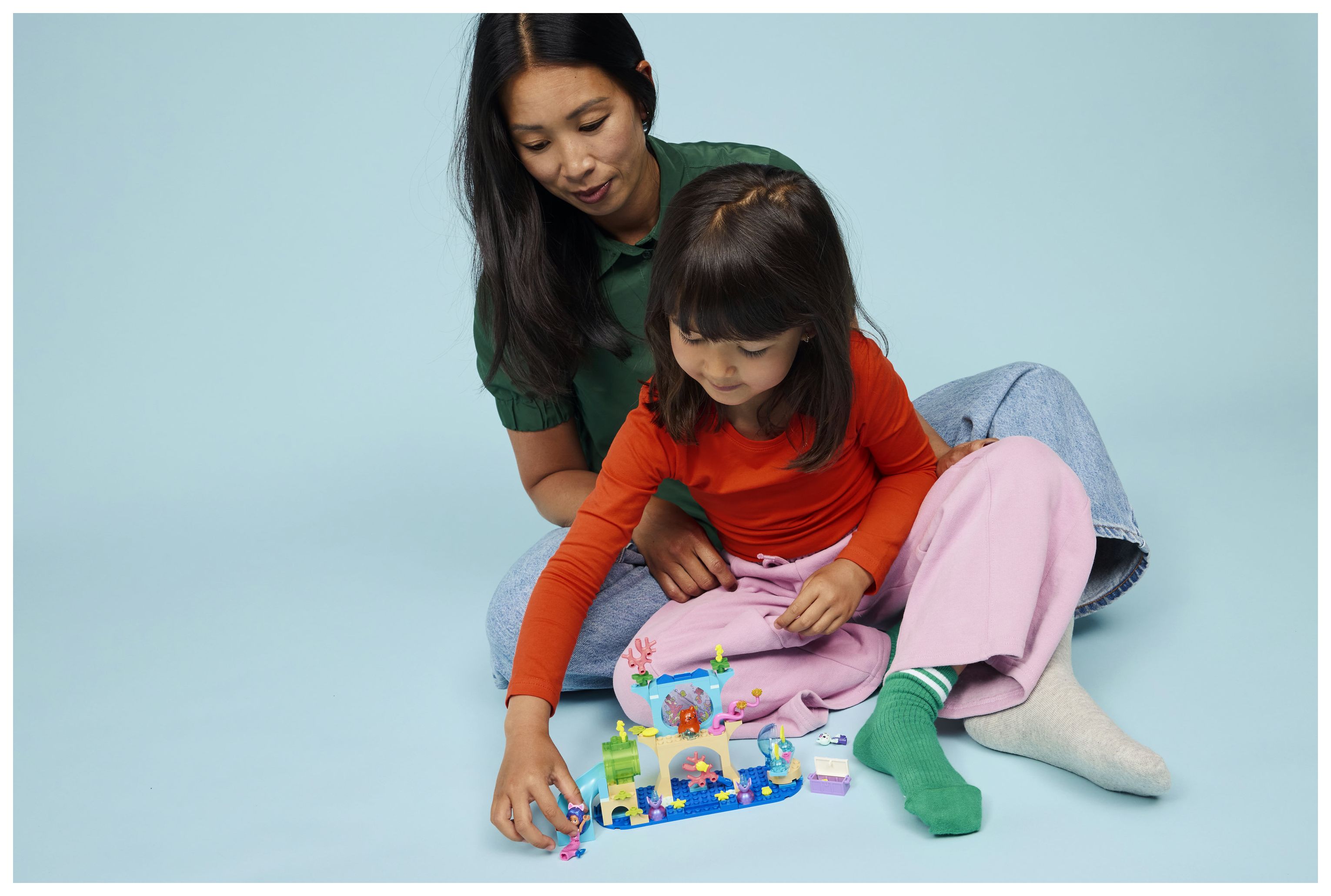 Bau- und Spielset für Kinder: In dem Set gibt es viel zu entdecken, unter anderem Muscheln, Pflanzen, eine Rutsche, eine Riesenblase, in der die Figuren „schwimmen“ können, und eine Koralle, die eine verborgene Schatztruhe preisgibt