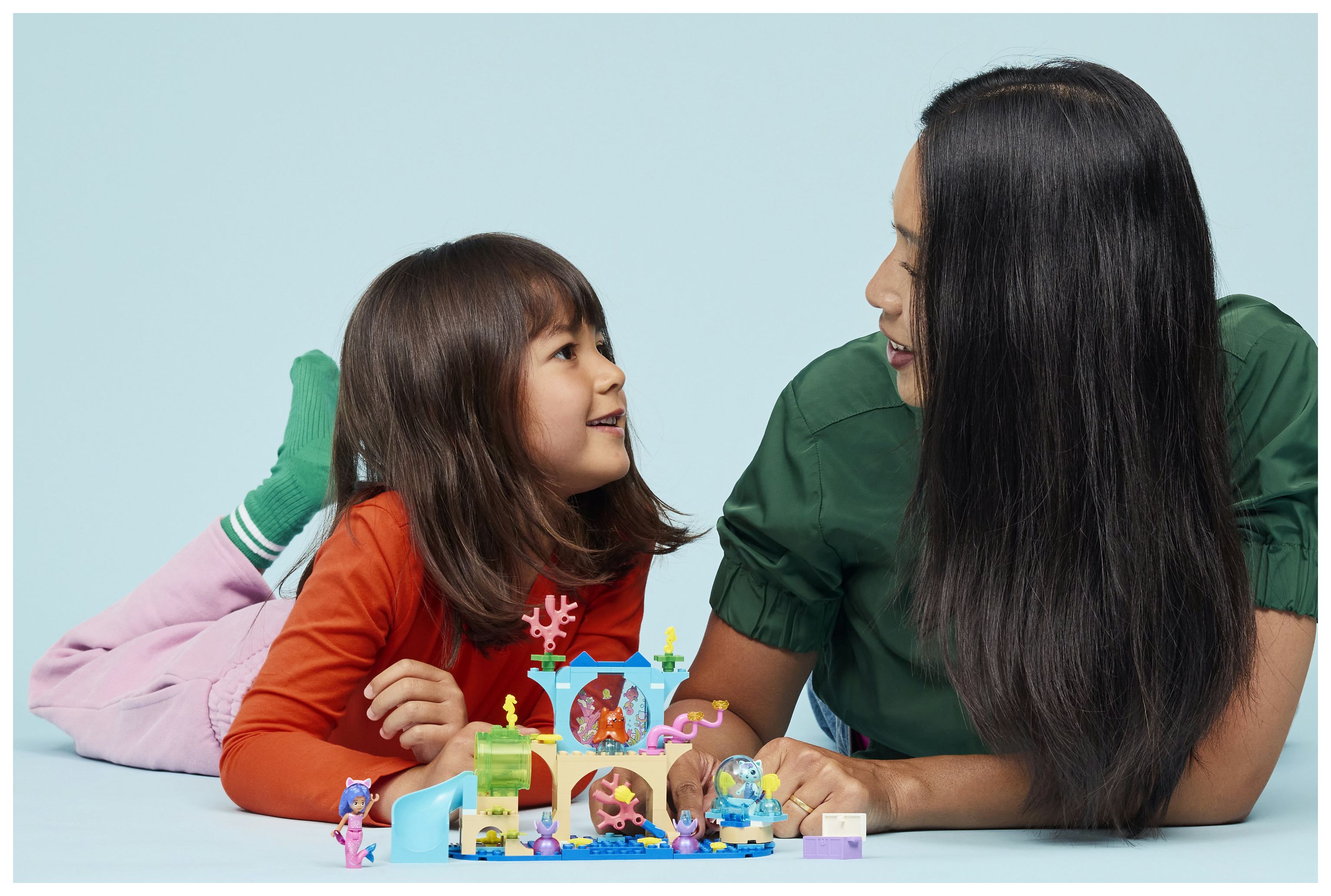 Spielzeug zu Gabby’s Dollhouse: The Movie: Für Unterwasserrollenspiele beinhaltet dieses Spielset die Spielfigur Gabby in ihrem Meerjungfrauenkostüm, die Figuren Meerkätzchen und Quallen-Kätzchen sowie ein Starter-Bauelement für rasche Bauerfolge