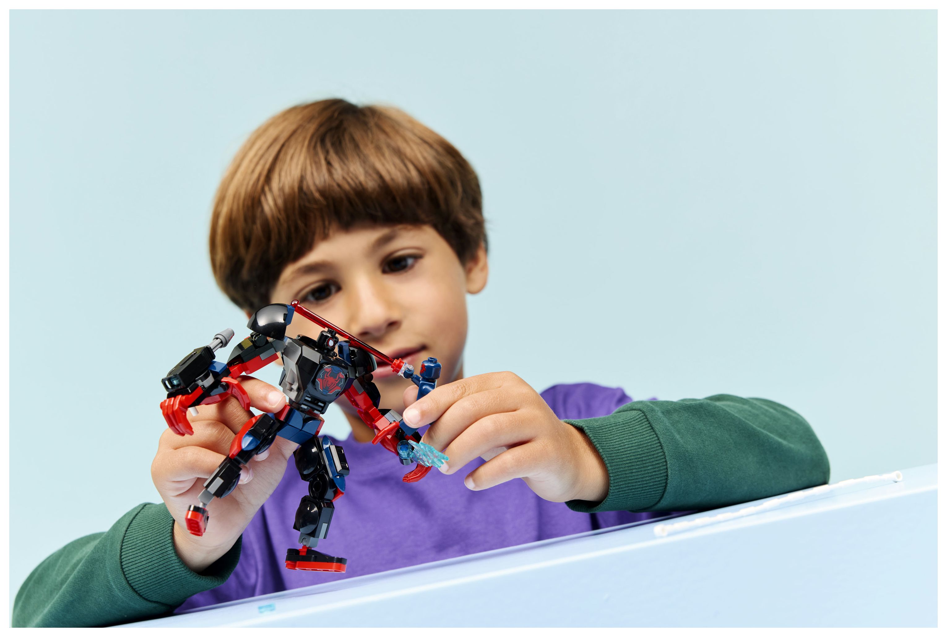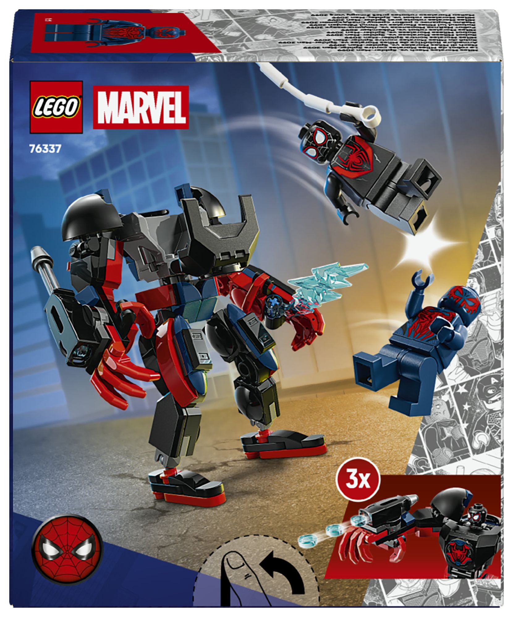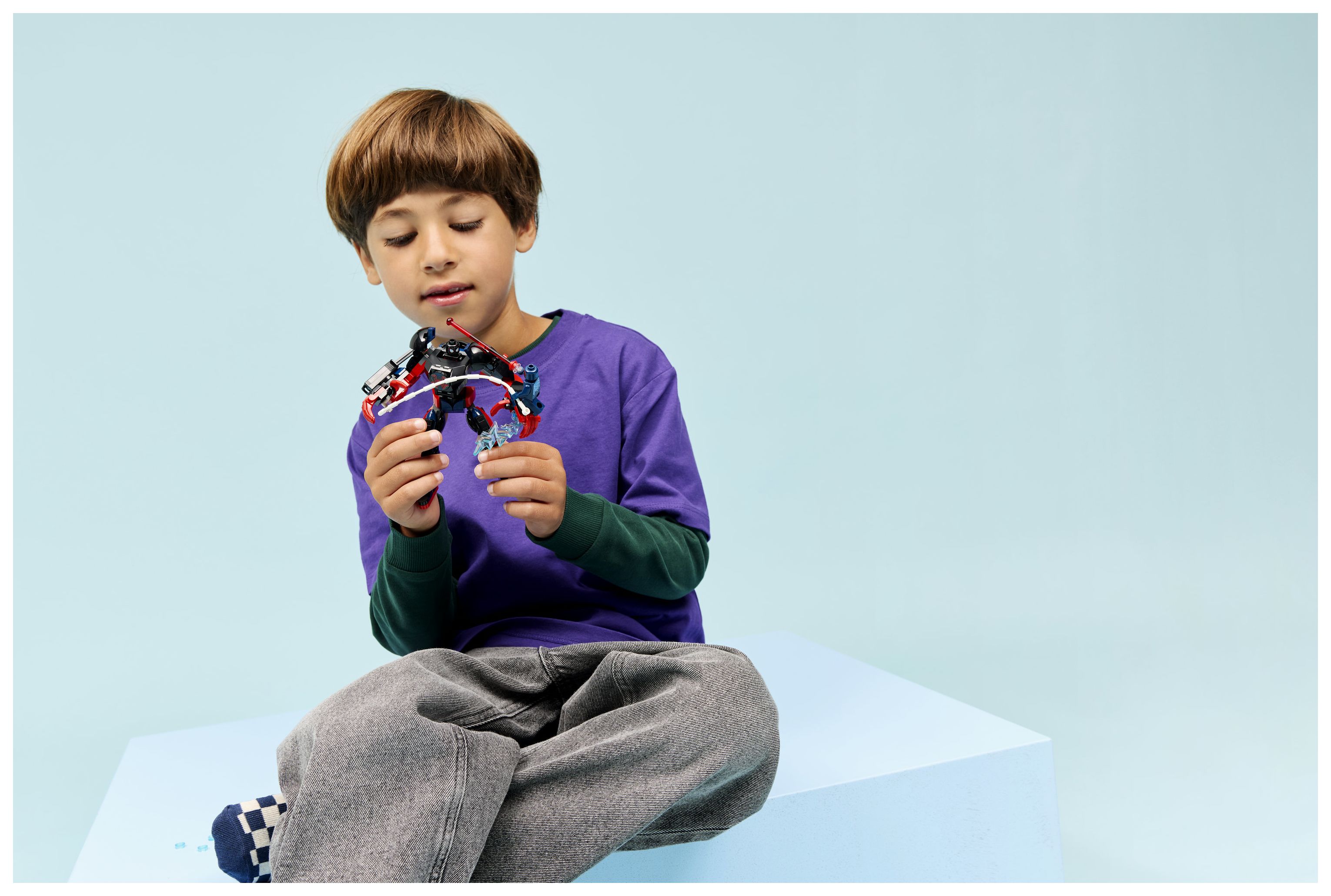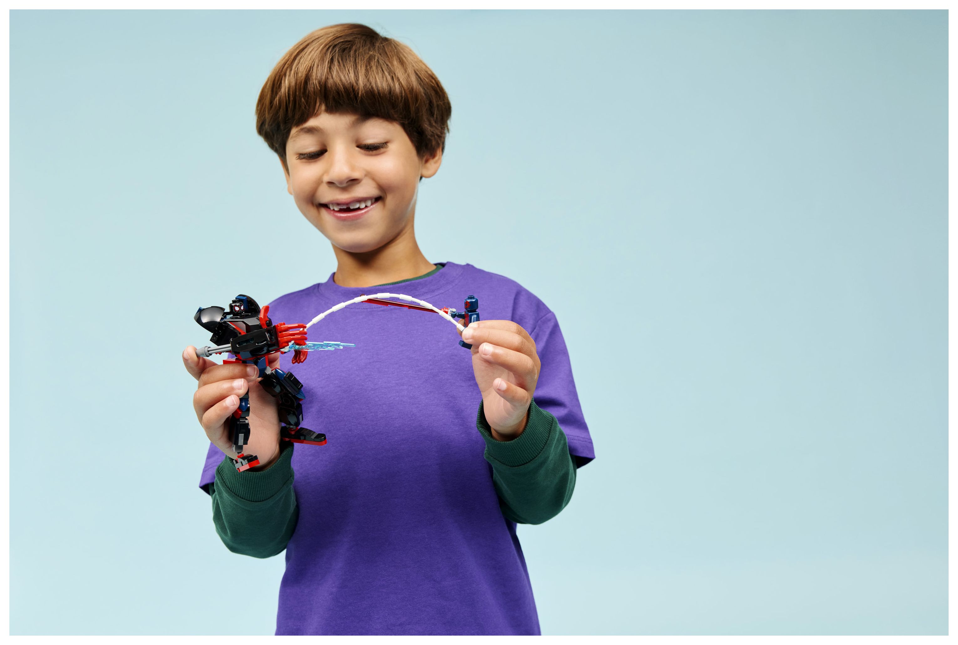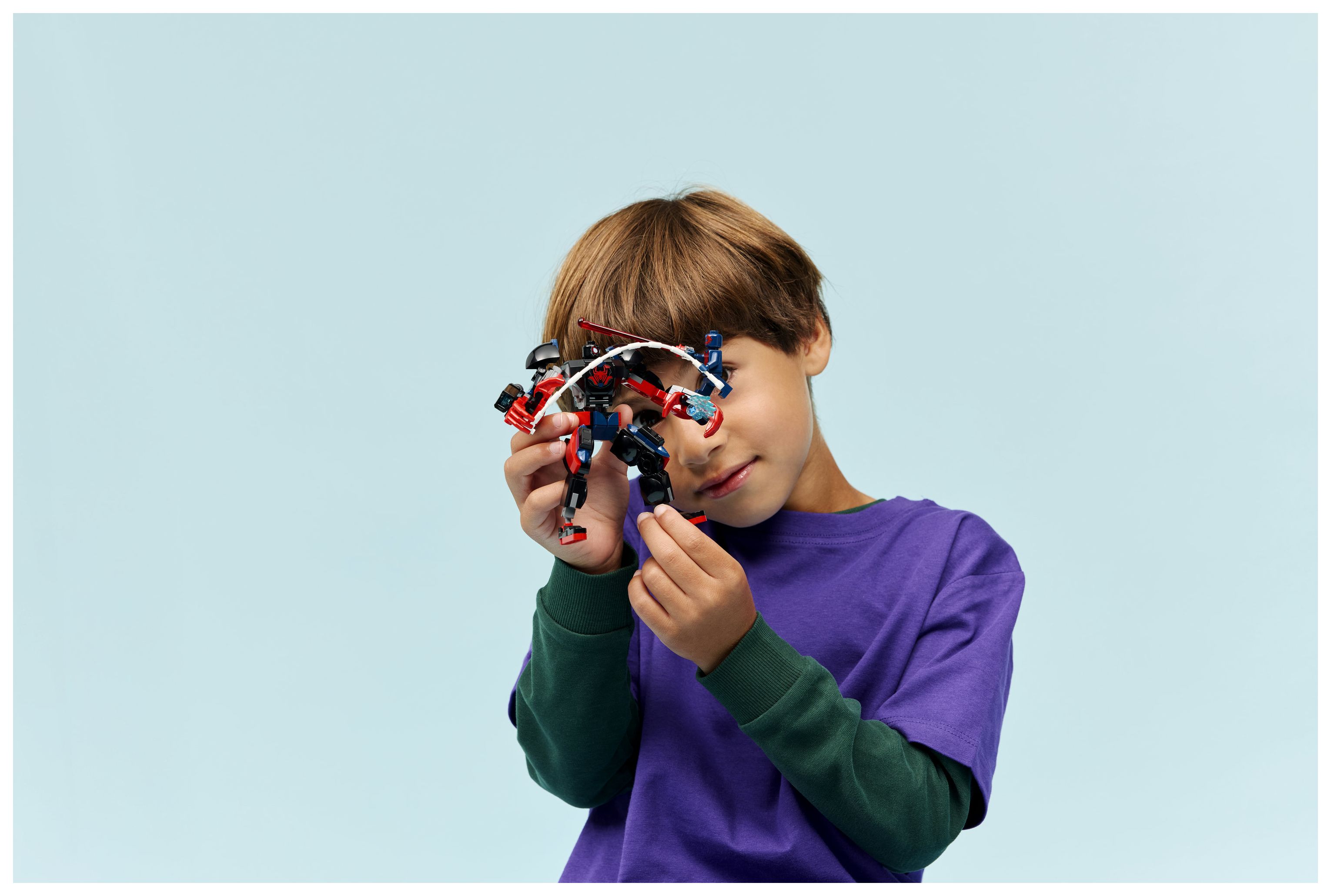 SUPERHELDEN-ROLLENSPIELE: Jedes Glied des Mech-Bauspielzeugs ist mit Gelenken versehen, um dynamischen Actionspaß zu bieten. Klappt man den Oberkörper auf, kommt ein Cockpit zum Vorschein, in das die Minifigur Miles Morales hineinpasst