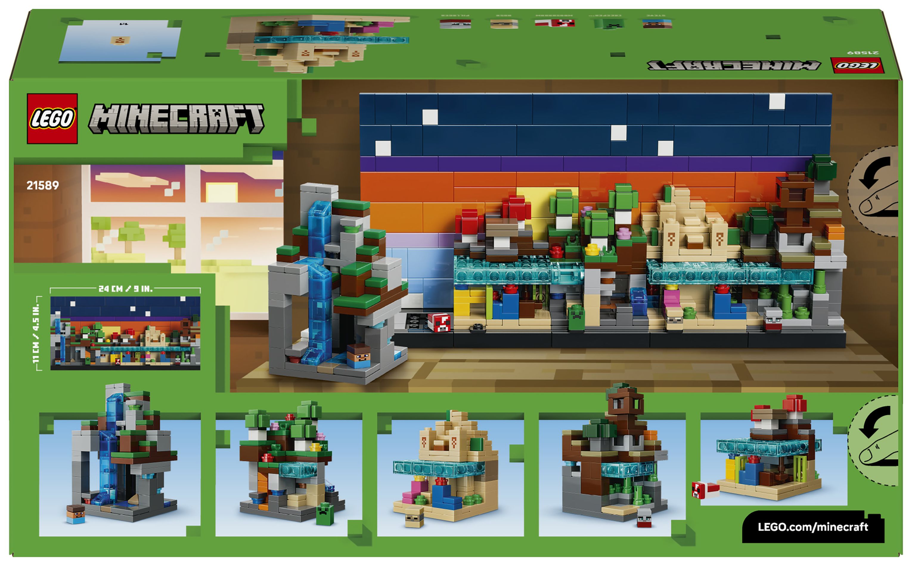 Dieses LEGO Minecraft Set stellt 5 herausnehmbare Biome dar: Berg (mit Tropfsteinhöhle, Amethystgeode und Wasserfall), Blumenwald (mit Höhle, Lava und Gold), Pilzfelder (mit Korallenriff, Schiffswrack, 2 roten Pilzbäumen und einem braunen Pilz), Wüste (mit Tempel, Korallenriff, Ozean, Kakteen und Schatztruhe) und Savanne (mit Plünderer-Außenposten, üppiger Höhle, Akazien, Kürbis, Lava und Strand). Ein umdrehbarer Tag-Nacht-Hintergrund ist ebenfalls enthalten. Das Set ist ein tolles Geschenk für Minecraft-Spieler und LEGO Fans. Und die LEGO Builder App mit verständlichen digitalen Bauanleitungen lässt Kinder selbstbewusst bauen, 3D-Modellansichten vergrößern und drehen und den Baufortschritt verfolgen. Das Set besteht aus 797 Teilen.