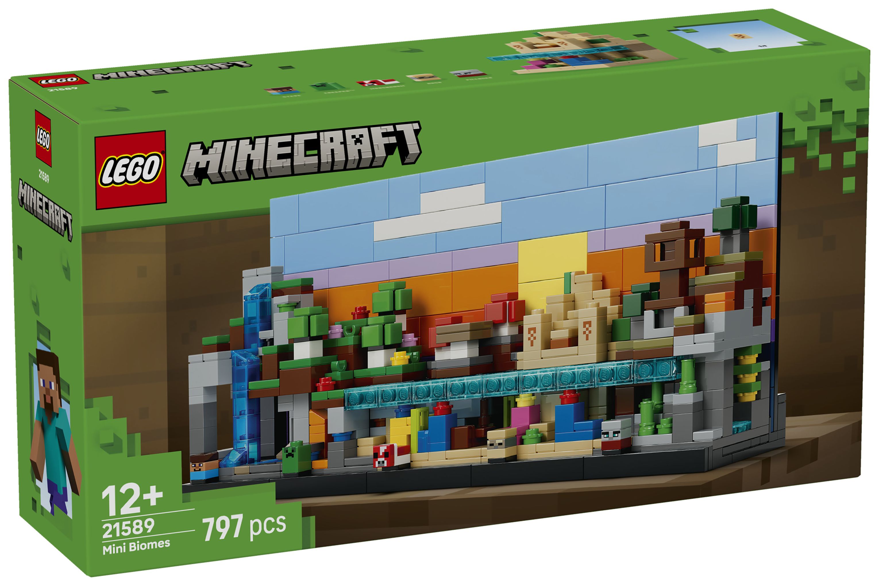 LEGO® Minecraft® Mini-Biome (21589) ist ein Bauset, das Jungen und Mädchen ab 12 Jahren legendäre Minecraft-Deko feiern lässt. Minecraft-Spieler können allen ihre Begeisterung für das Videospiel zeigen, und zwar mit 5 Spielzeugbiomen und 5 Mikrofiguren: Steve, Creeper™, Pilzkuh, Wüstenzombie und Plünderer.