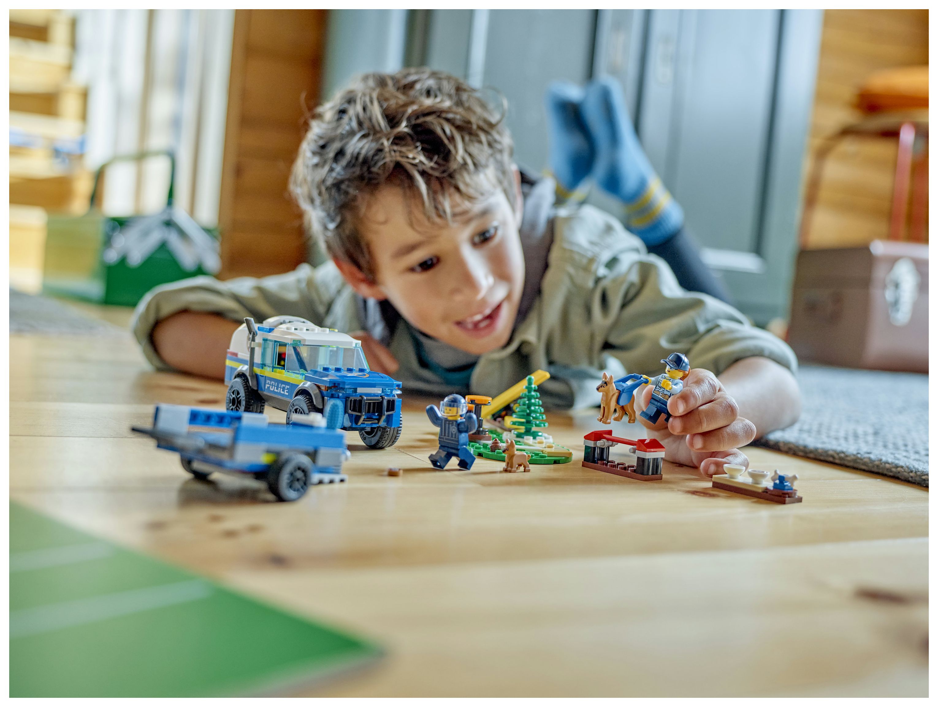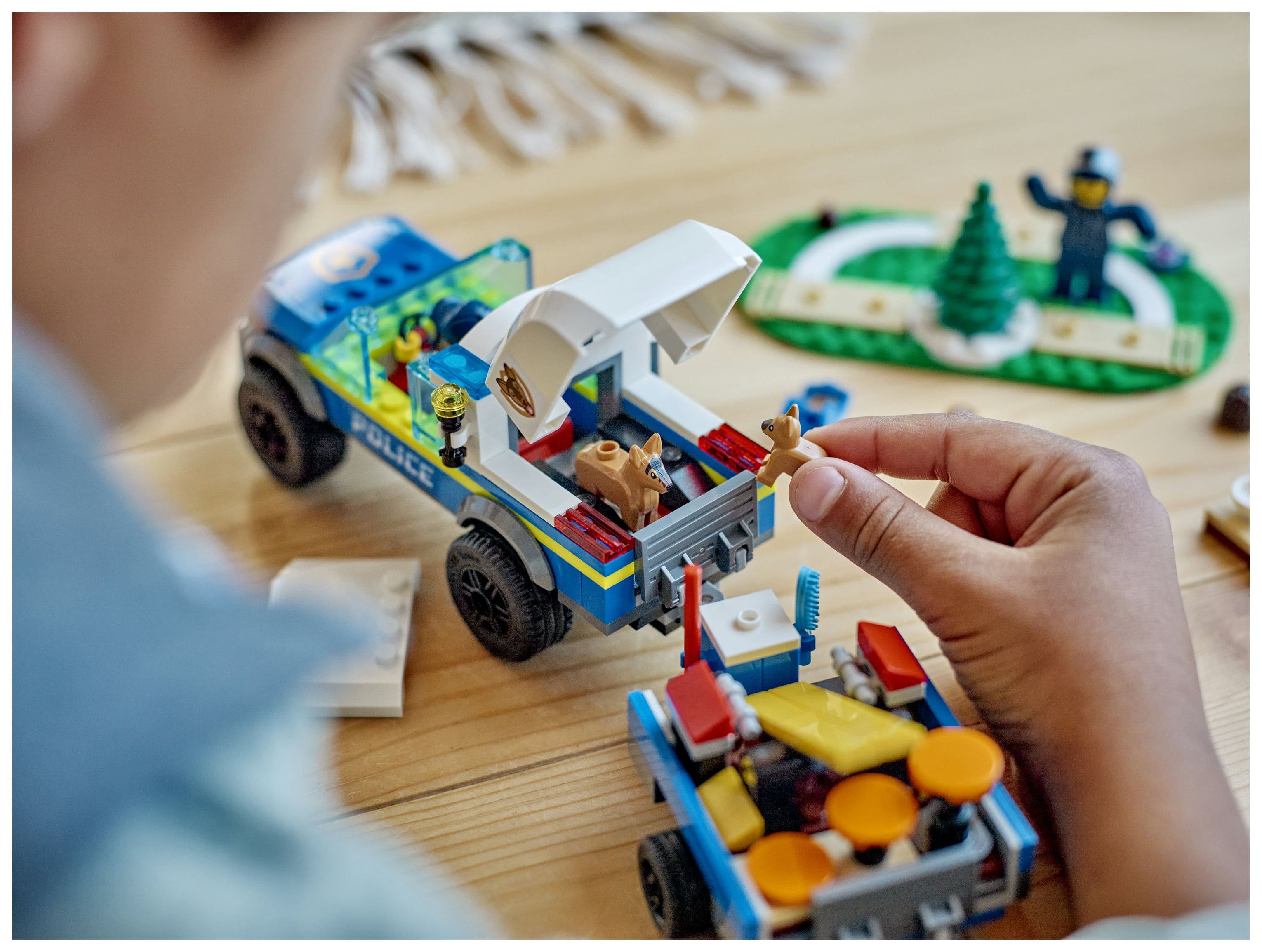 Inhalt der Box: Alles, was Kinder brauchen, um das SUV der Hundestaffel, den Anhänger, 3 Geräte fürs Hundetraining und den Hundetrainingsplatz zu bauen. Auch 2 Minifiguren, ein Polizeihund und ein Welpe laden zum Spielen ein