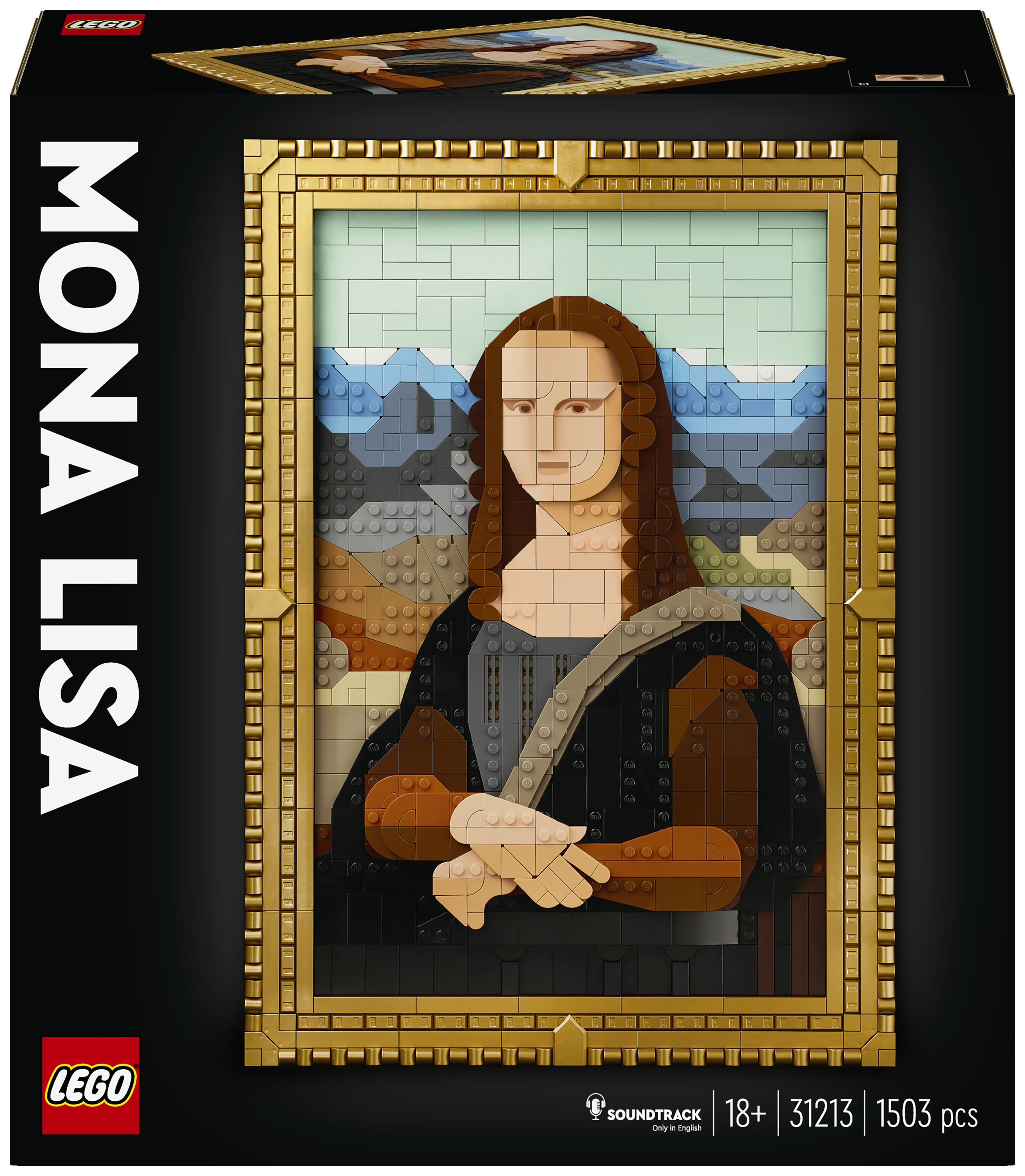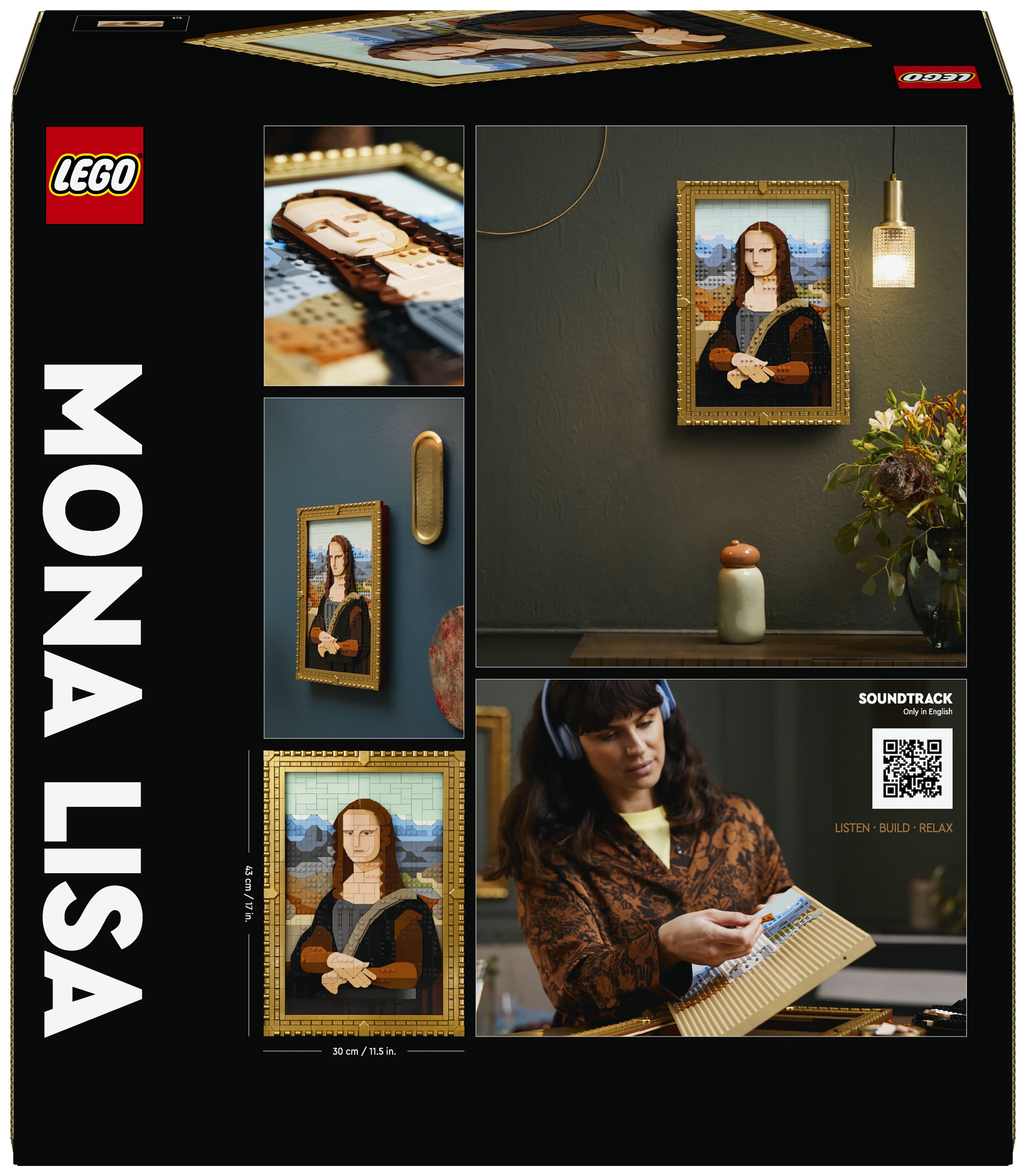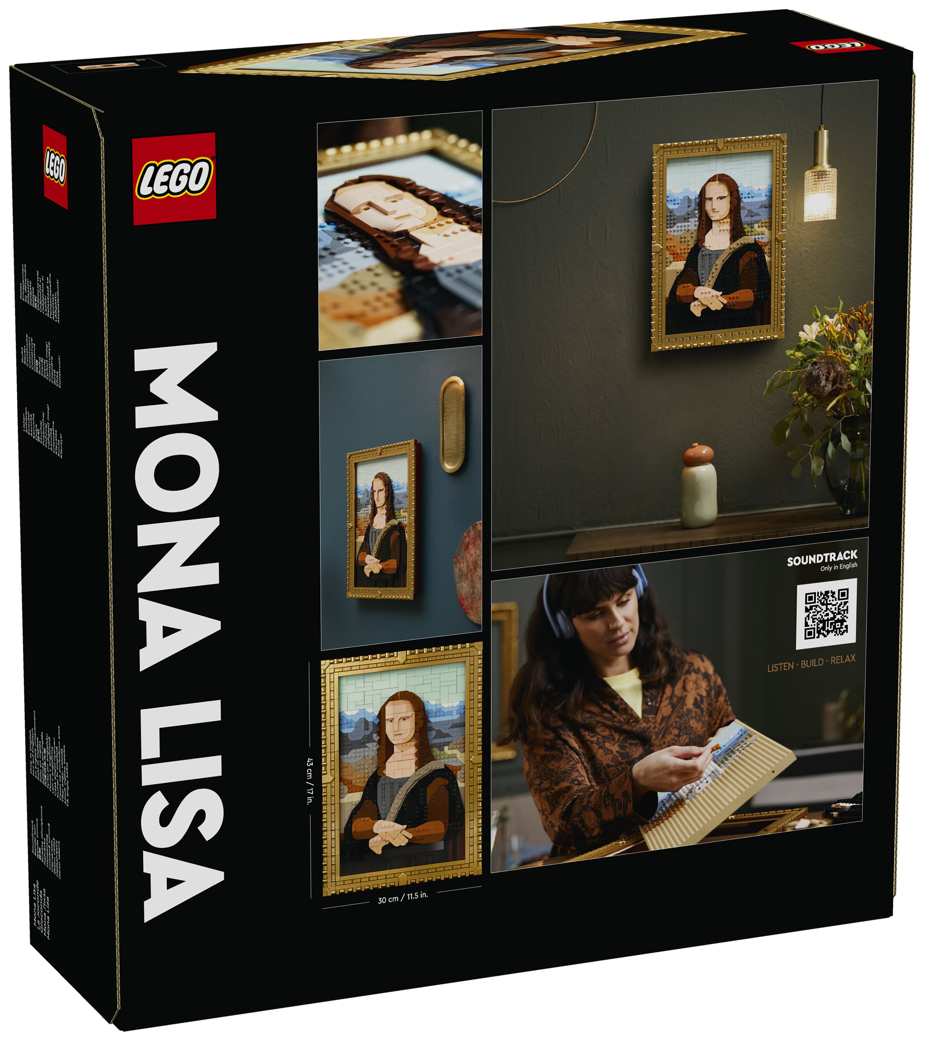 Die Mona Lisa kann in ihrem goldenen Rahmen an der Wand aufgehängt werden. Der Rahmen lässt sich aber auch von dem Gemälde trennen, um andere LEGO Art Werke aus einer bereits vorhandenen Kollektion darin zu präsentieren. Diesem LEGO Set für Erwachsene liegt auch eine Broschüre mit Bauanleitung bei. Du musst nur den QR-Code scannen, um dir den Soundtrack anzuhören und faszinierende Fakten zum zeitlosen Reiz der Mona Lisa zu erfahren.