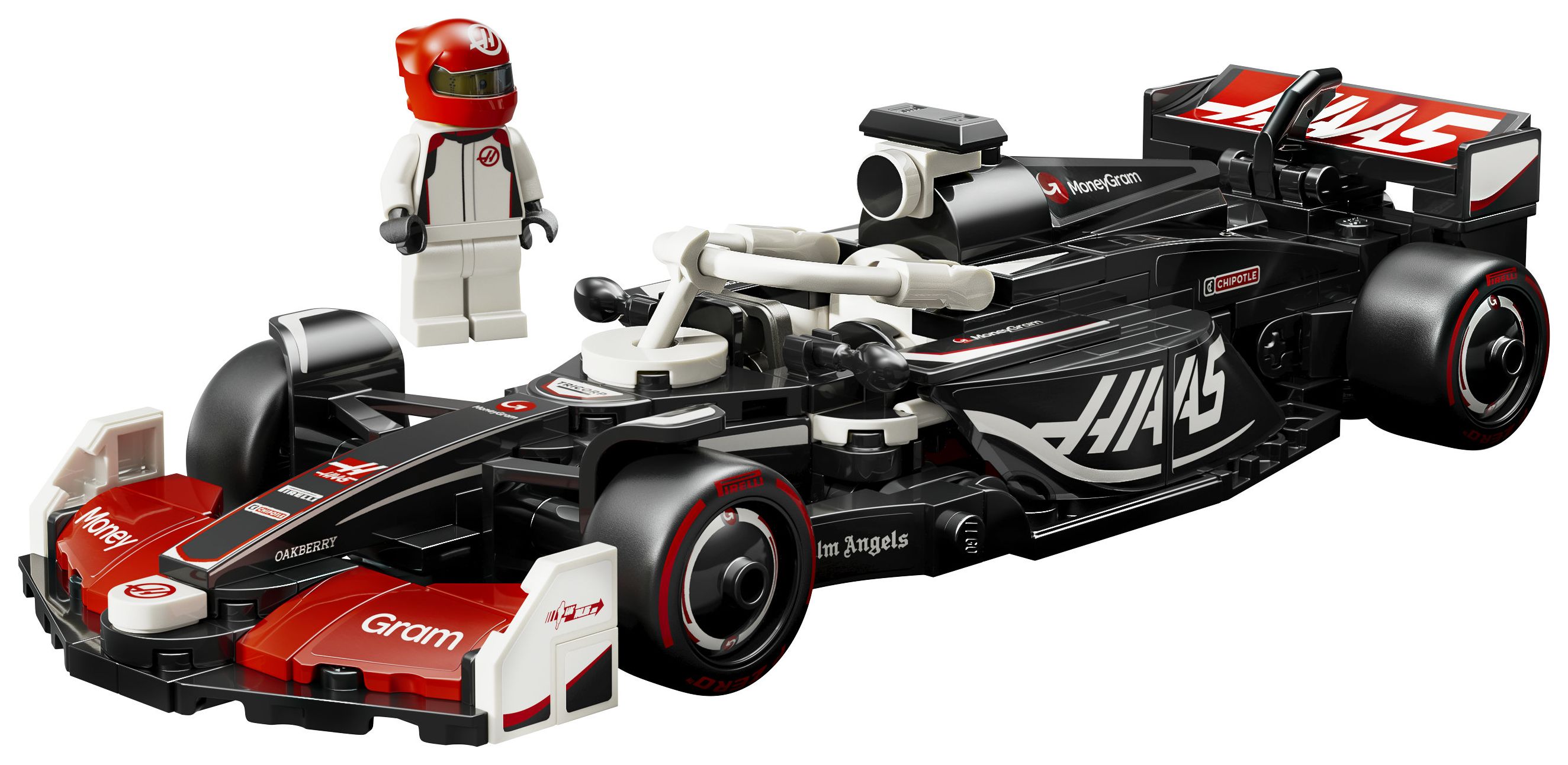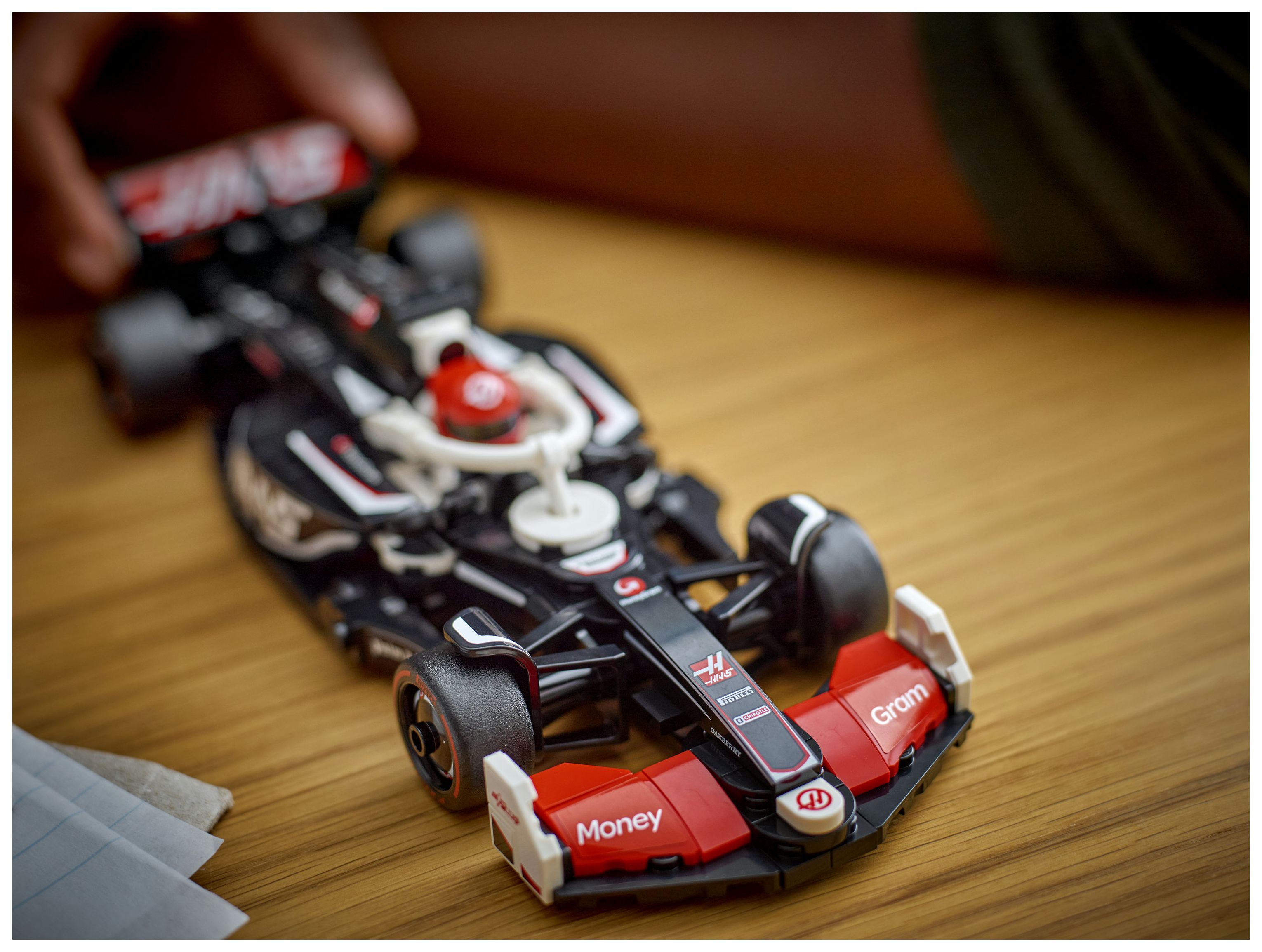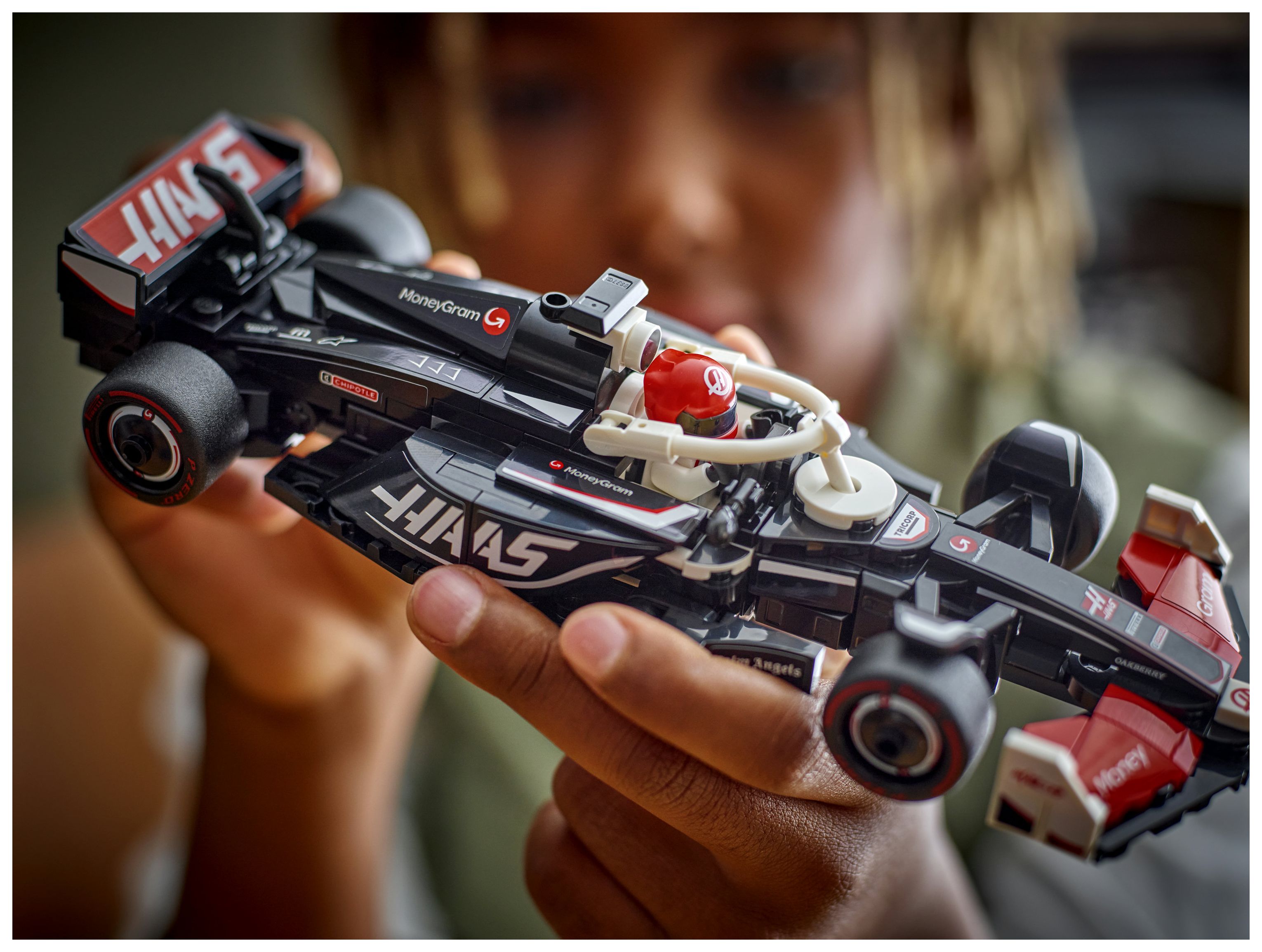Das Modell des F1-Rennautos hat ein Cockpit, das sich öffnen lässt, indem man den Halo-Bügel hochklappt, einen Heckflügel, einen Querlenker, Sponsorenaufkleber und breitere Hinterreifen mit dem Aufdruck „Pirelli“. Zu dem F1-Rennauto gehört auch eine Rennfahrer-Minifigur mit Helm und im Rennoverall des MoneyGram Haas F1 Teams, die man fürs Rennen ins Cockpit setzen kann.