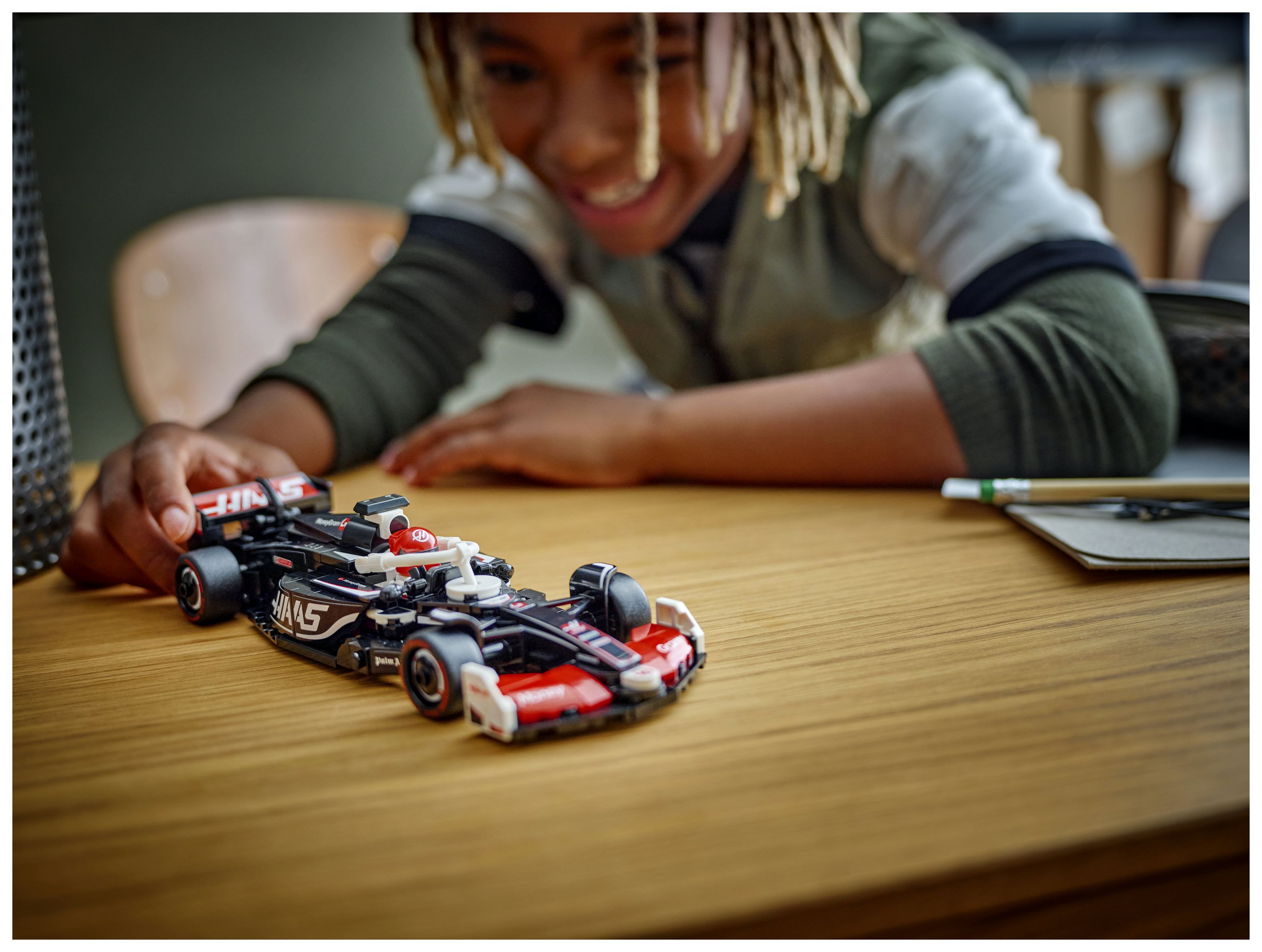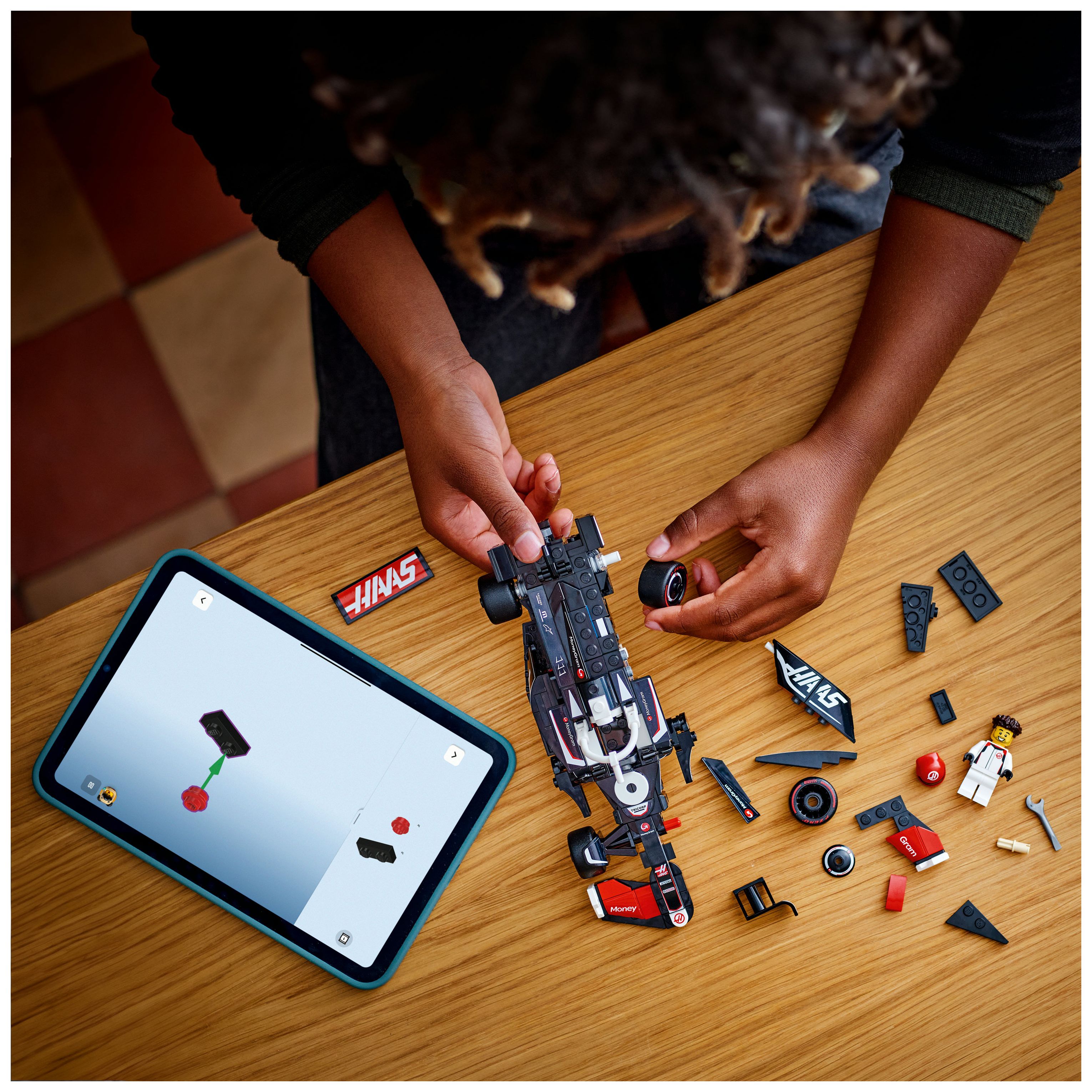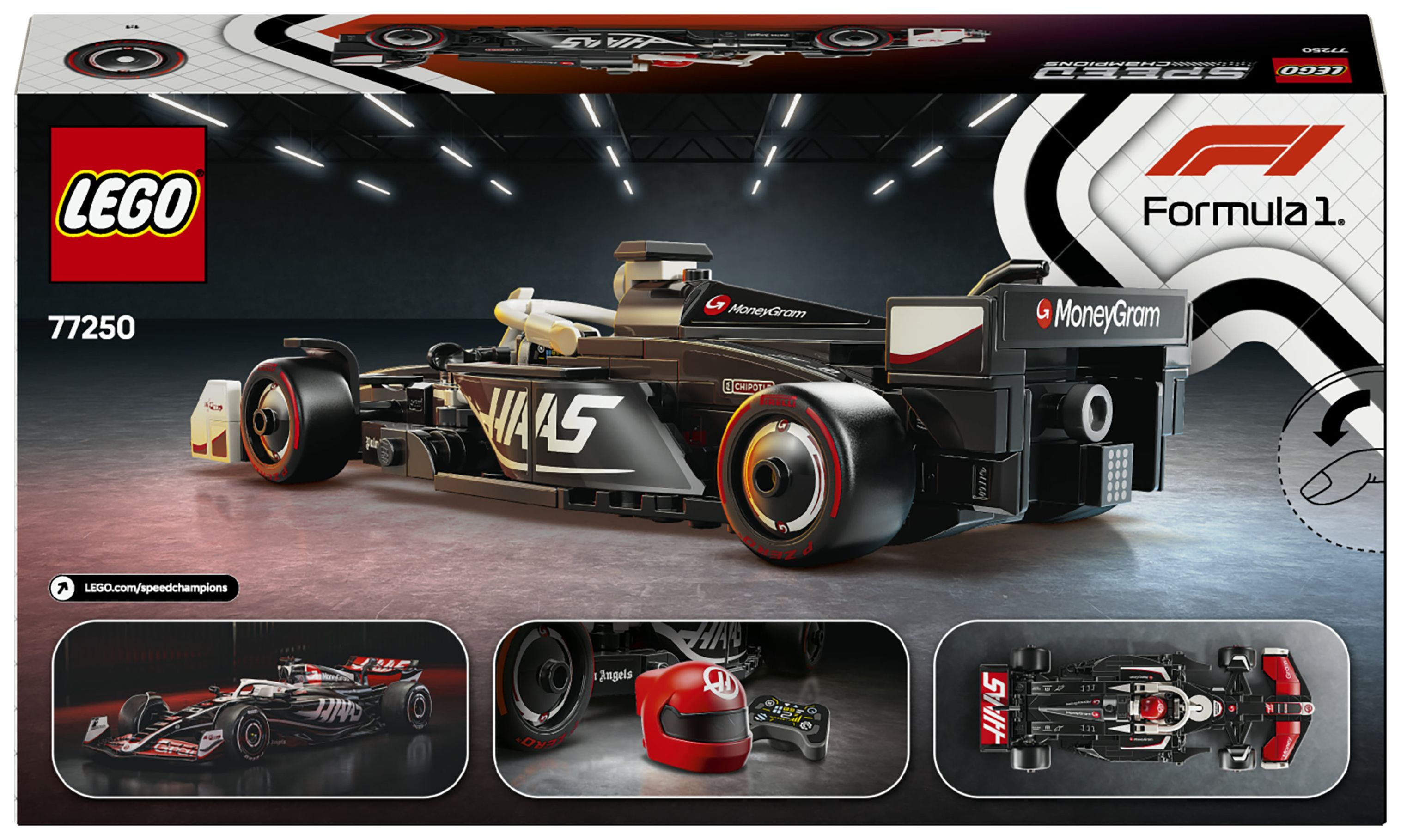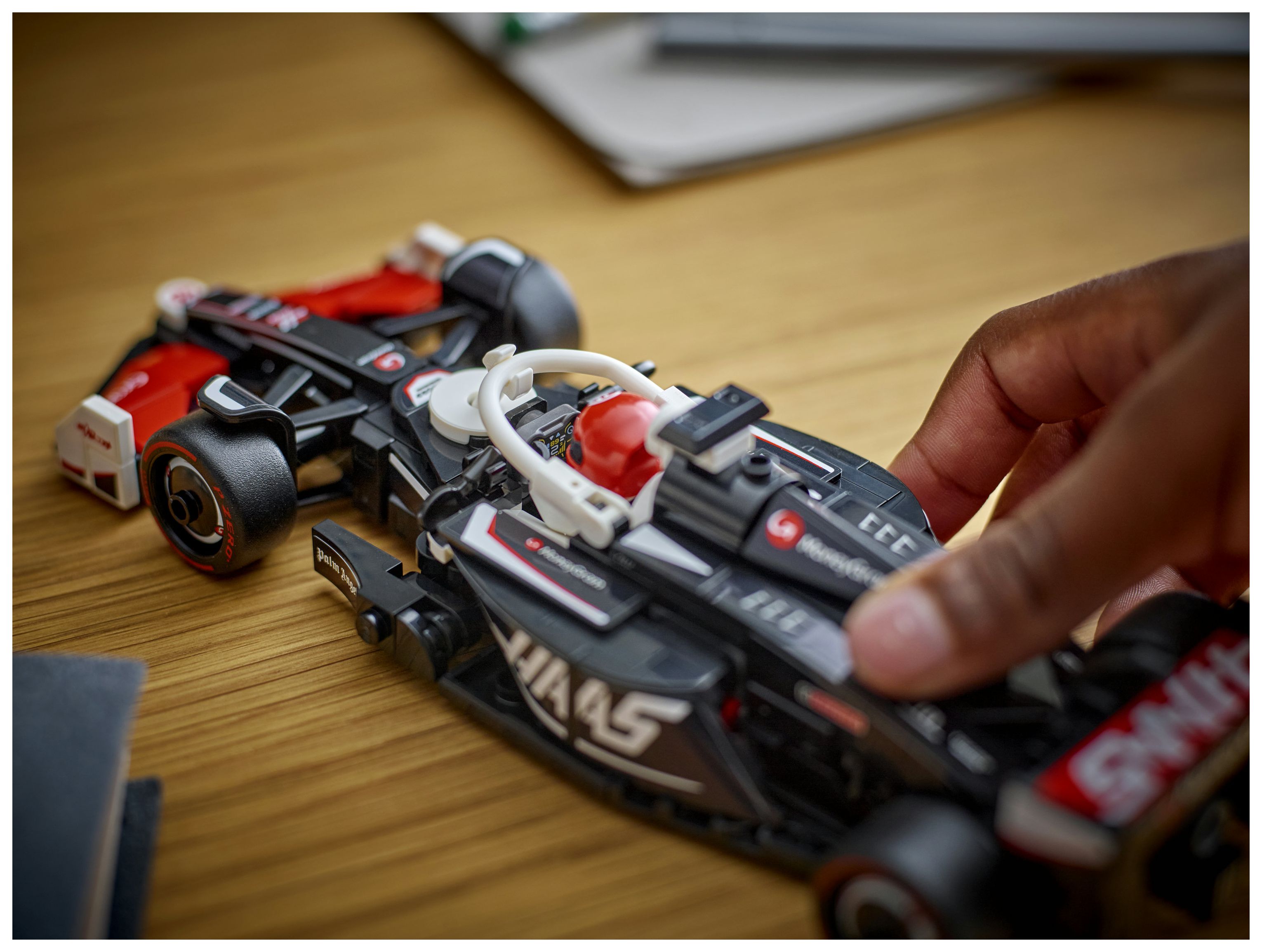 Das Modell des F1-Rennautos hat ein Cockpit, das sich öffnen lässt, indem man den Halo-Bügel hochklappt, einen Heckflügel, einen Querlenker, Sponsorenaufkleber und breitere Hinterreifen mit dem Aufdruck „Pirelli“. Zu dem F1-Rennauto gehört auch eine Rennfahrer-Minifigur mit Helm und im Rennoverall des MoneyGram Haas F1 Teams, die man fürs Rennen ins Cockpit setzen kann.