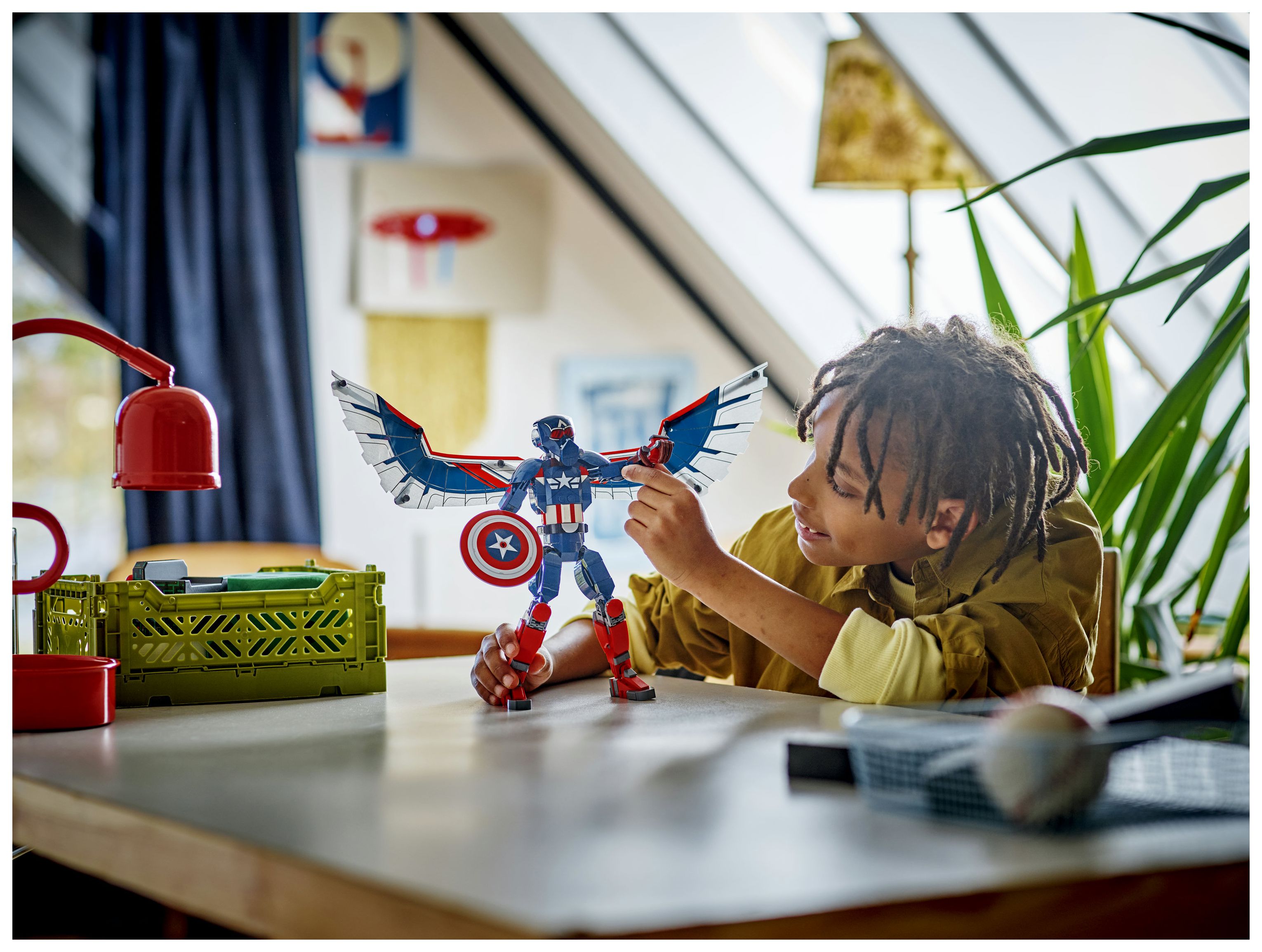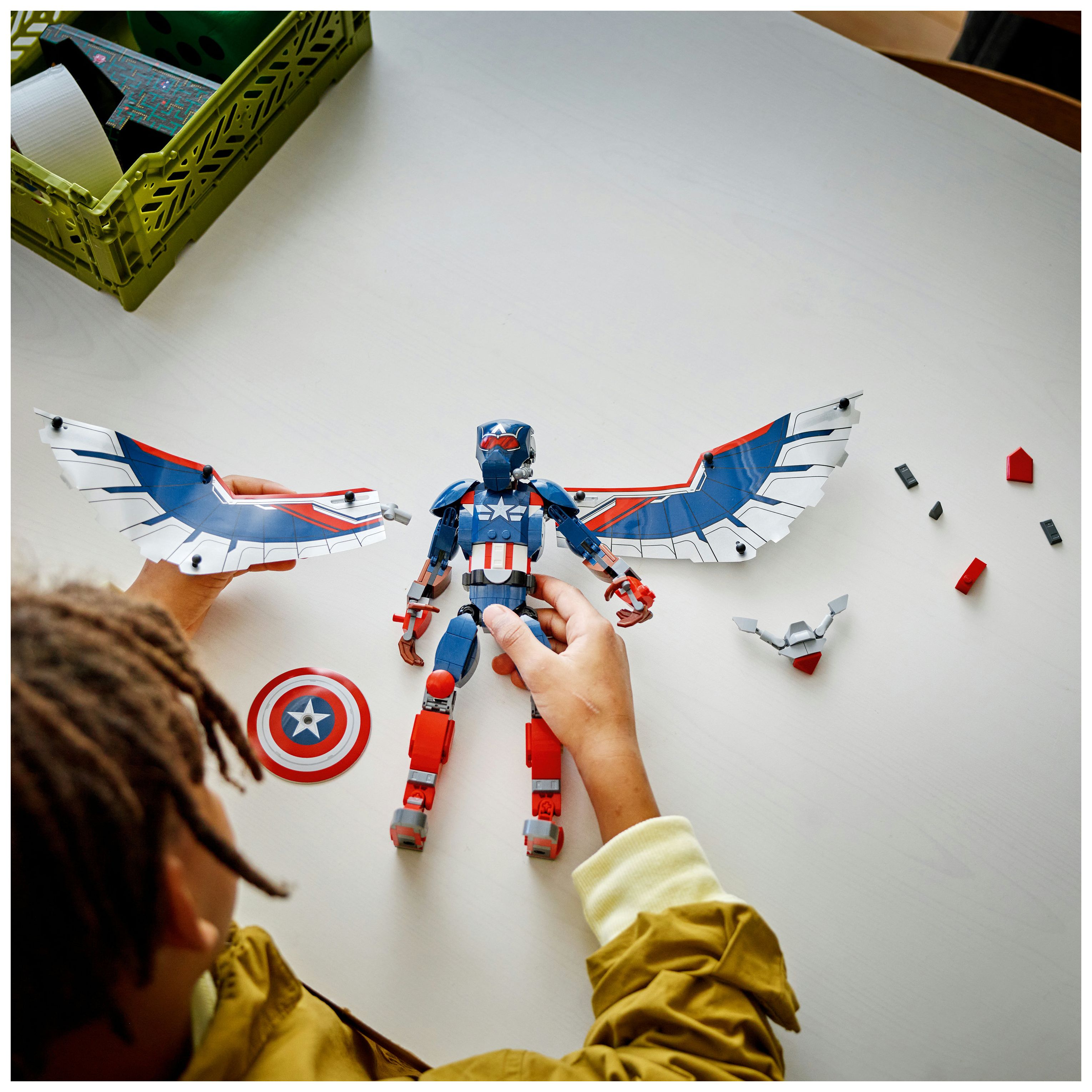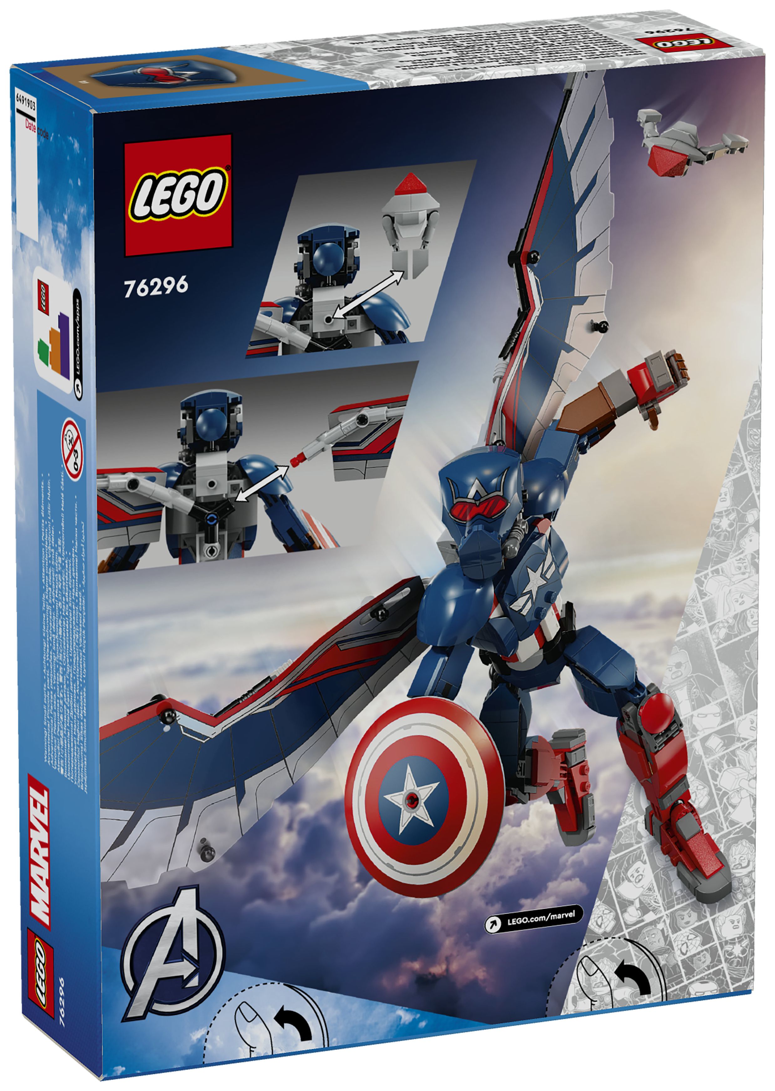 Der baubare Spielzeug-Superheld ist 28 cm groß und hat bewegliche Gelenke an Schultern, Armen, Hüften und Beinen, damit Kinder ihn bei ihren fantasievollen Rollenspielen in wirklichkeitsgetreue Actionposen bringen können. Am Rücken der Figur sind große Folienflügel befestigt. Die Flügel kann man biegen, um sie schlagen zu lassen. Und wenn dann am Boden weitergekämpft wird, nimmt man die Flügel einfach ab. Captain America trägt seinen legendären Schild. An seinem Rücken ist eine baubare Redwing-Drohne befestigt, die man mühelos abnehmen und losfliegen lassen kann. Für zusätzlichen digitalen Bauspaß können Baumeister in der intuitiven LEGO Builder App 3D-Ansichten des Modells vergrößern und drehen und ihren Baufortschritt verfolgen.