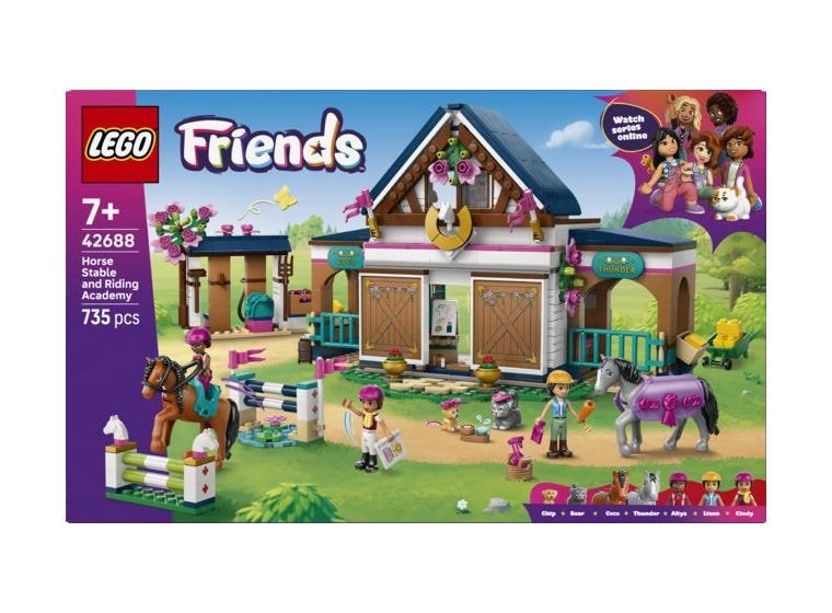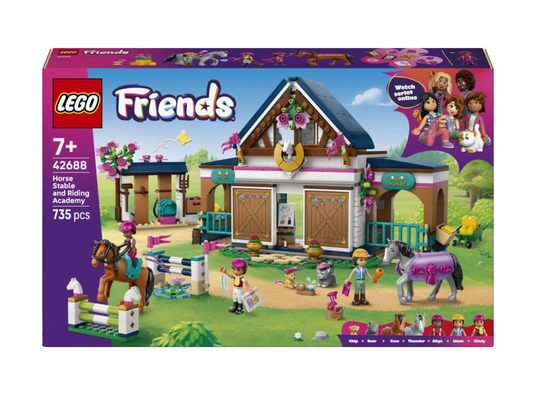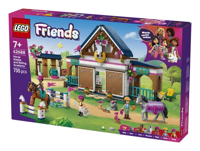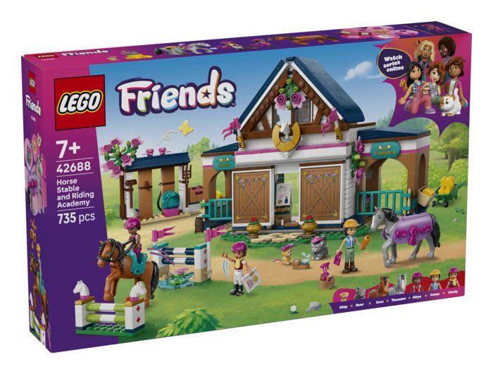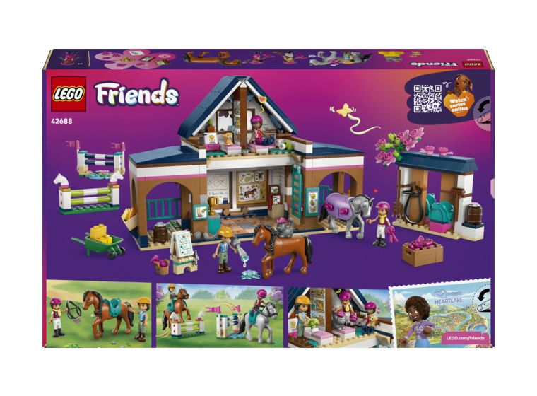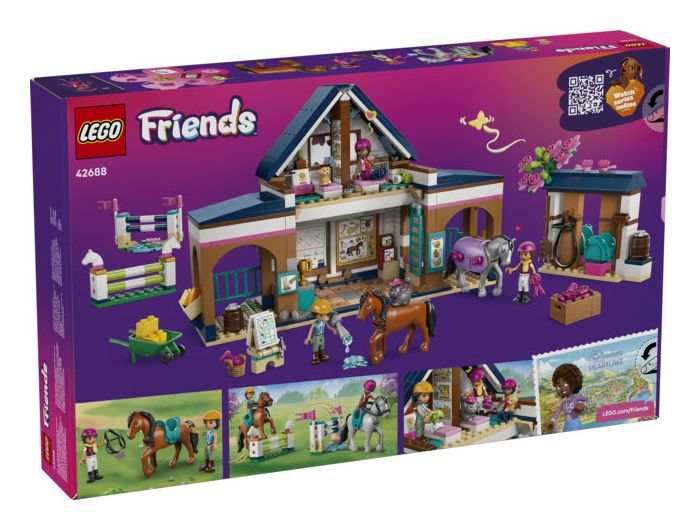 LEGO® Friends Pferdestall und Reitschule (42688) bietet Kindern ab 7 Jahren jede Menge Spielspaß und Pferdeabenteuer mit und ohne Sattel. Liann und Aliya nehmen Reitstunden bei der Reitlehrerin Cindy und lernen, wie man Pferde versorgt und pflegt. Sattle die beiden Pferde und spring über die Hindernisse. Probier verschiedene Aufgaben aus: Transportiere das Heu mit der Schubkarre oder putze und füttere die Pferde. Nach dem aufregenden Tag kannst du in den gemütlichen Betten über dem Stall übernachten.