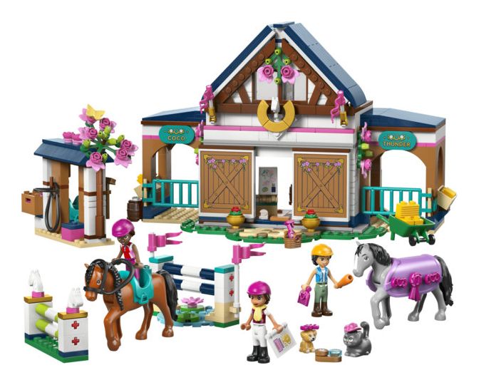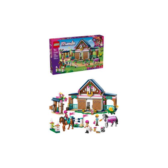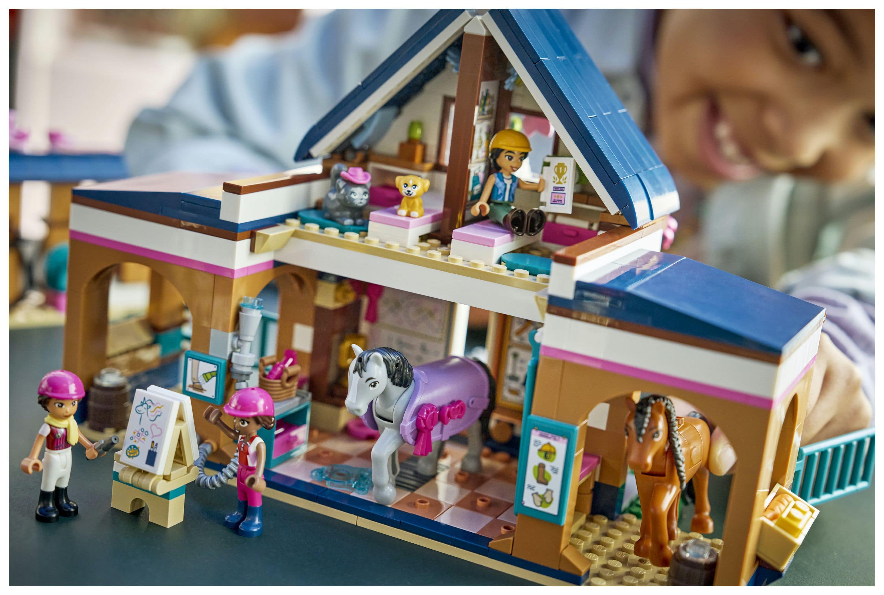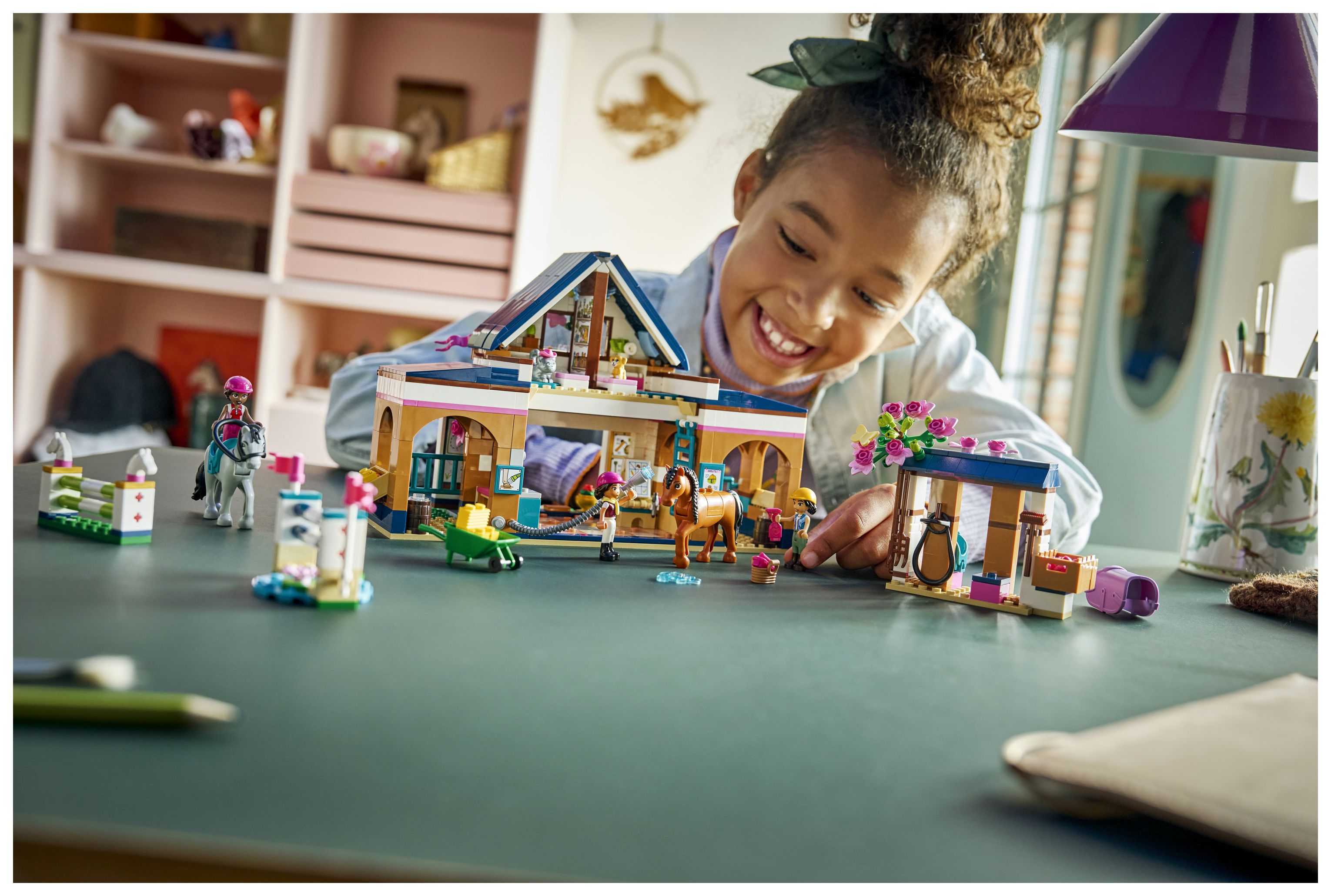 LEGO® Friends Pferdestall und Reitschule (42688); Spielset mit 3 Spielfiguren, 2 Pferden, Katze, Hund, Sätteln und Hindernissen; Geburtstagsgeschenk für Pferdefans und Kinder ab 7 Jahren