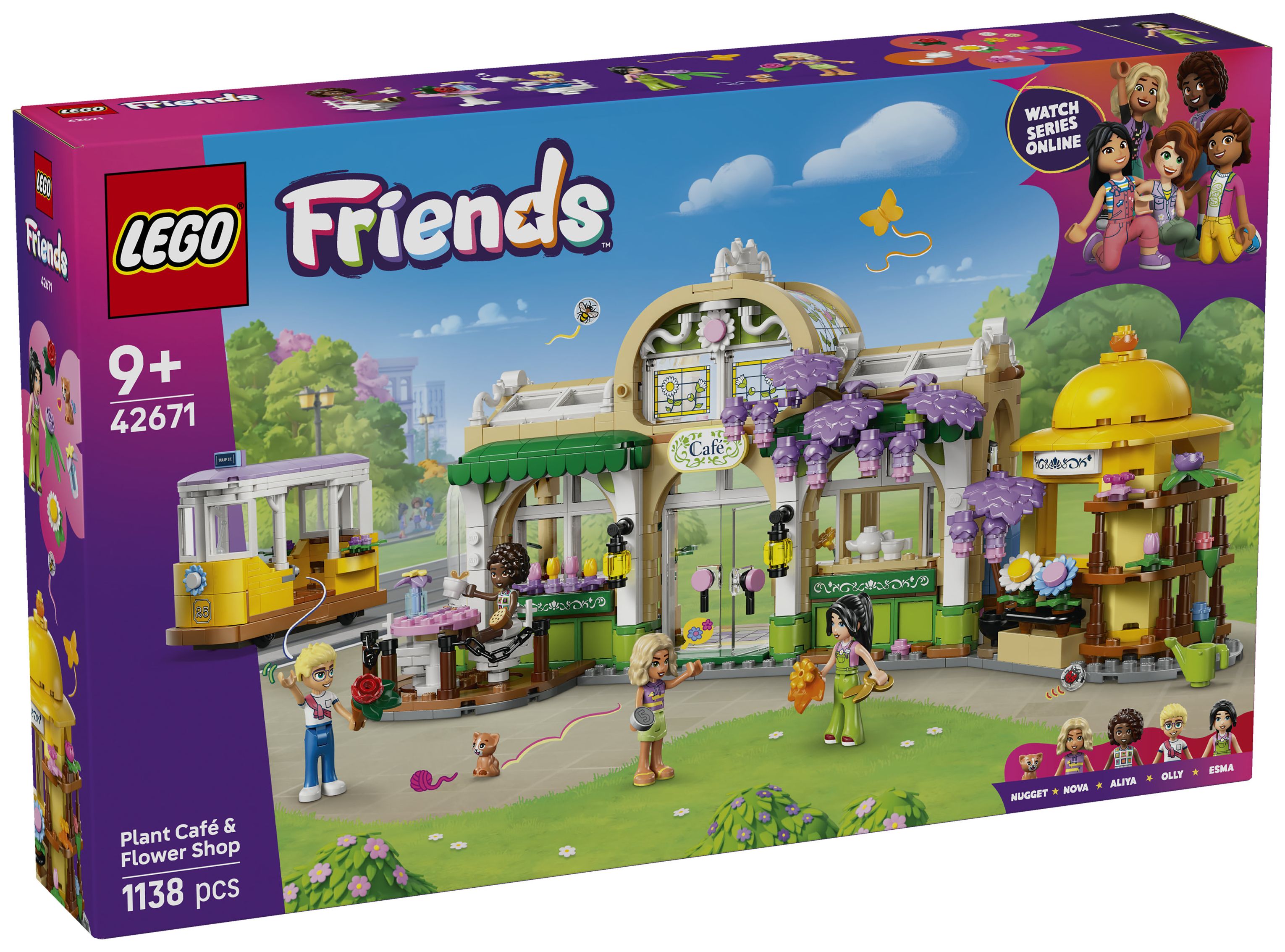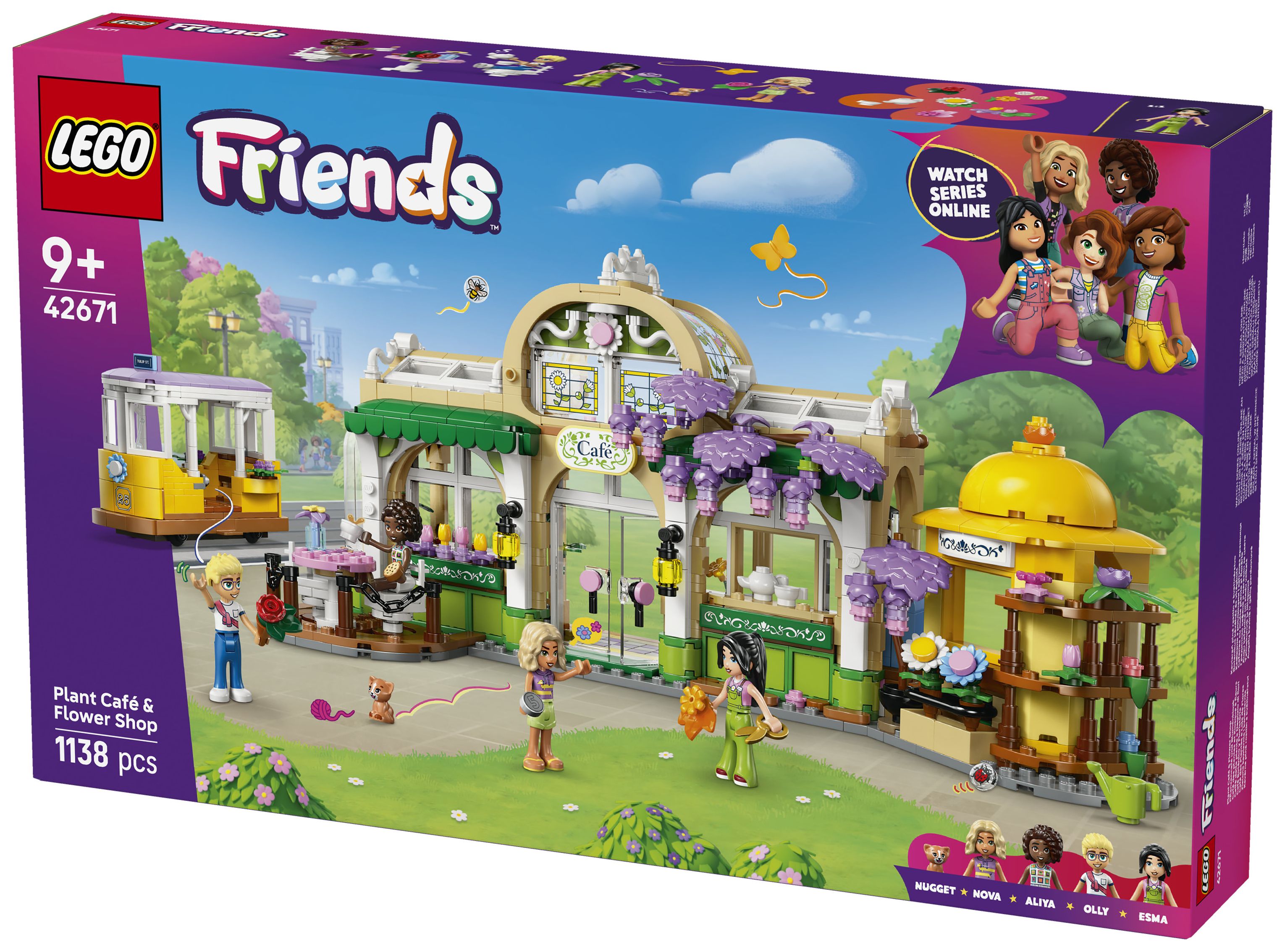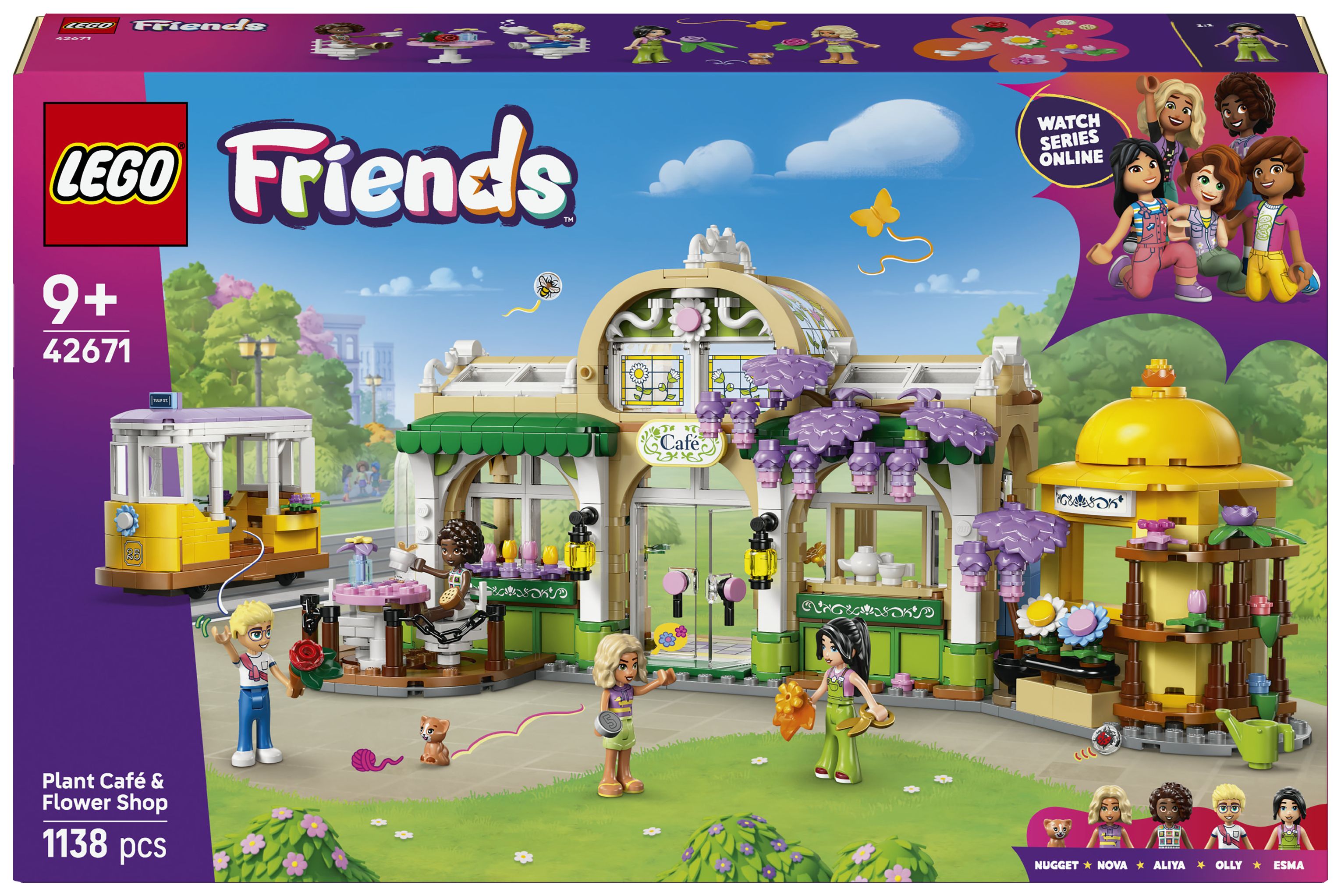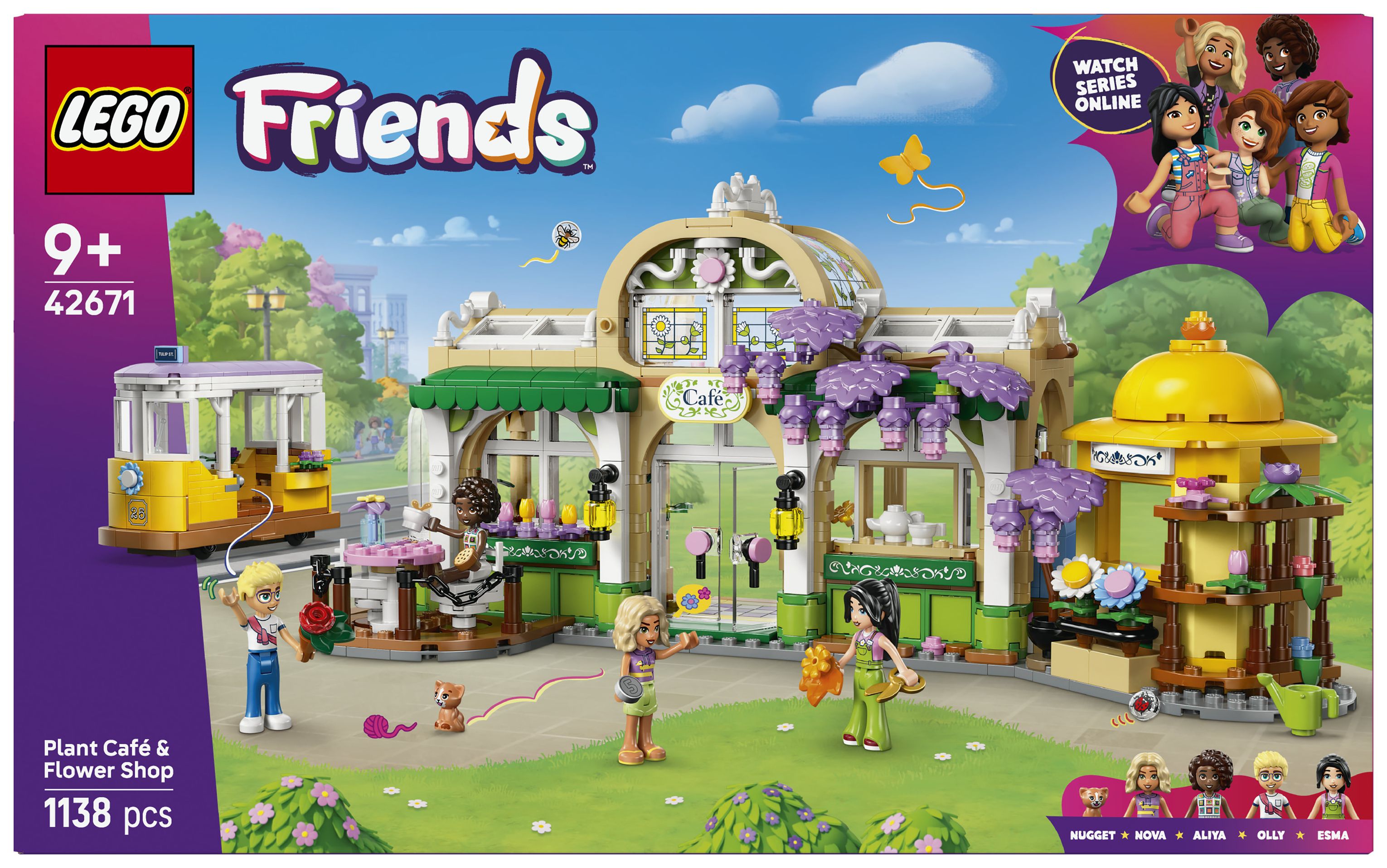 Entdecke überall in diesem Set schöne Blumen und Pflanzen. Das Set stellt die Geschichte von Aliya, Olly, Nova, Esma und der Katze Nugget dar, die sich gern im Pflanzencafé und Blumenkiosk treffen. Viele Funktionen inspirieren Kinder zu kreativen Geschichten. Die Charaktere können mit der süßen Straßenbahn fahren. Vor dem Café kann man sich auf die Terrasse setzen, und in der Küche gibt es eine Kaffeemaschine. Am Blumenkiosk kann man Blumensträuße und Topfpflanzen kaufen. Nach dem Spielen kann man das Modell ausstellen, um sich jeden Tag an den Blumen zu erfreuen.