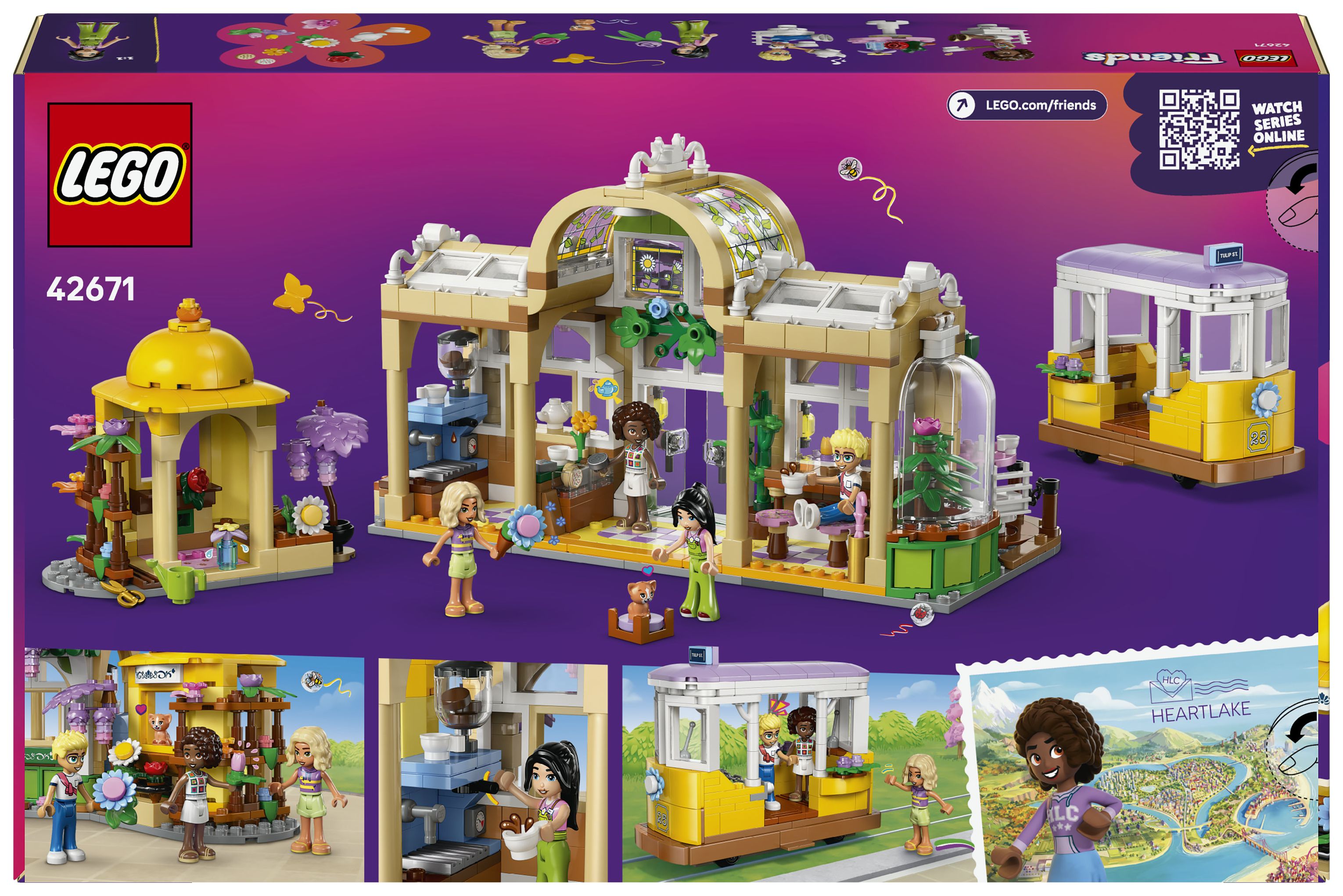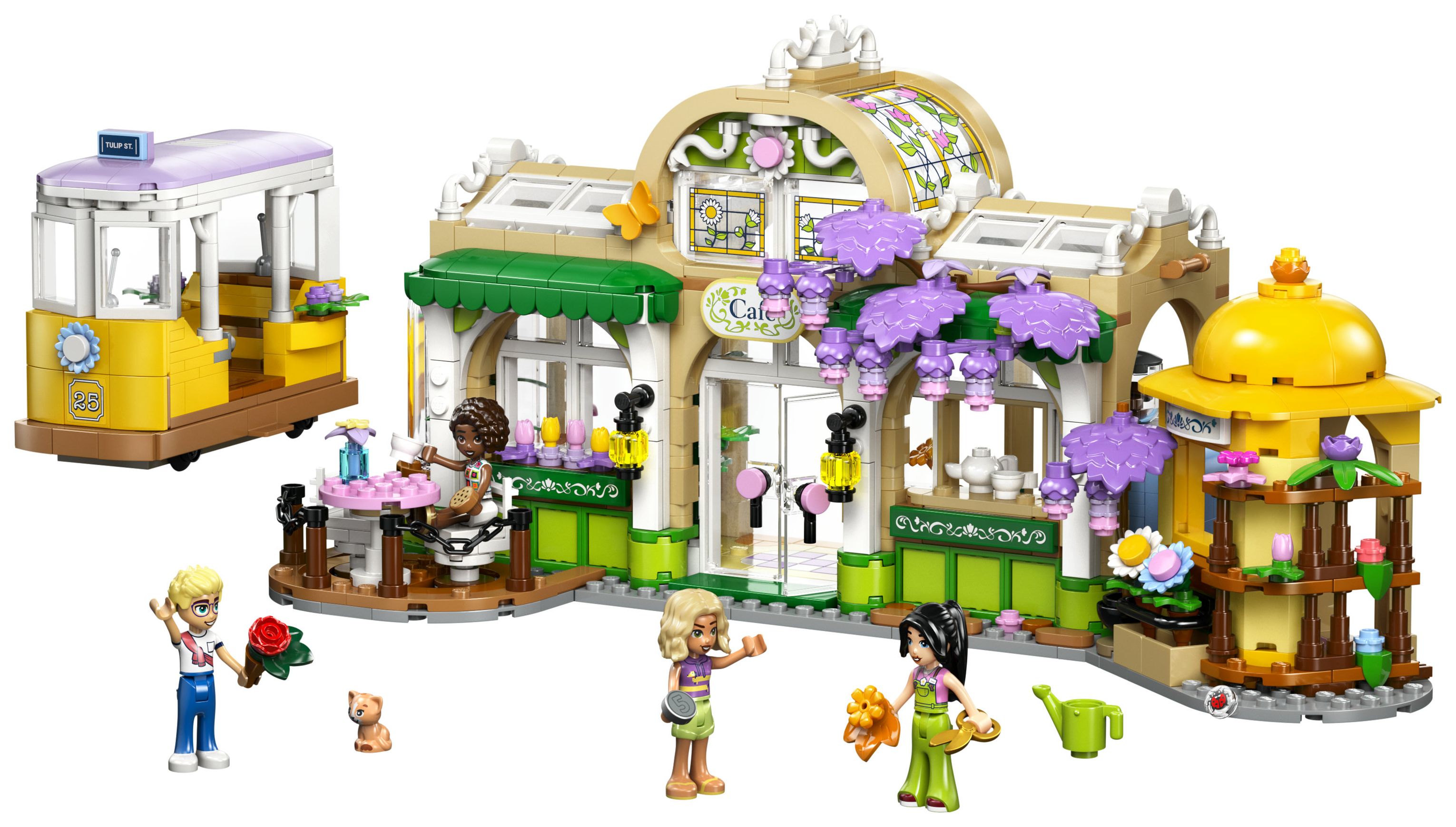 LEGO® Friends Pflanzencafé und Blumenkiosk (42671); Bau- und Spielset für Rollenspiele; Geschenk für Mädchen und Jungen ab 9 Jahren; 4 Spielfiguren, eine Straßenbahn und Zubehör