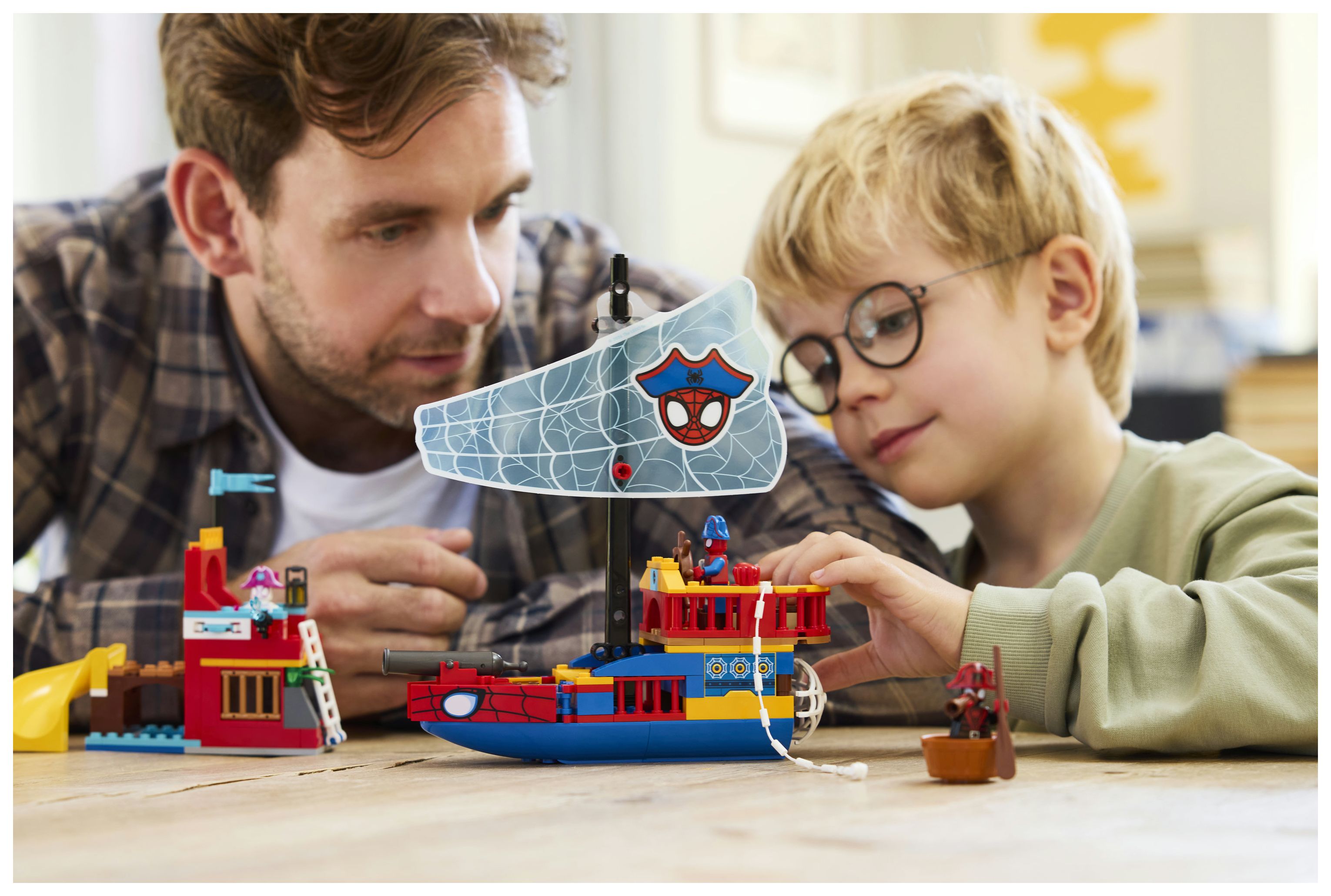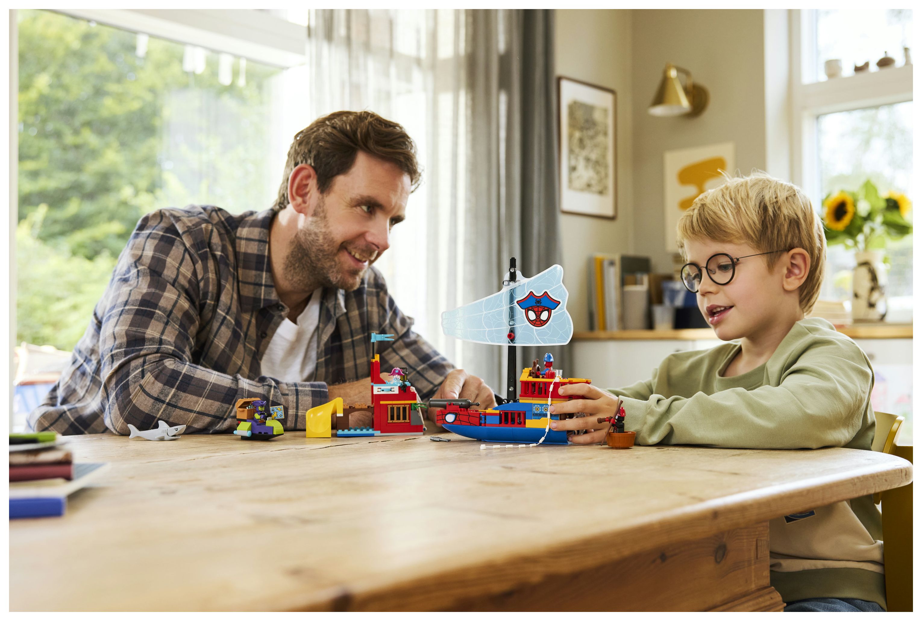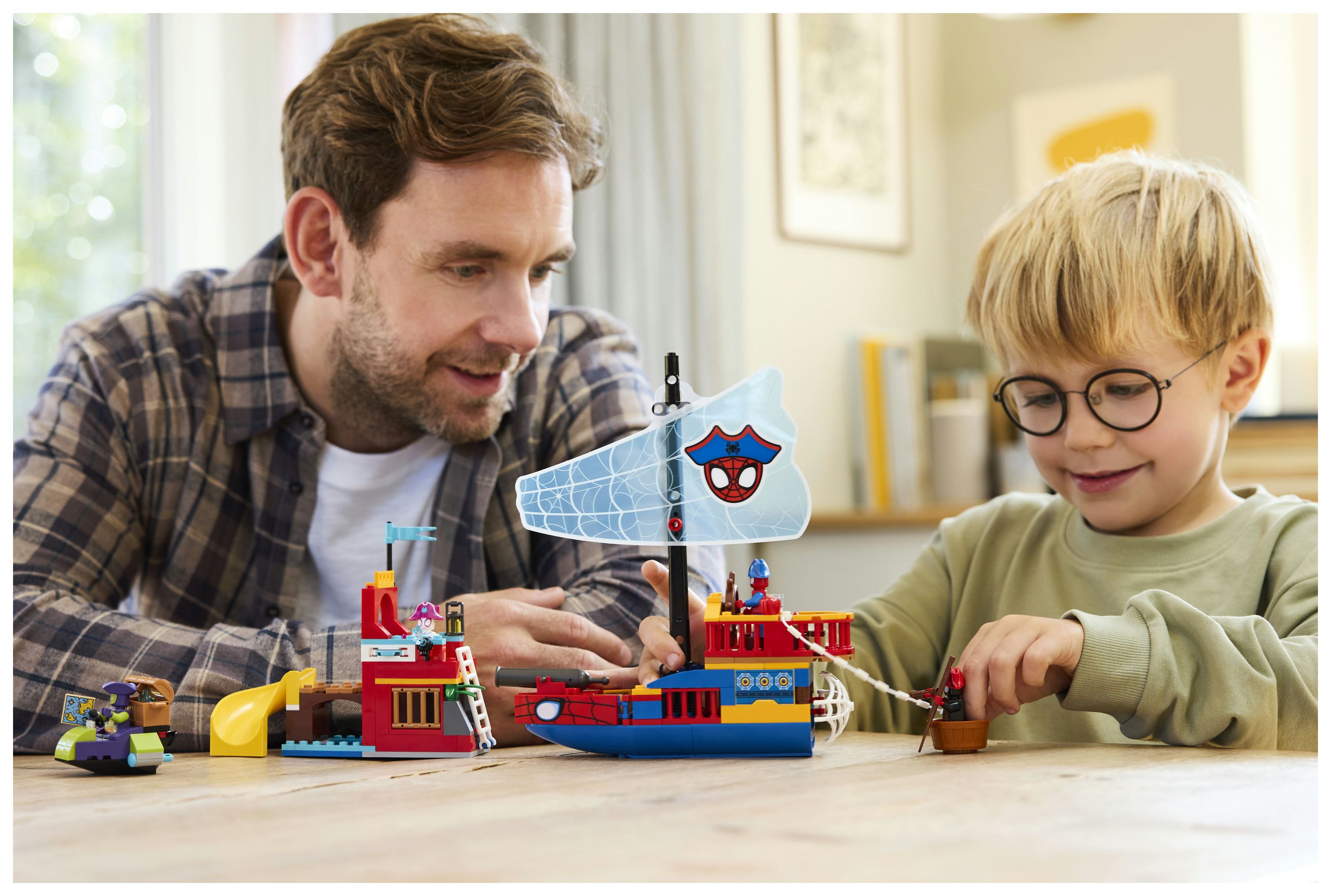 Das Spidey-Bauspielzeug strotzt nur so vor Funktionen. Ein Piratenschiff, Spider Island mit Rutsche, Green Goblins Schiff und ein kleineres Boot laden zum Spielen ein. Eine Kanone auf dem Piratenschiff, ein Scheibenkatapult auf der Insel und Shooter auf Green Goblins Schiff bieten jede Menge Actionspaß. Mit Spideys Netzseil kann man Fische, eine Schatztruhe oder Green Goblins Schiff fangen. Für Bauspaß und einen raschen Bauerfolg beinhaltet das Geschenk für Fans von Spidey und seine Super-Freunde bunte Bildanleitungen, ein Starter-Bauelement sowie separate Beutel mit jeweils einem baubaren Modell. Und die LEGO Builder App mit einfachen digitalen Bauanleitungen lässt Kinder 3D-Modelle vergrößern und drehen. Die App zeigt auch, wie weit man mit dem Modell schon ist. Das Bauset besteht aus 201 Teilen.