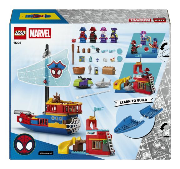 Piratenschiff von Spideys Team (11208) ist ein kreatives Bauspielzeug. Spidey, Green Goblin, Ghost-Spider und Miles „Spin“ Morales lassen Kinder fantasievoll an Bord spielen. Das Bauset lässt Kinder ab 4 Jahren beim Spielen auf dem Schiff und auf Spider Island wichtige Fähigkeiten entwickeln.