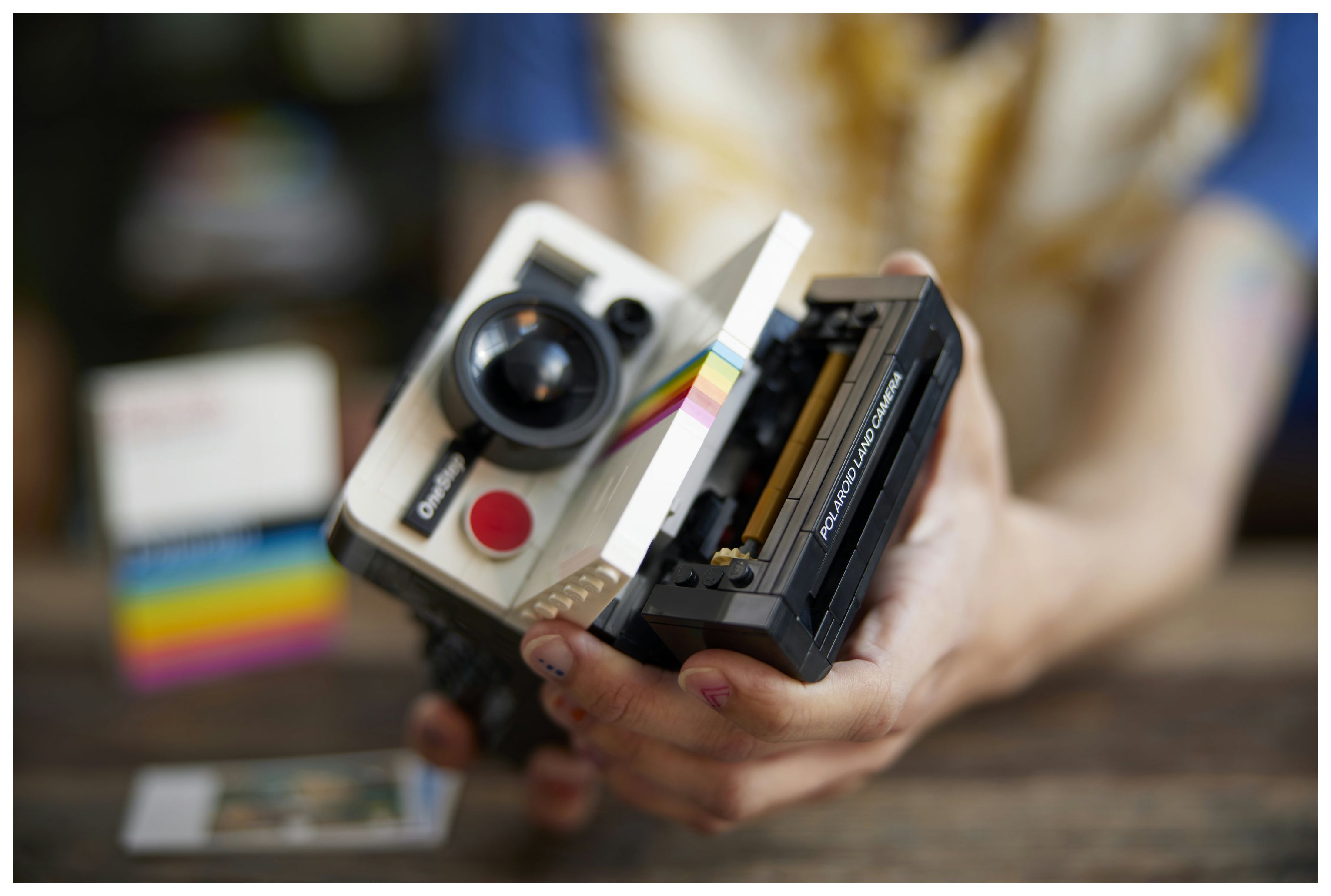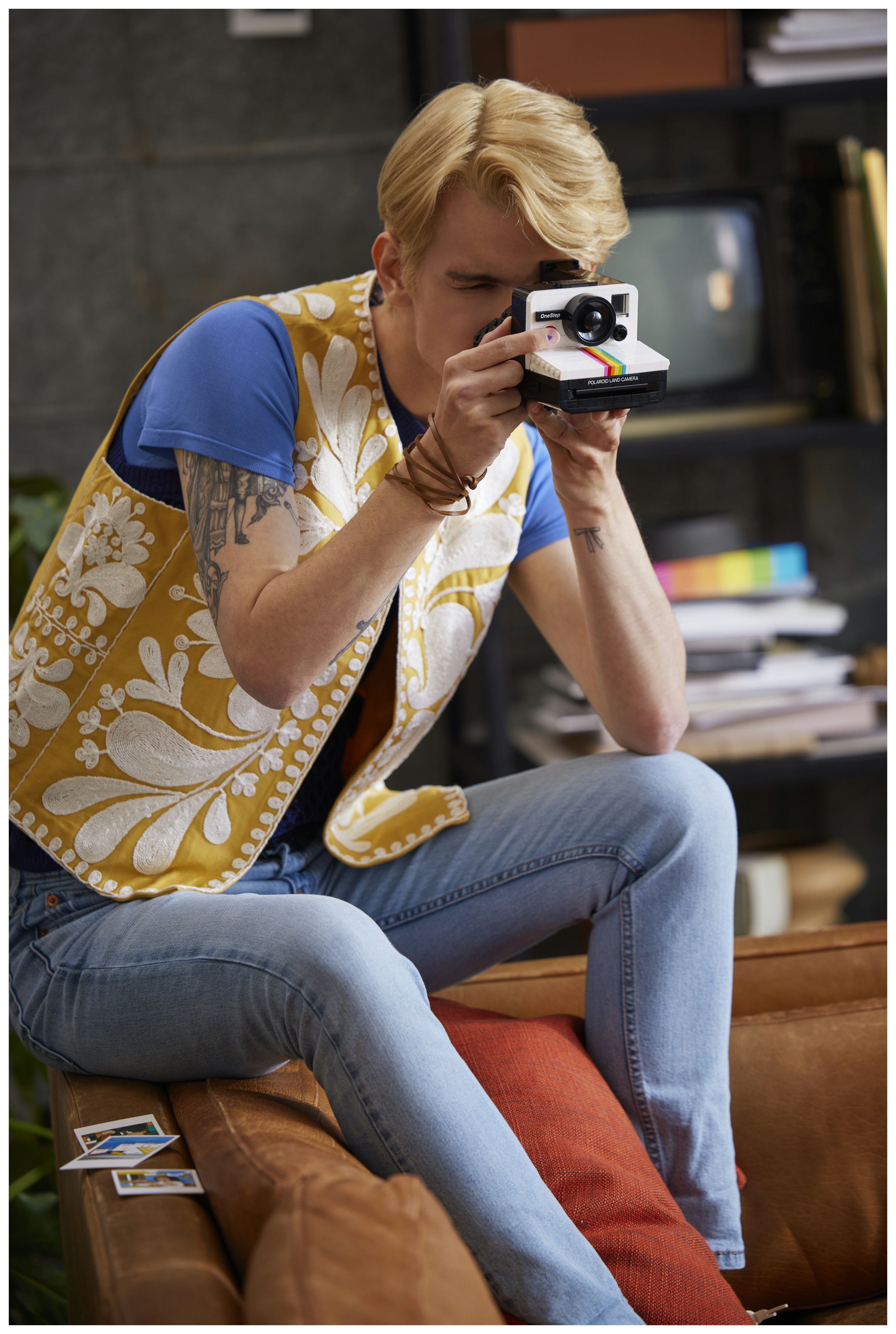 Time-Zero Supercolor SX-70 Land Film Kassette zum Zusammenbauen: Die Kassette enthält 3 Fotos, die den Polaroid-Erfinder Edwin H. Land, LEGO® House und die Schwester des Fandesigners darstellen, die die Idee zu diesem Set lieferte