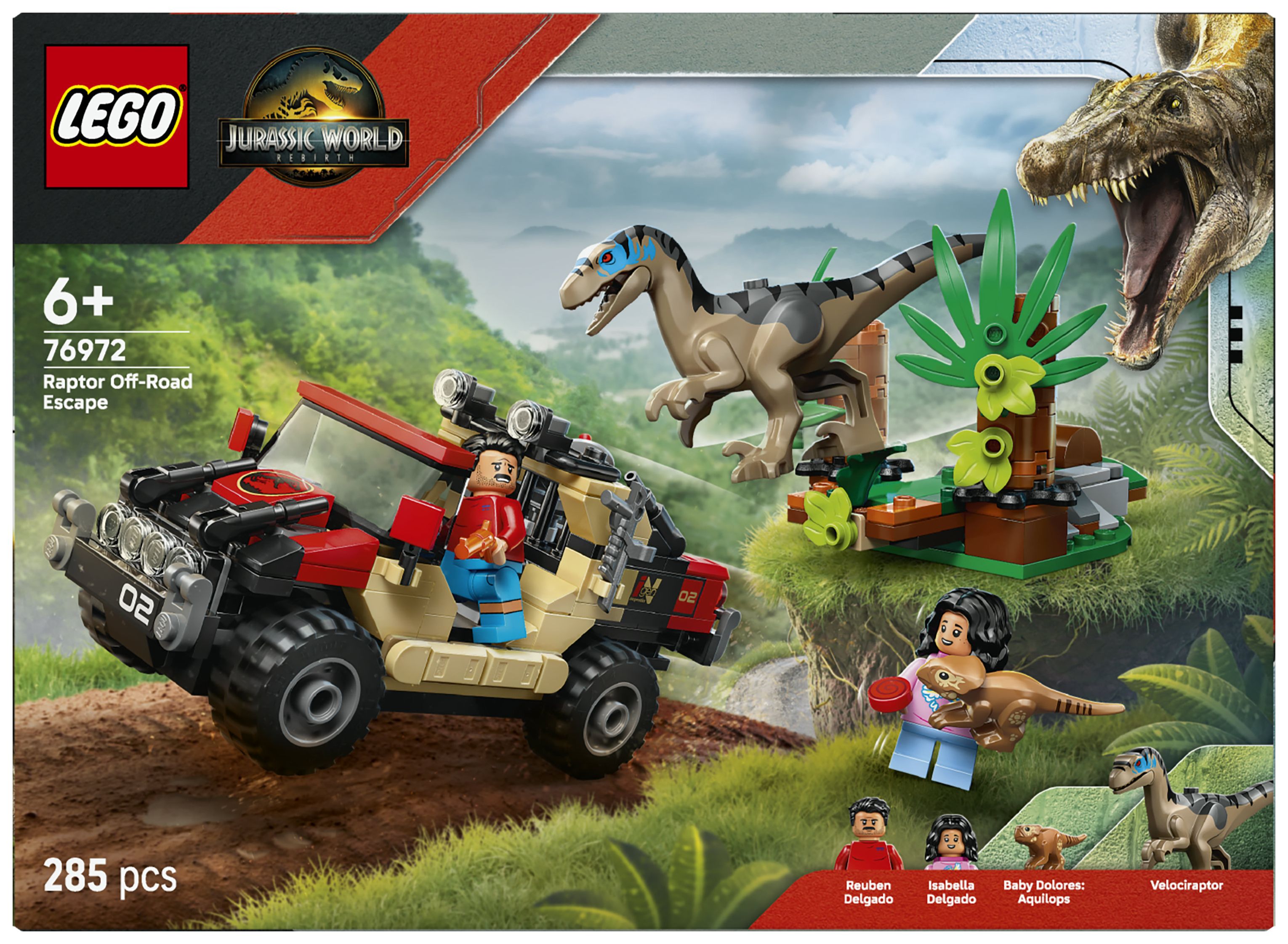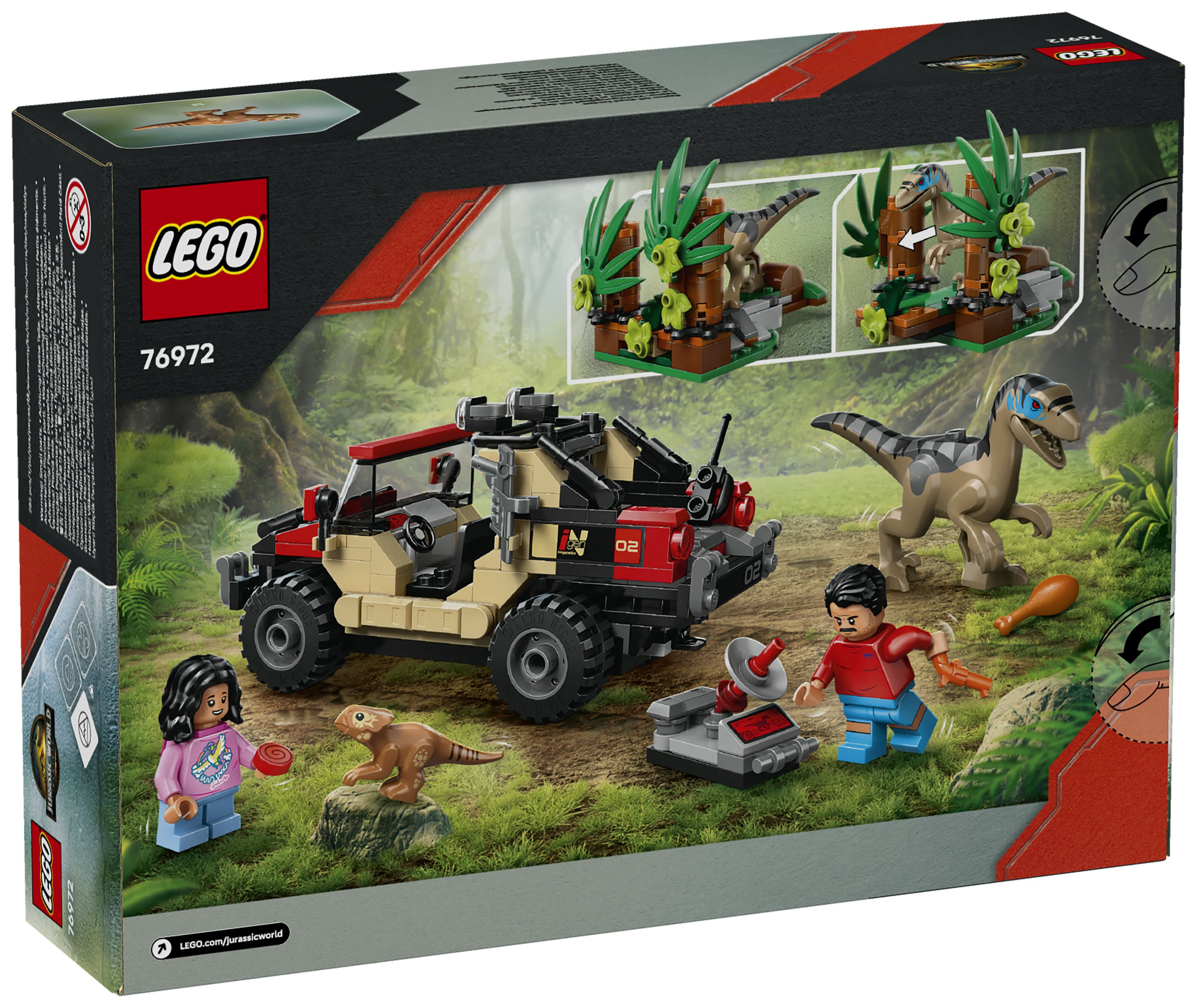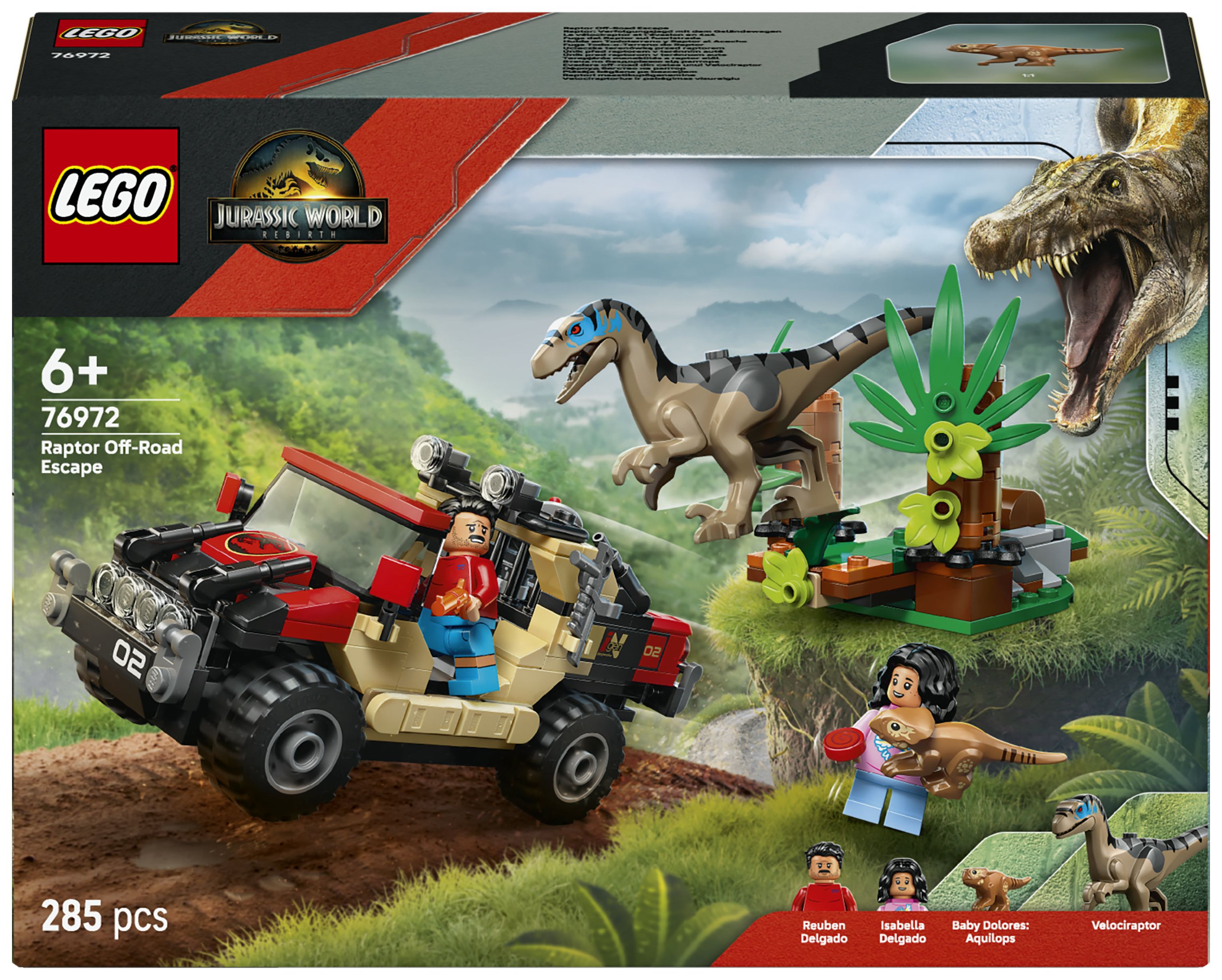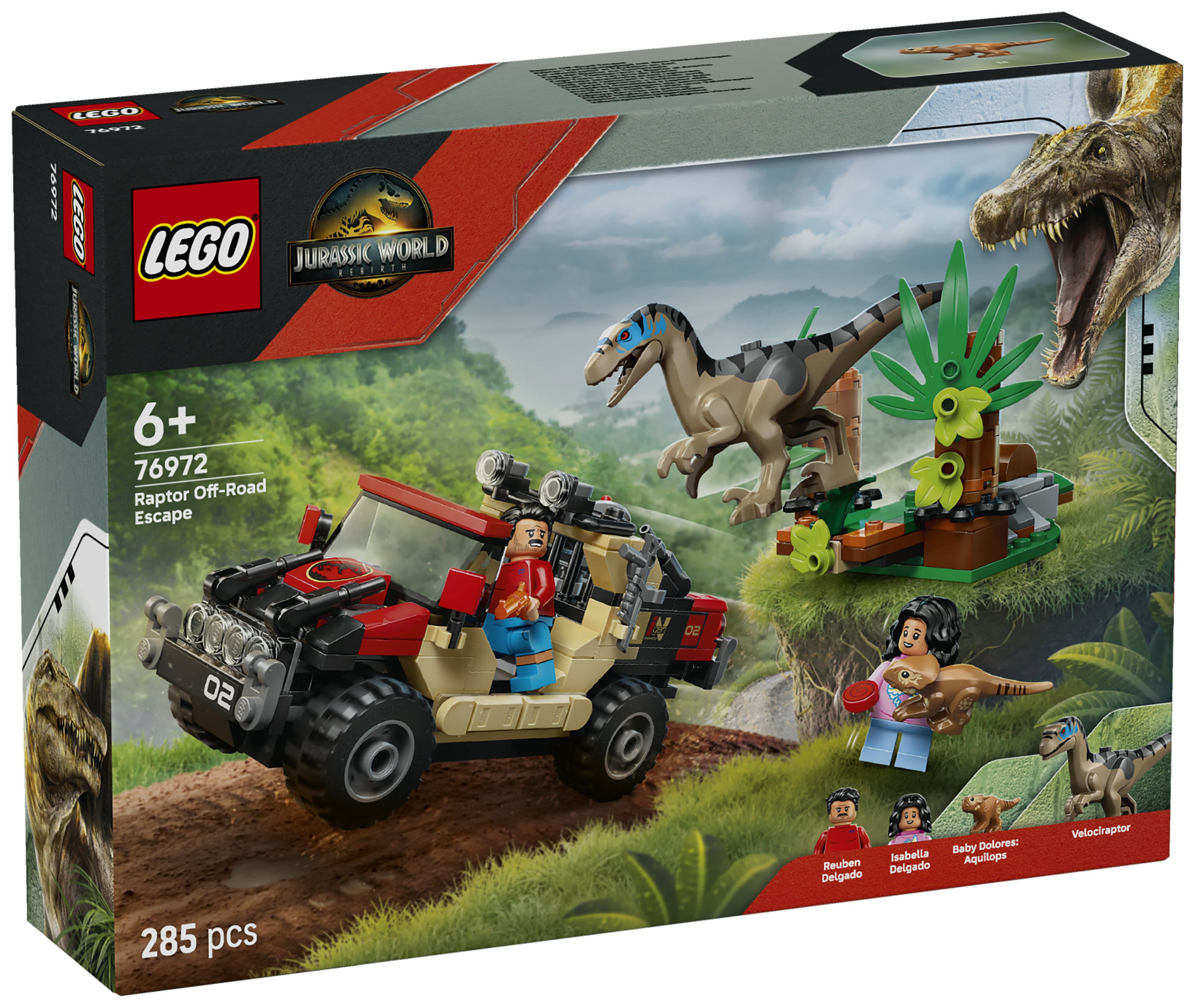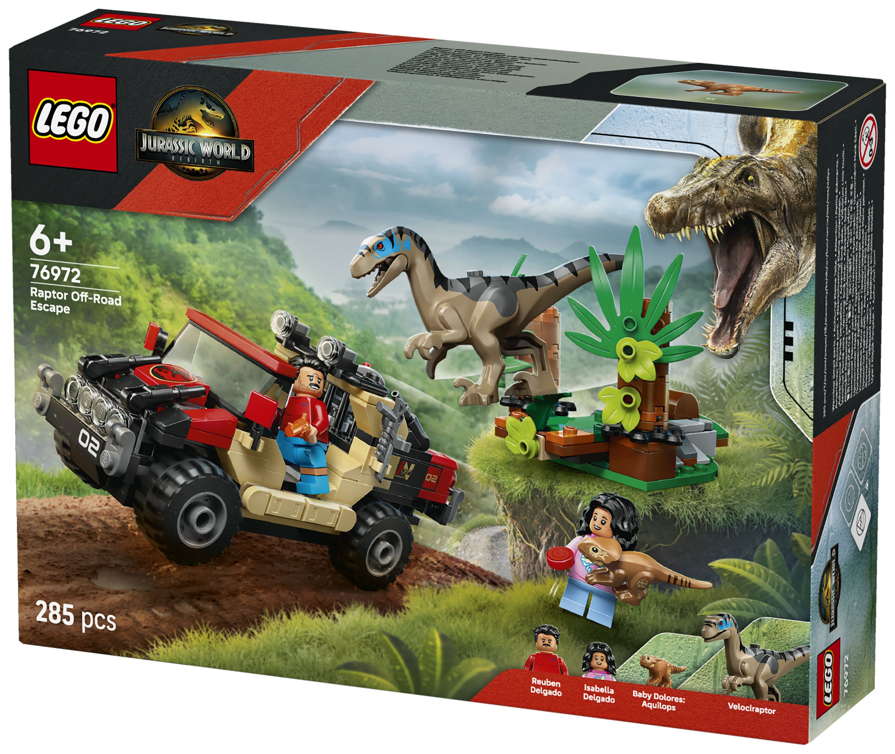 LEGO® Jurassic World Raptor: Verfolgungsjagd mit dem Geländewagen (76972) ist ein Set zum Film Jurassic World Rebirth, in dem Kinder und Fans ab 6 Jahren einige Überraschungen erwarten. Nach dem Bauen des Spielsets können Kinder ihre Lieblingsfilmszenen nachspielen oder neue Geschichten mit den Minifiguren Reuben und Isabella Delgado, dem kleinen Dino Baby Dolores und einem Velociraptor mit aufklappbarem Maul darstellen. Das Bauset beinhaltet außerdem einen Geländewagen, ein Aufspürgerät und einen Busch mit drückbarer Schreck-Funktion, die beim Spielen mit dem Velociraptor benutzt werden kann.
