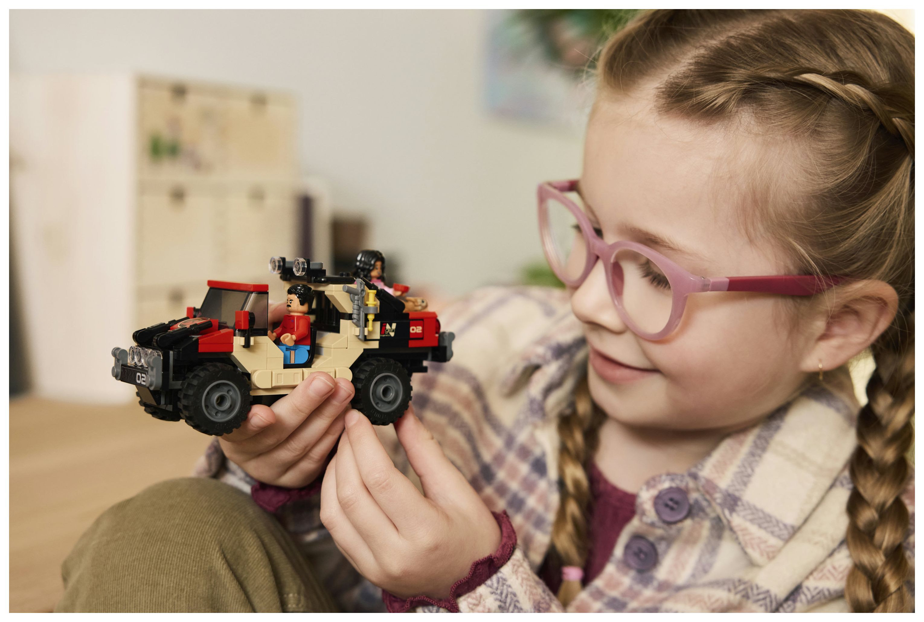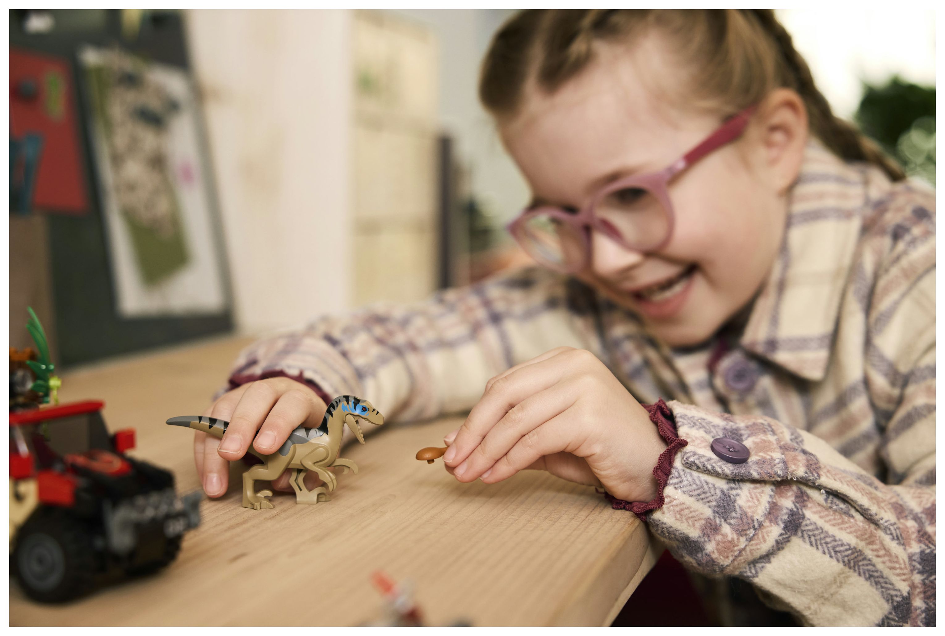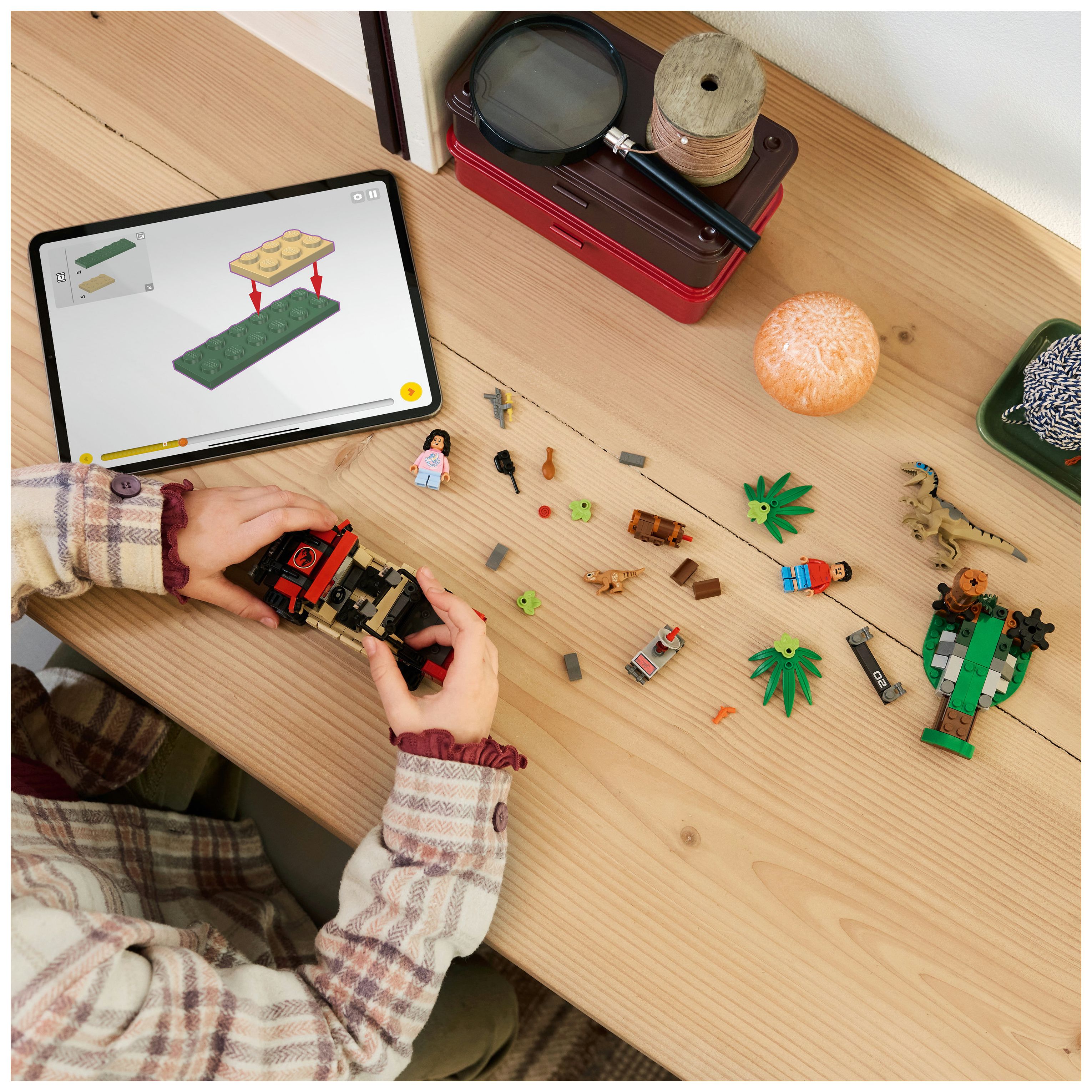 Kreatives Bauset: Für spannende Verfolgungsjagden beinhaltet das Set gegossene LEGO® Figuren, die einen Baby-Aquilops und einen Velociraptor darstellen, sowie einen Geländewagen und die Minifiguren Reuben und Isabella