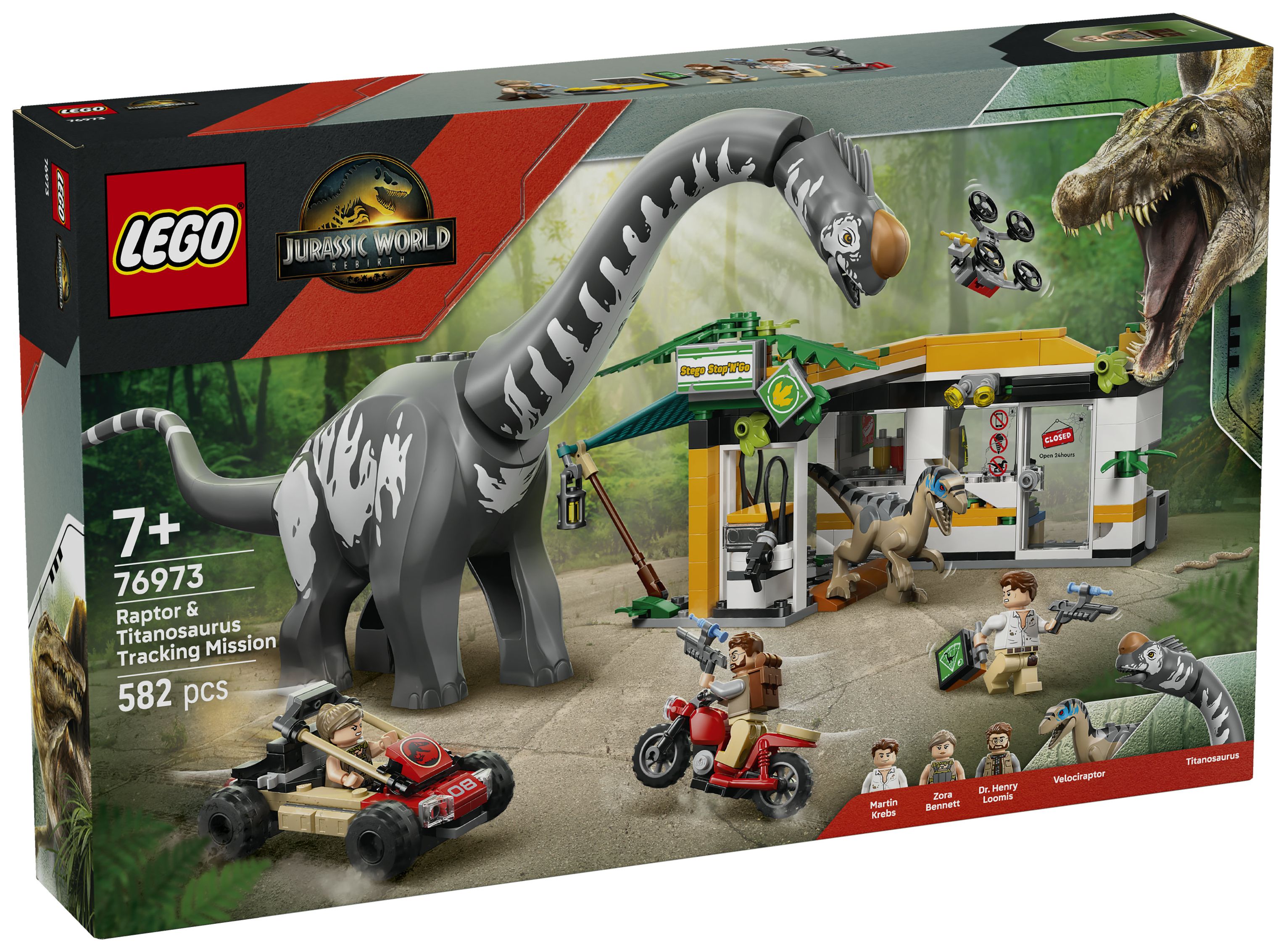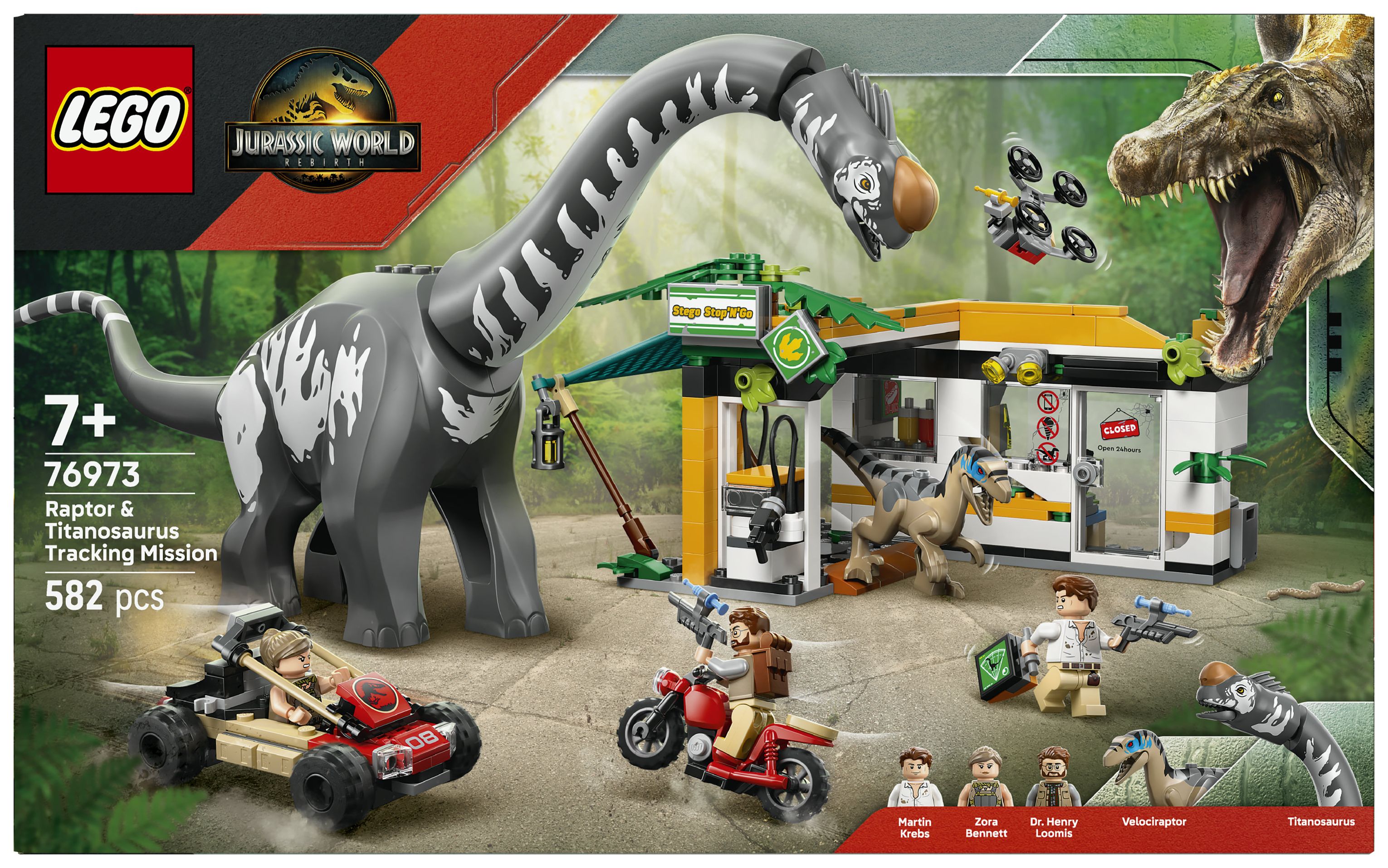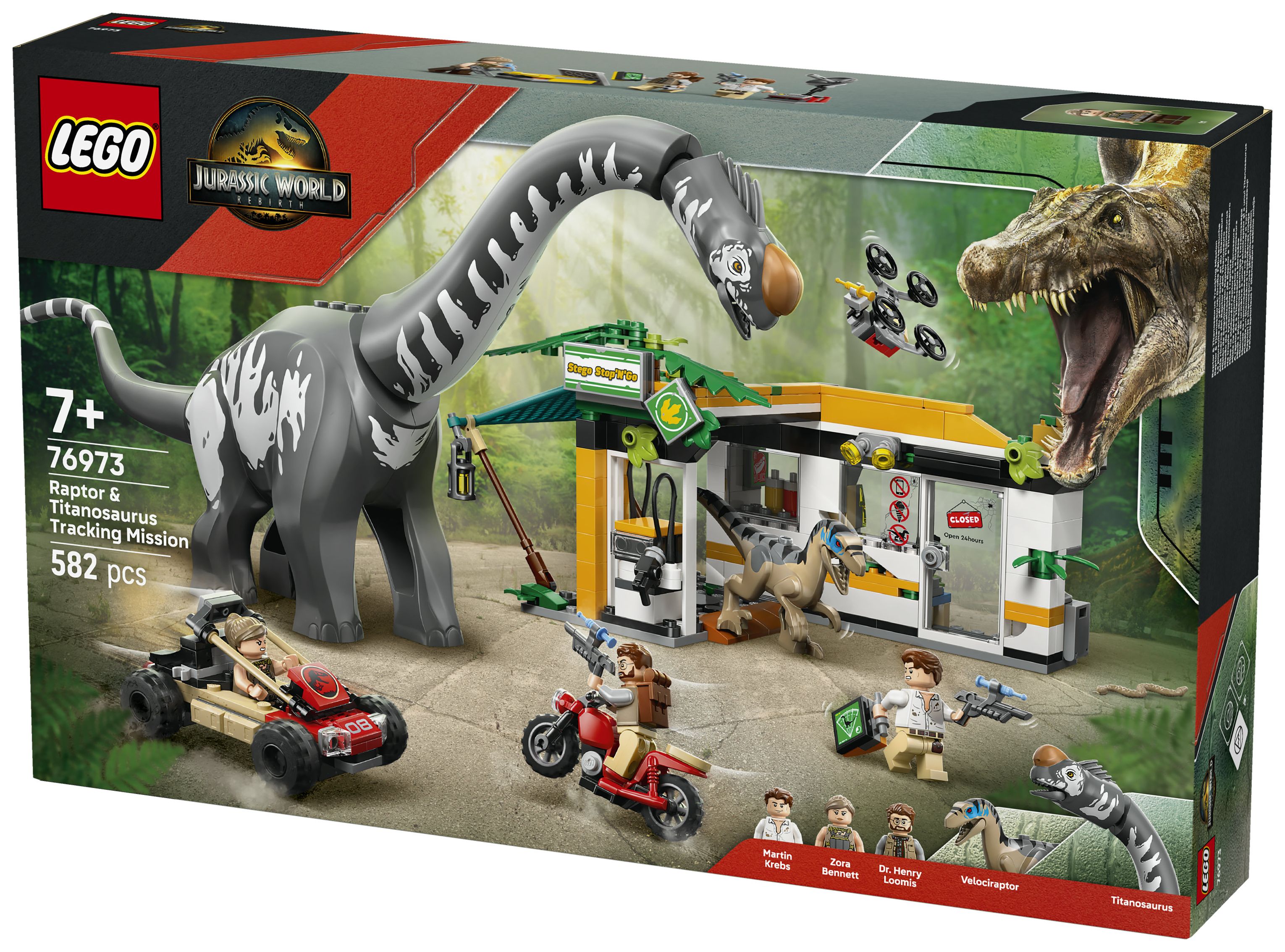 LEGO® Jurassic World Raptor & Titanosaurus: Große Fährtensuche (76973) ist ein Bauset, in dem Kinder und Filmfans ab 7 Jahren spannende Verfolgungsjagden und jede Menge Actionspaß erwarten. Zu diesem Geschenk für Jungen und Mädchen gehören 2 gegossene Spielzeugdinos – ein Titanosaurus und ein Velociraptor – sowie 3 Minifiguren: Zora Bennett, Martin Krebs und Dr. Henry Loomis. Der Velociraptor kann sein Maul aufklappen, und der Titanosaurus kann Hals, Kopf und Schwanz bewegen. Das interaktive Spielset beinhaltet außerdem eine Tankstelle, einen Geländewagen mit Anhänger, einen Spritzenkoffer mit 3 Spritzen, ein Motorrad, eine baubare Drohne und einen Campbereich mit einer Funktion, die einen Baum umstürzen lässt.