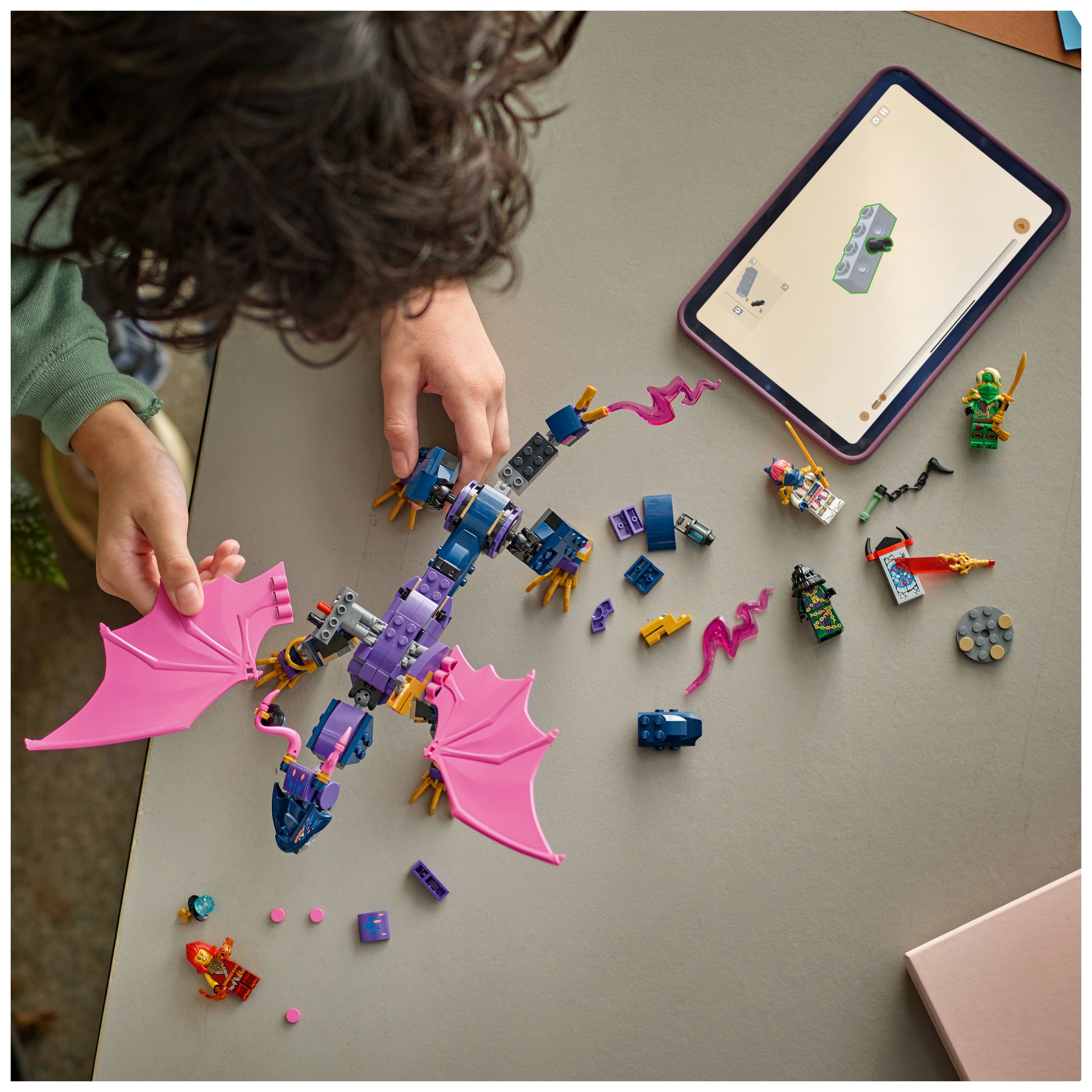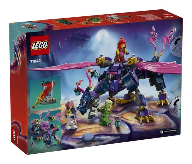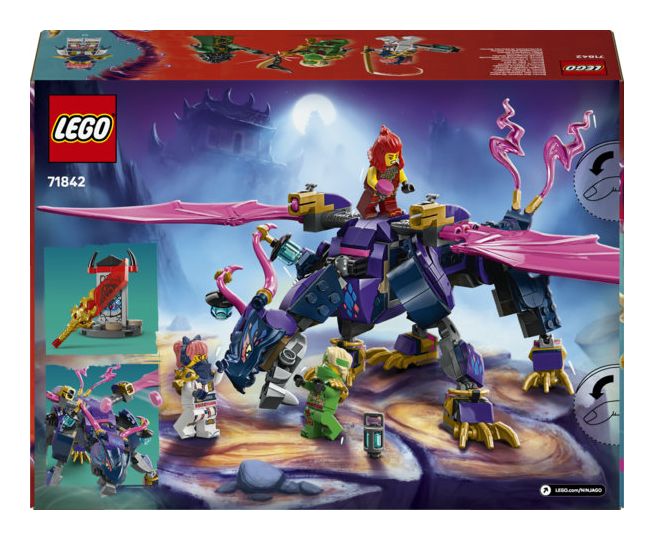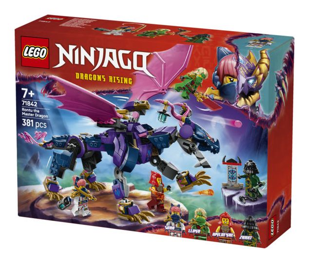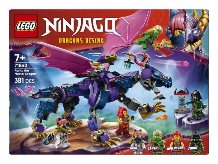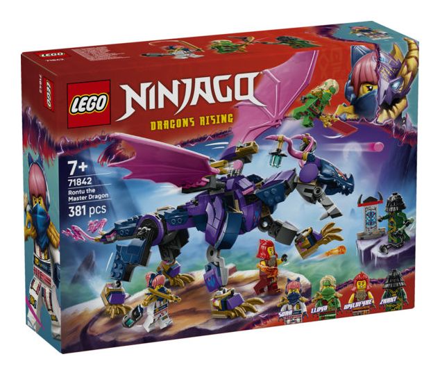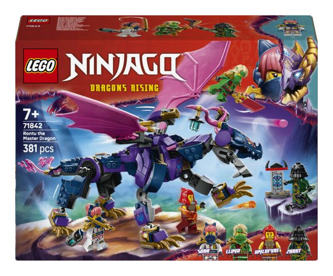 LEGO® NINJAGO® Rontu der Meisterdrache (71842) ist ein Spielset, das Ninja-Fans die Actionszenen aus der 3. Staffel der TV-Serie NINJAGO Aufstieg der Drachen nachstellen lässt. Dieses Bauset für Kinder beinhaltet einen Spielzeugdrachen, der Schwanz, Beine, Flügel, Kopf und Maul bewegen kann und Shooter unter jedem Flügel hat. Auf seinem Rücken gibt es 2 Positionen, um eine Minifigur zu platzieren.