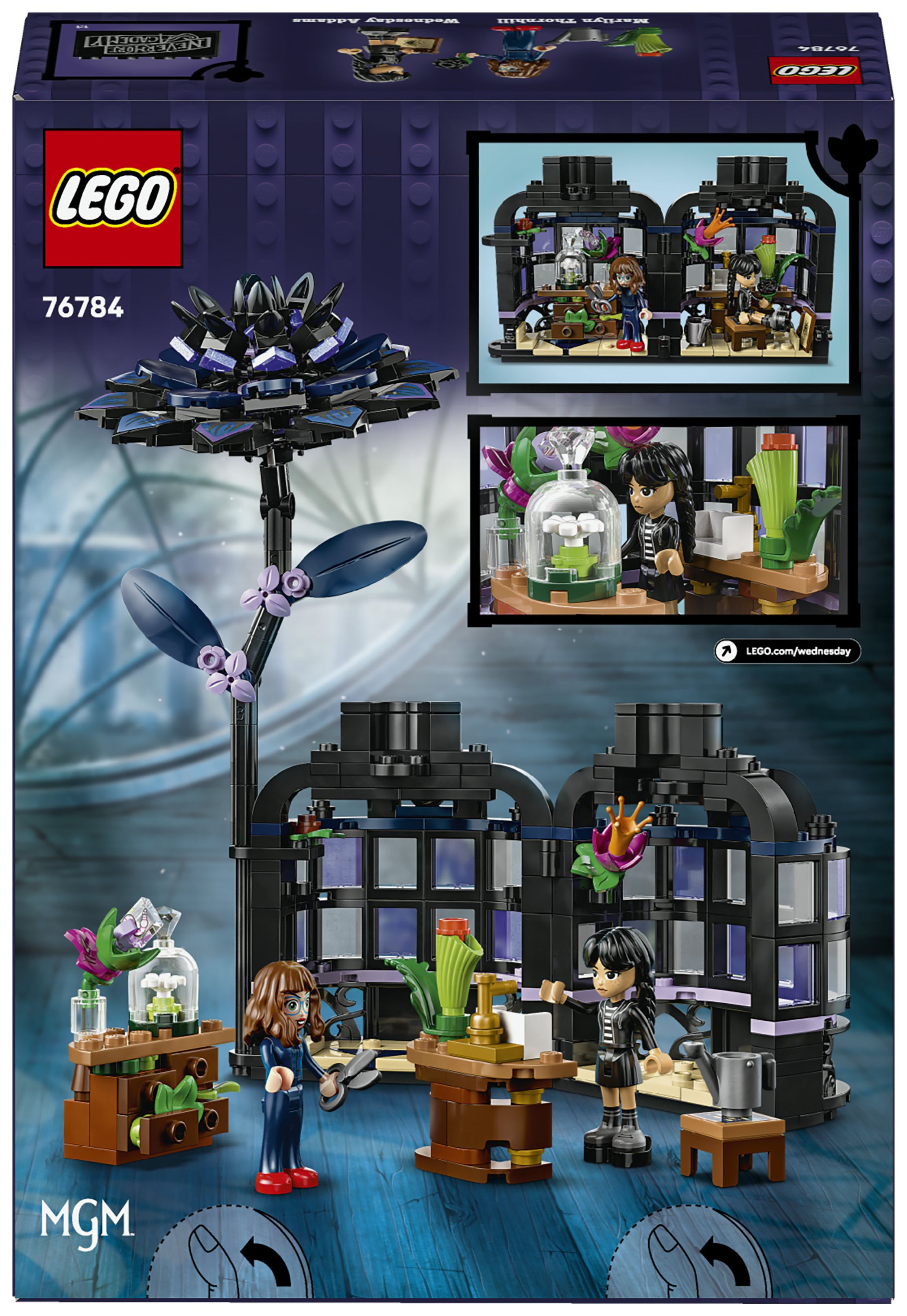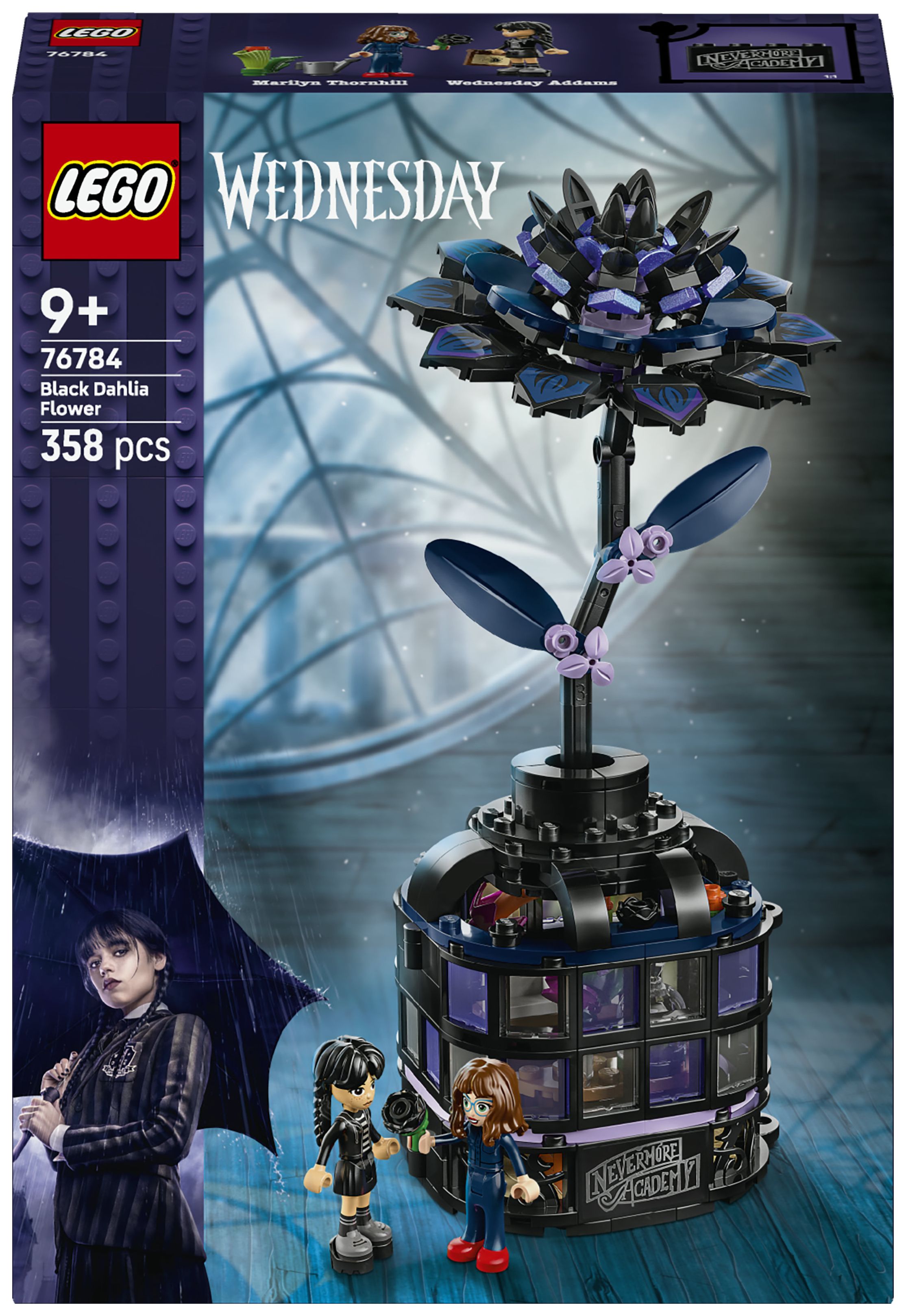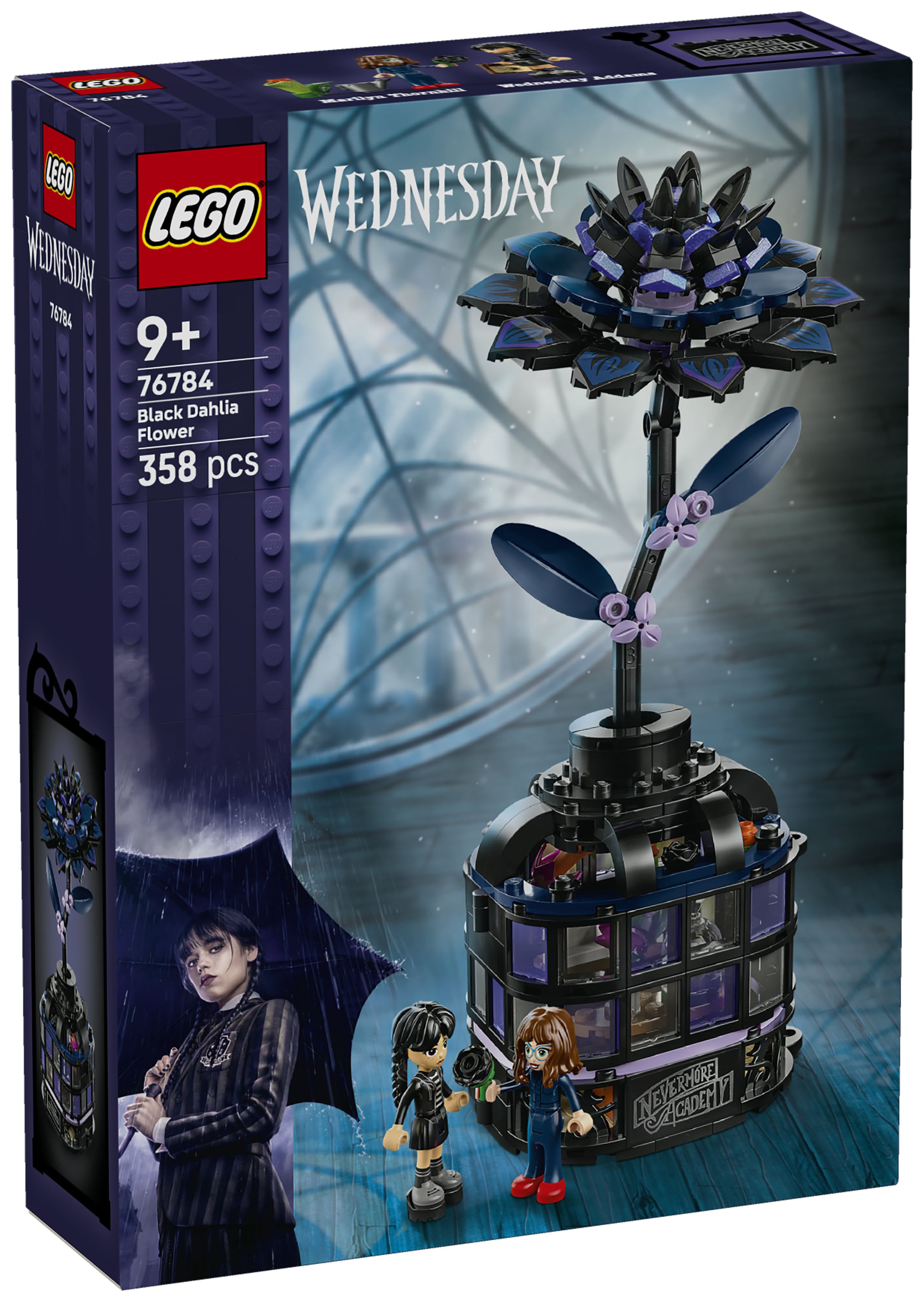 LEGO® Wednesday Schwarze Dahlie (76784) ist ein Bauspielzeug und ein elegantes Ausstellungsstück für Botanik- und Designfans ab 9 Jahren. Diese Zimmerdeko besteht aus einer schwarzen Dahlie mit Blättern und hellvioletten Knospen und einer Vase, die einem Mini-Wintergarten nachempfunden ist. Kinder können die Dahlie von dem fertigen Modell abnehmen, um die Vase zu entriegeln und das im Inneren versteckte Klassenzimmer zu entdecken. Im Klassenzimmer stehen herausnehmbare Schreibtische, ein Hocker und weiteres Zubehör für viele Geschichten. Und die beiden Spielfiguren Wednesday Addams und Marilyn Thornhill (Wednesdays Botaniklehrerin) laden zu unzähligen Rollenspielen ein.
