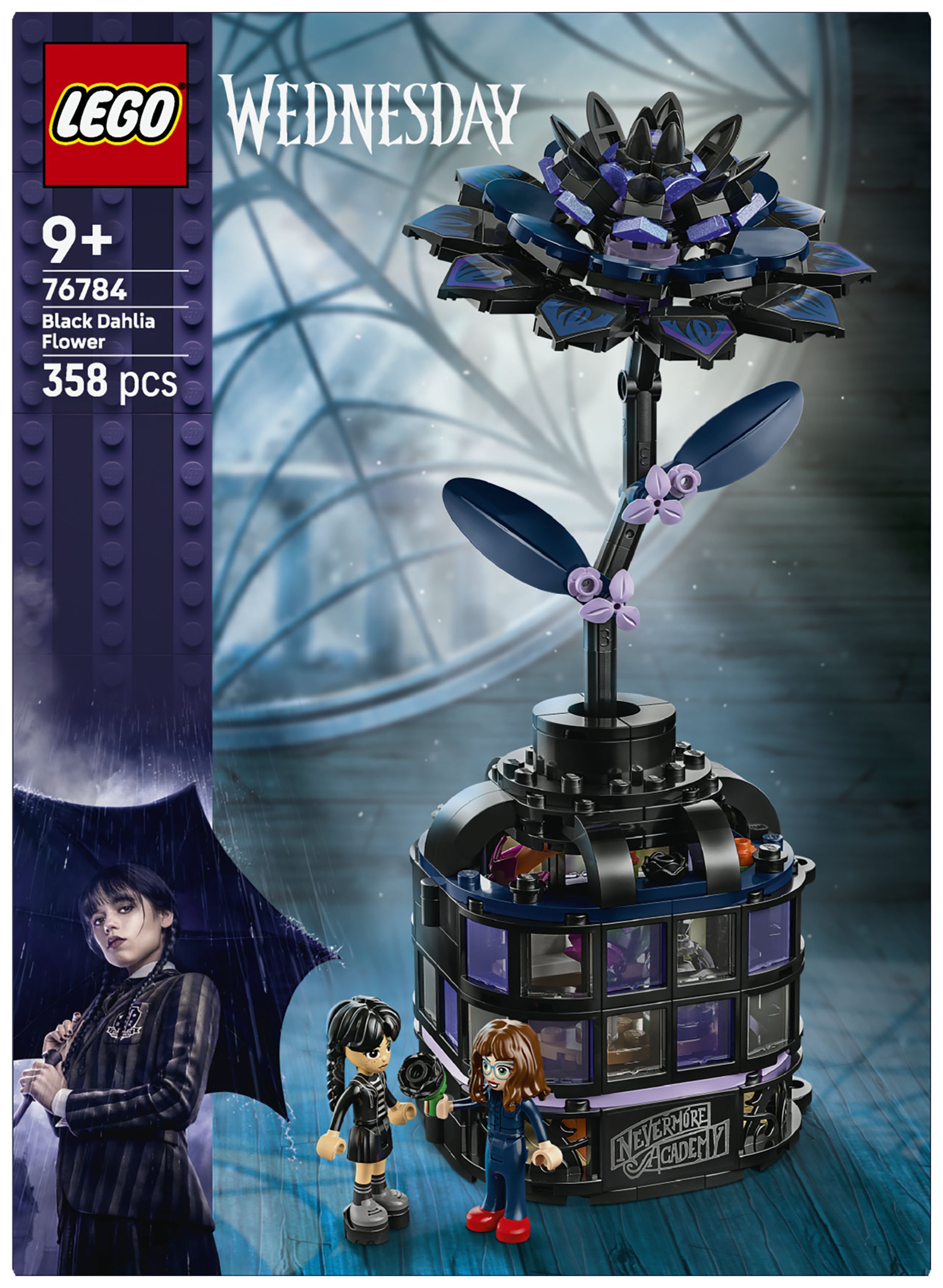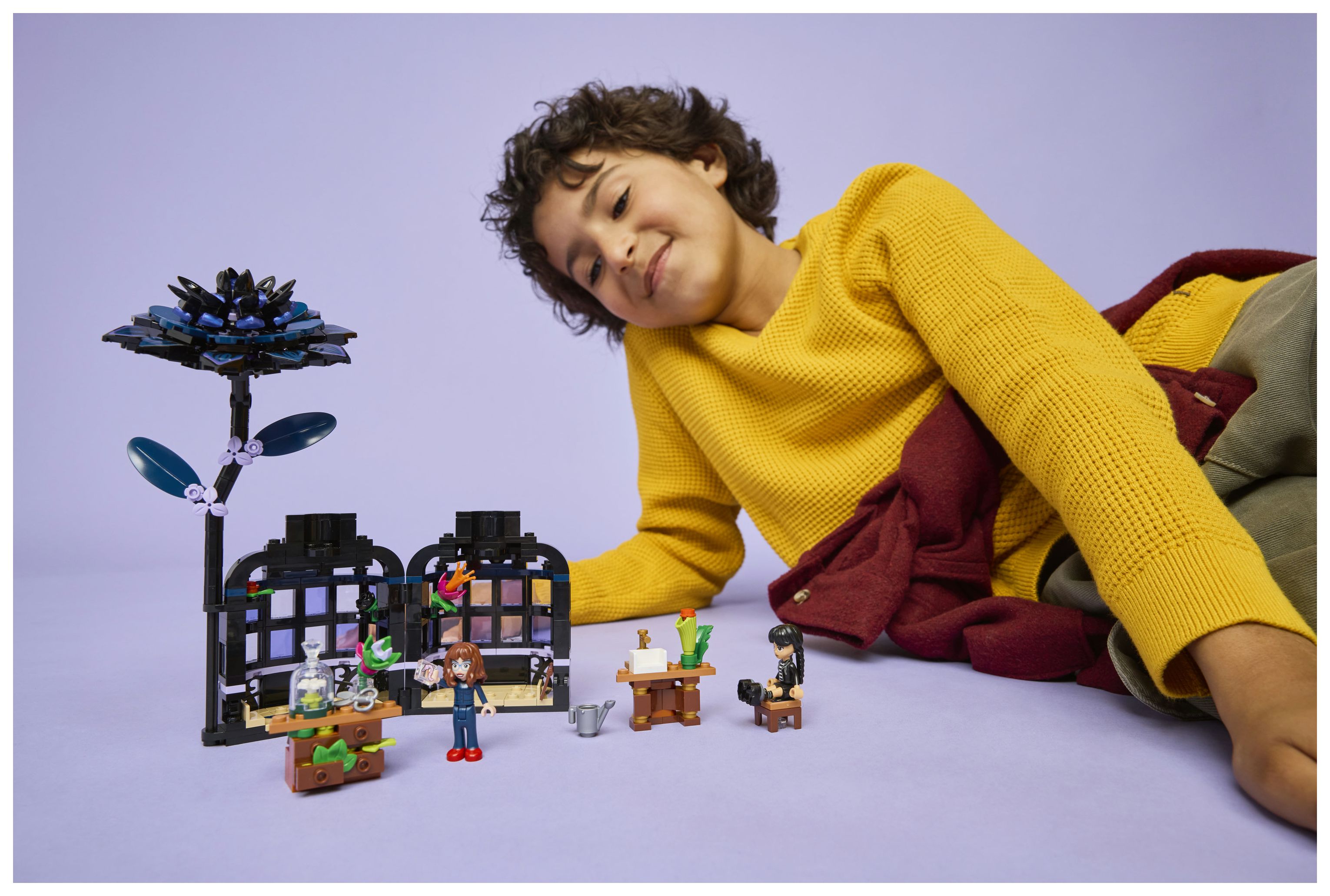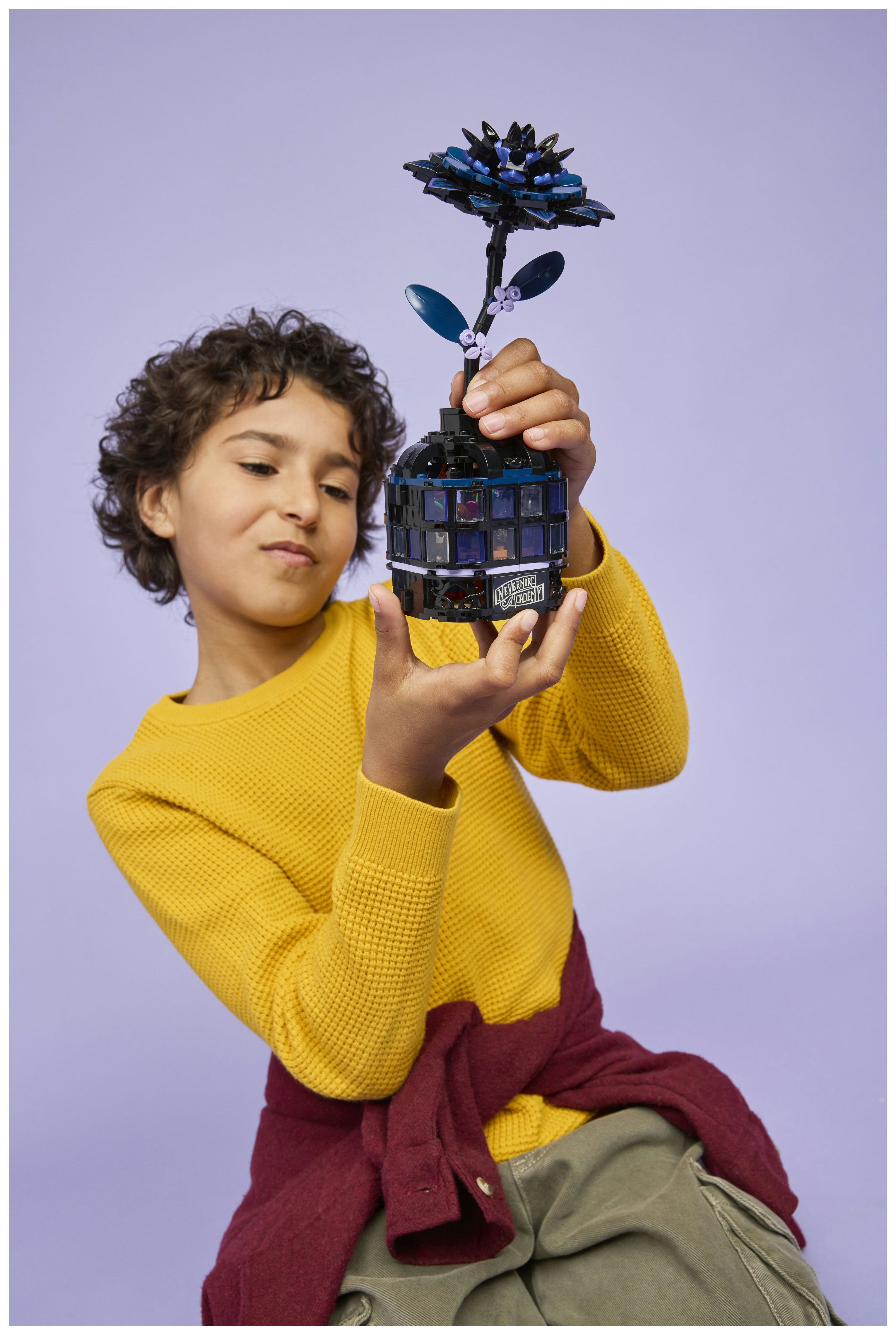 Geheimnisvolles Kinderspielzeug: Dieses Set ist ein baubarer Fanartikel. Die schwarze Dahlie verriegelt die Vase, die sich aufklappen lässt, um Details aus der TV-Serie Wednesday preiszugeben und unzählige Spielmöglichkeiten zu bieten