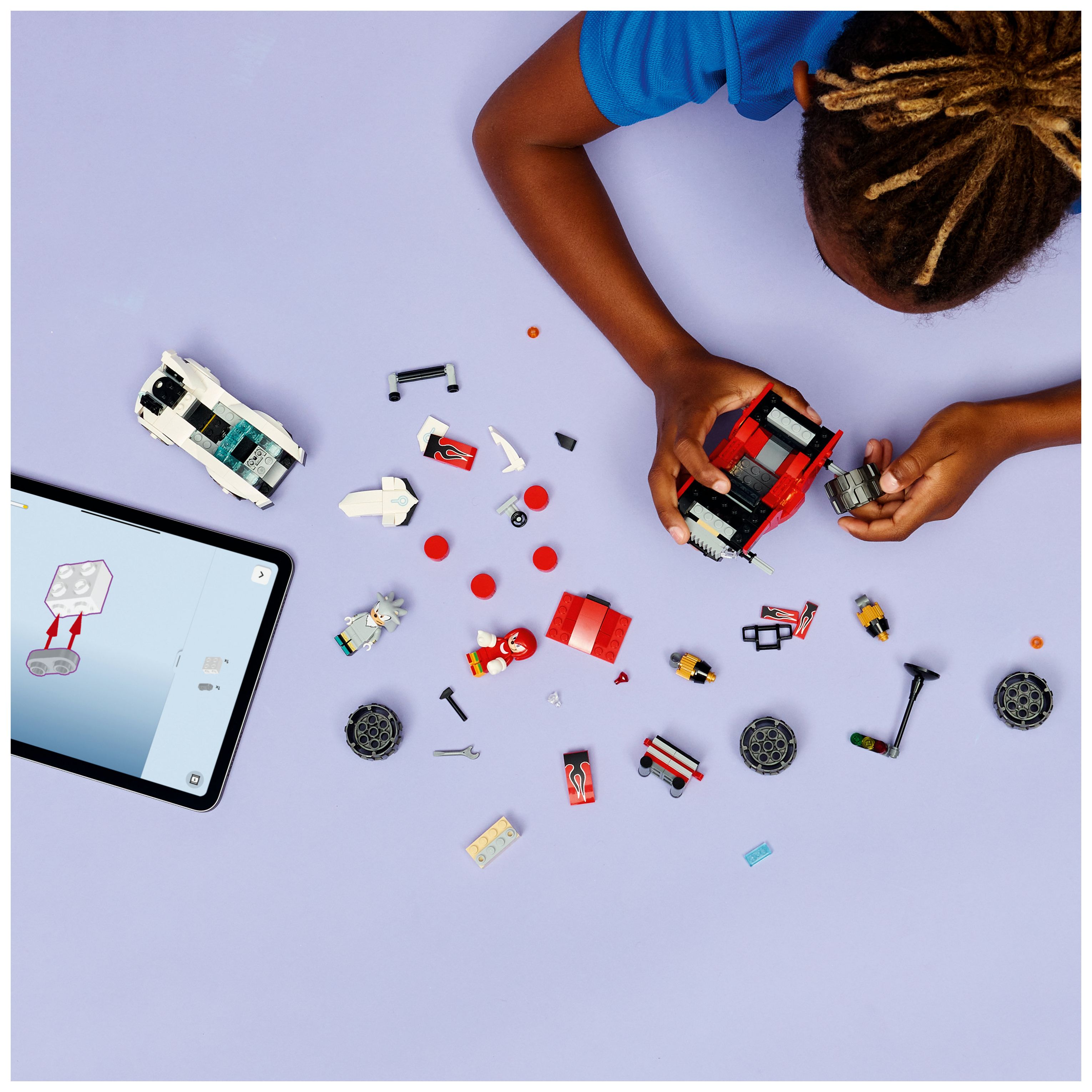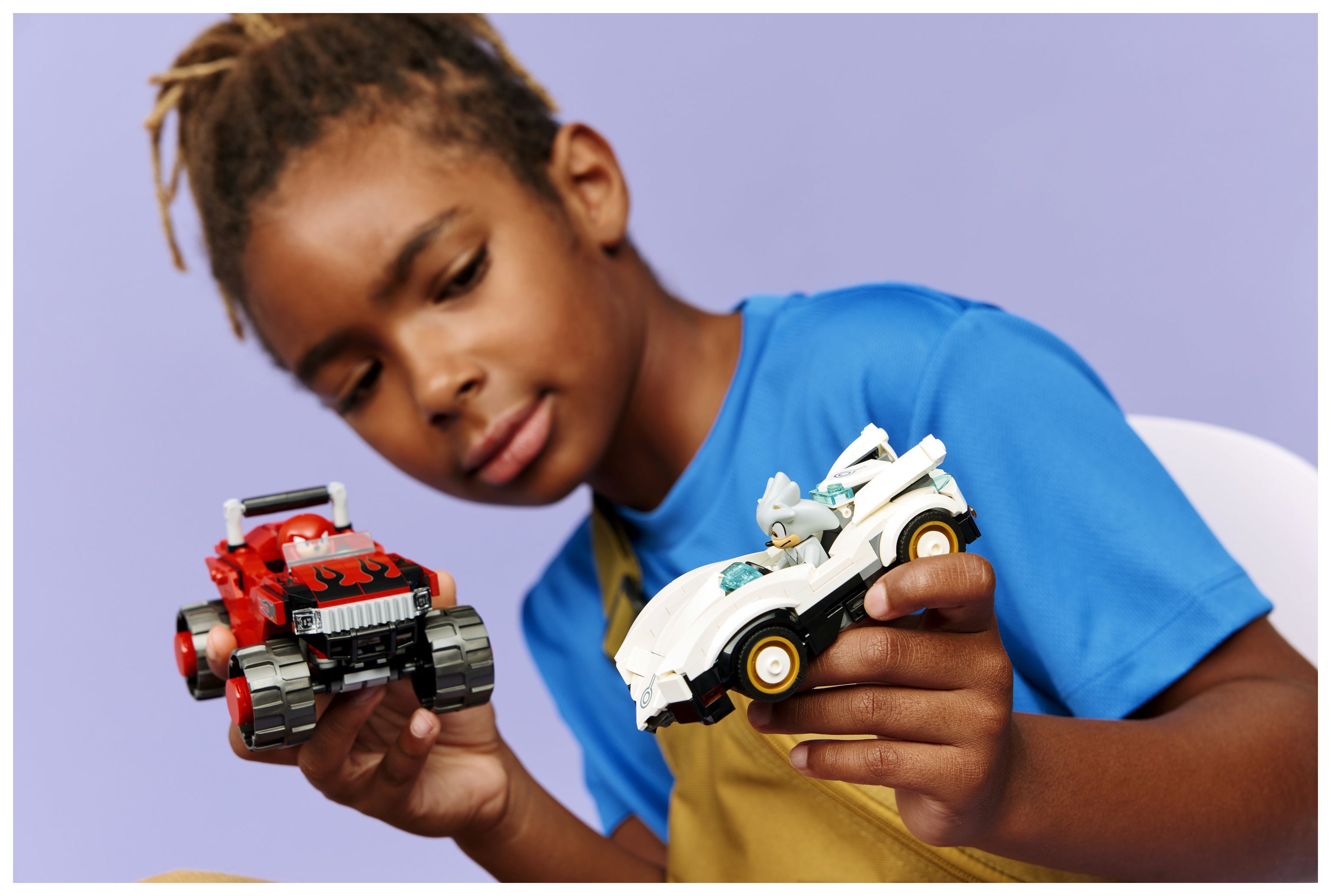 SONIC THE HEDGEHOG™ SPIELZEUG: Kinder und Gamer ab 8 Jahren können 2 Fahrzeuge in spannende Rennen schicken. Das Bauset zum Videospiel beinhaltet außerdem die Minifiguren Silver und Knuckles für jede Menge Actionspaß