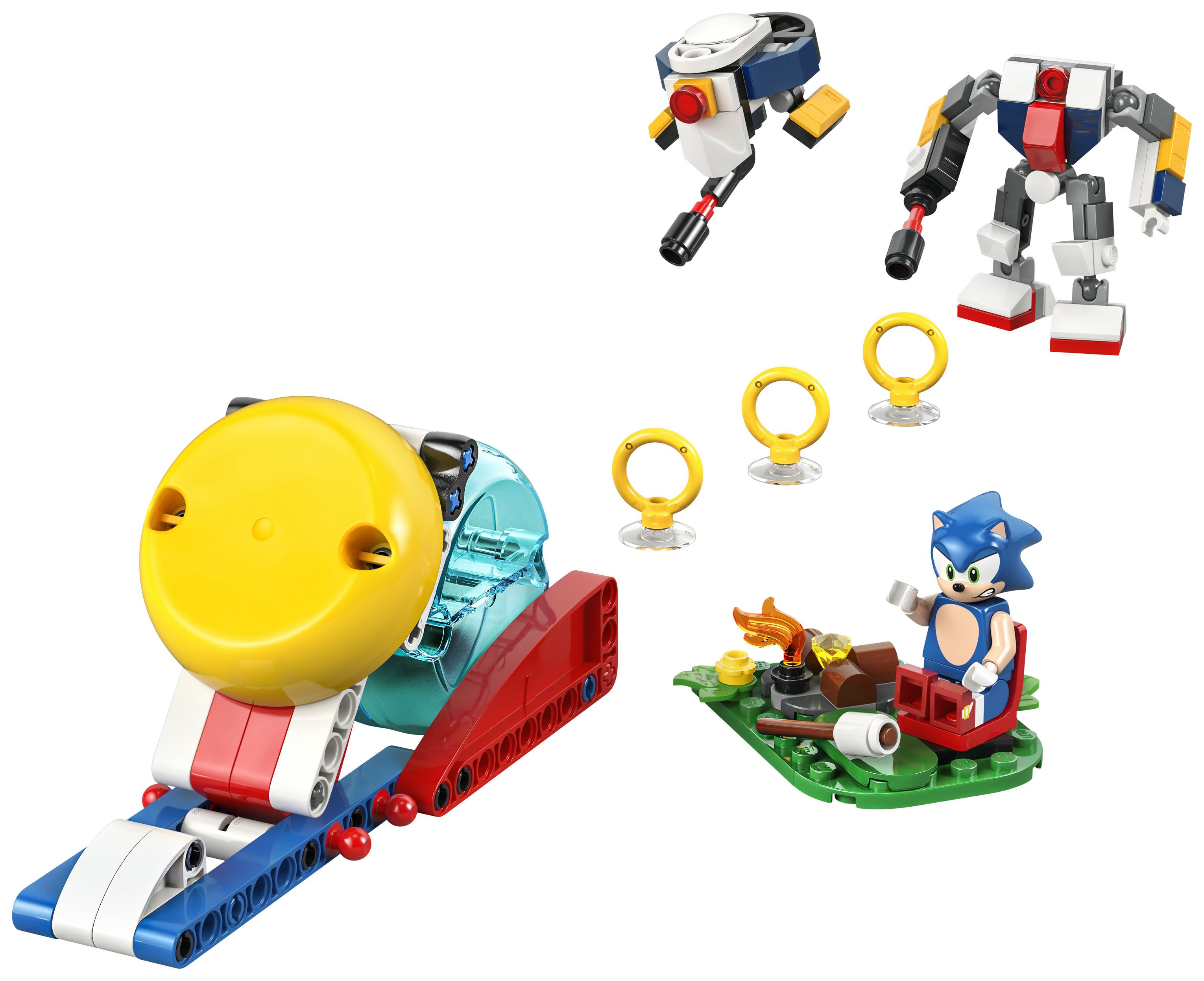 Sonic Spielzeug mit vielen Funktionen: Dieses Spielset zum Sammeln beinhaltet ein Startkatapult für die enthaltene Geschwindigkeitskugel, ein Lagerfeuer und 4 Figuren: Sonic, die Roboterdrohne Gun Beetle, den Roboter Gun Hunter und einen Tocky