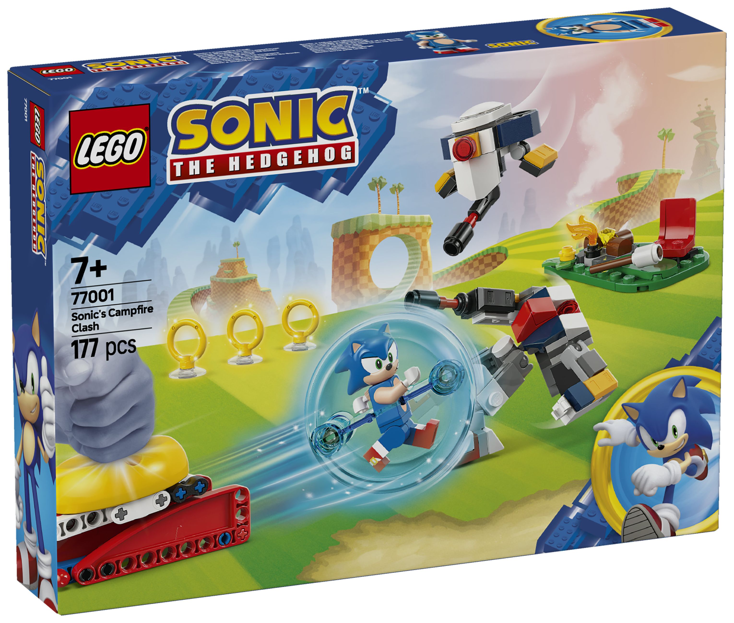 Sonics Showdown am Lagerfeuer (77001) ist ein Spielzeug, das Videospielfans ab 7 Jahren Bauspaß und Abenteuer bietet. Dieses LEGO® Sonic the Hedgehog™ Set zum Sammeln, Bauen und Spielen beinhaltet das Modell eines Lagerfeuers, ein Startkatapult für die enthaltene Geschwindigkeitskugel sowie einen Chaos Emerald und 3 Goldringe. Zu diesem Set gehören auch 4 Spielzeugfiguren aus dem Videospiel : die Minifigur Sonic, die fliegende Roboterdrohne Gun Beetle, der bewegliche Roboter Gun Hunter sowie ein Tocky.
