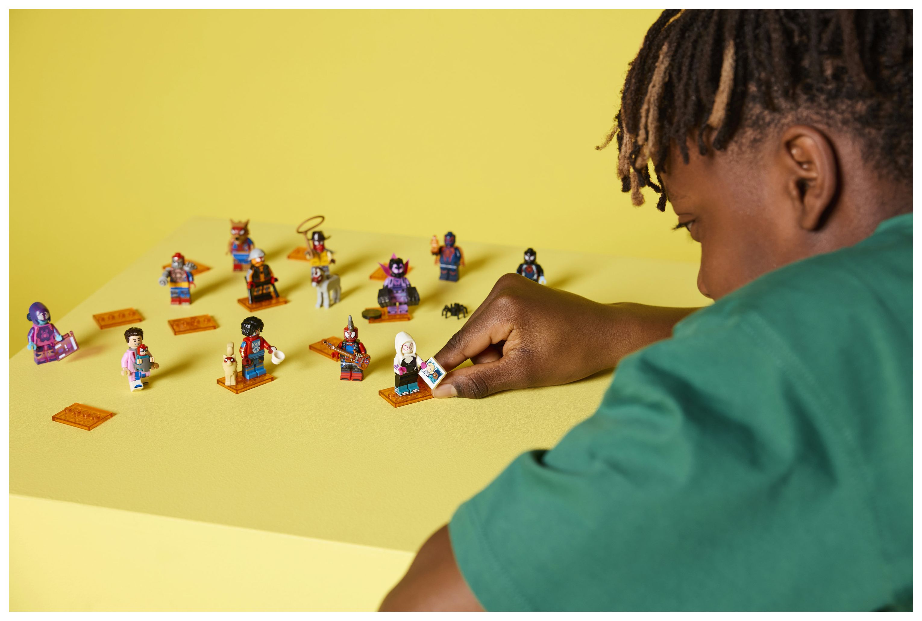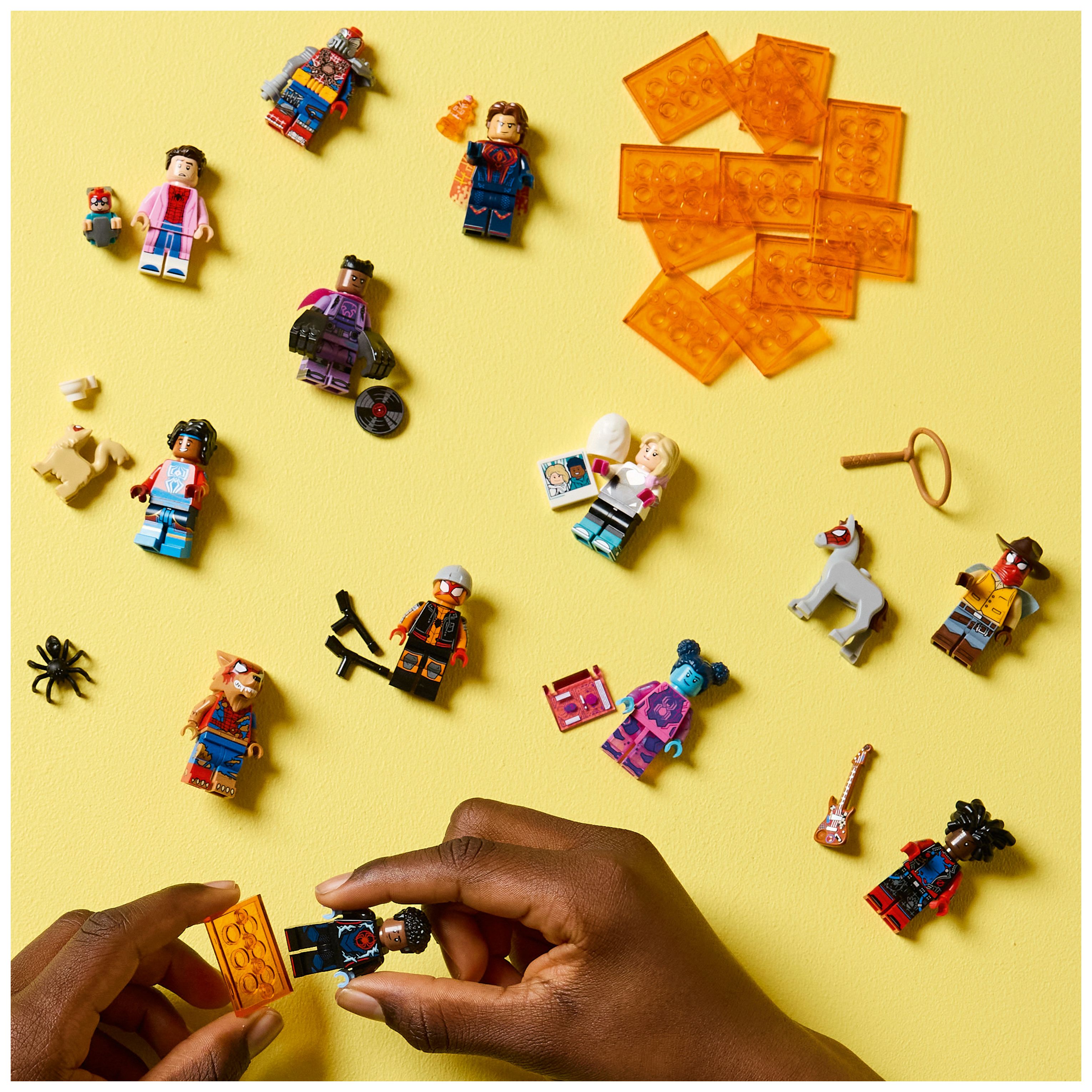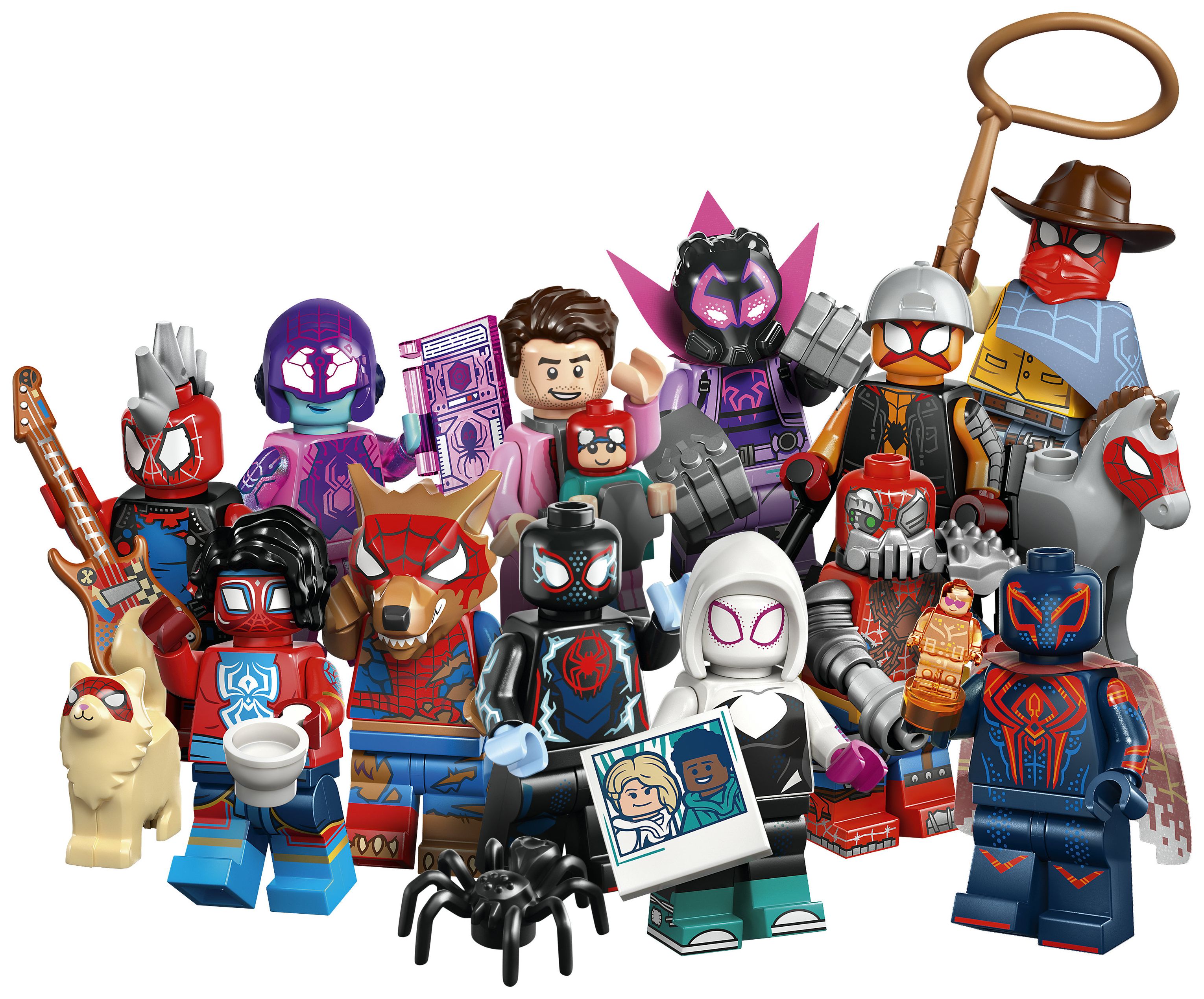 In jeder Überraschungsbox befindet sich ein baubarer Spielzeug-Superheld zum Sammeln. Insgesamt besteht diese Serie aus 12 Minifiguren: Miles Morales/Spider-Man, Miguel O’Hara/Spider-Man 2099, Gwen Stacy/Spider-Gwen, Hobie Brown/Spider-Punk, Pavitr Prabhakar/der indische Spider-Man, Miles G. Morales/Prowler, Peter B. Parker/Spider-Man & May „Mayday“ Parker, Margo Kess/Spider-Byte, Peter Parker/Werewolf Spider-Man, Patrick O’Hara/Web-Slinger, Petra Parker/Cyborg Spider-Woman und Charlotte Webber/Sun-Spider.