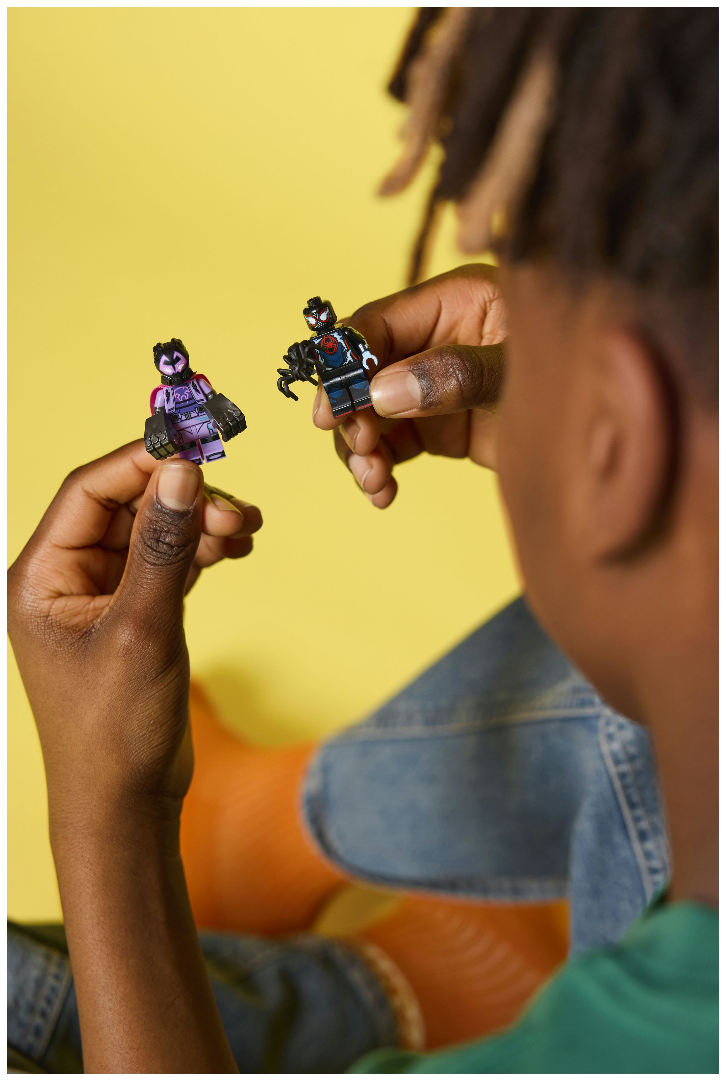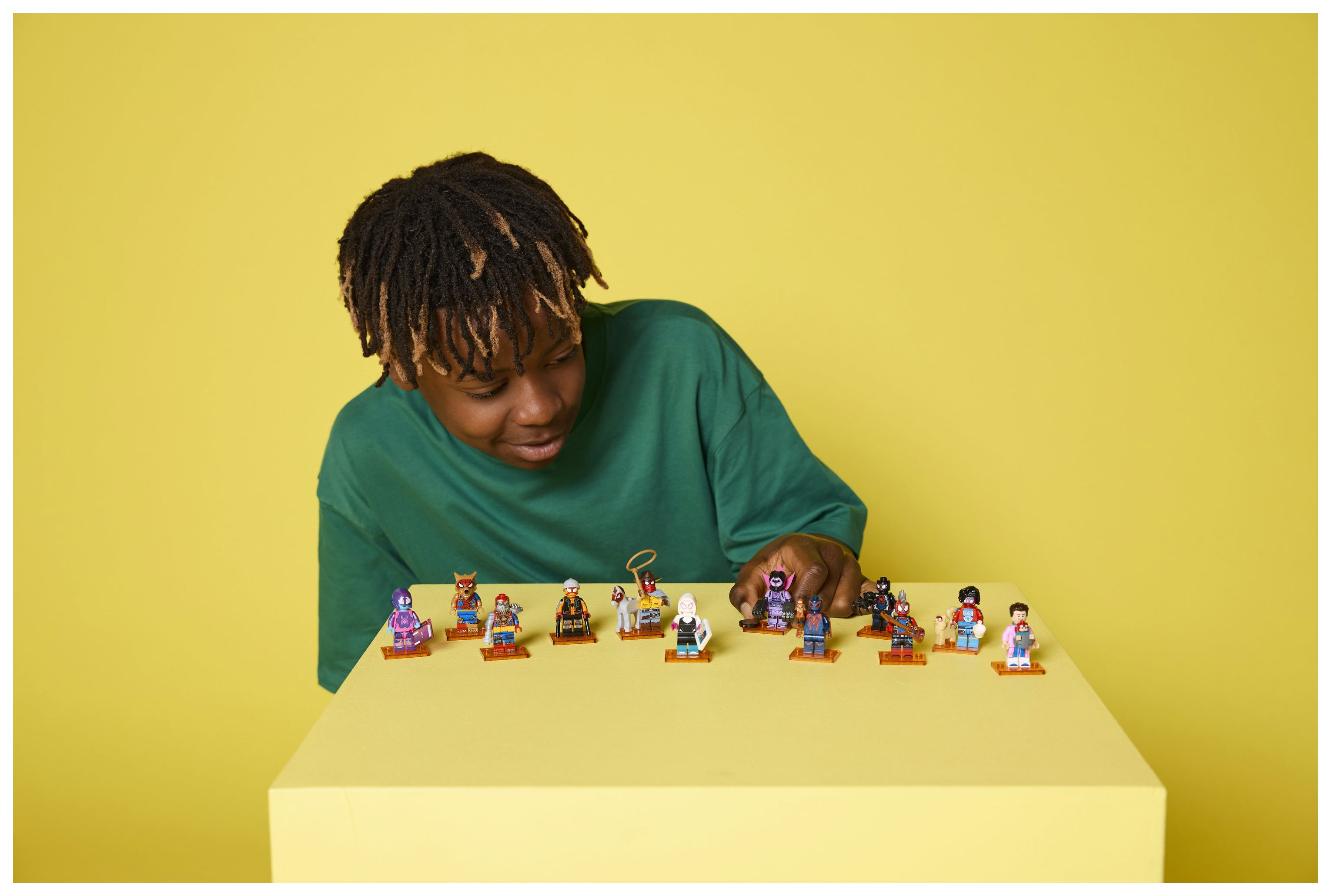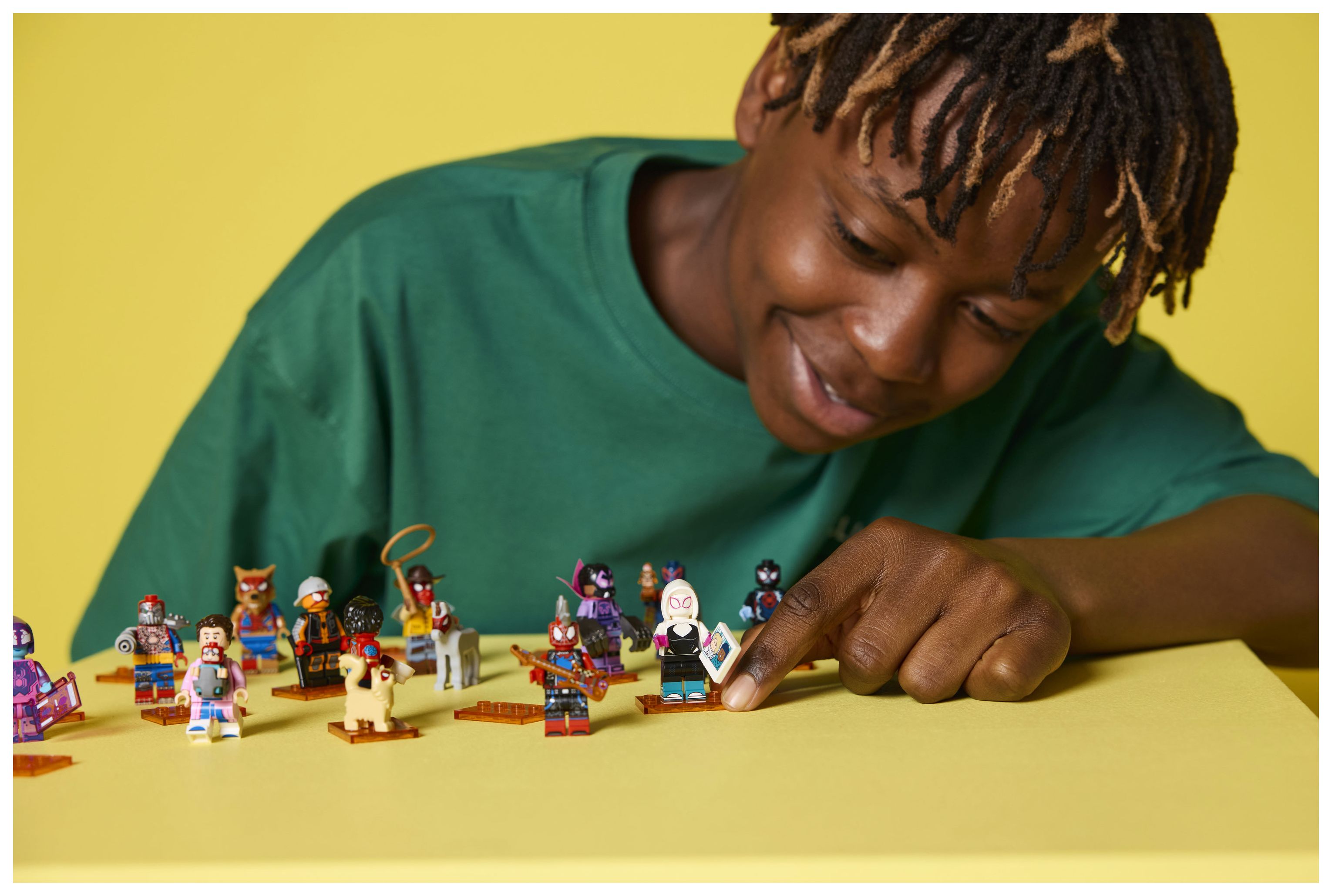 In jeder Überraschungsbox befindet sich ein baubarer Spielzeug-Superheld zum Sammeln. Insgesamt besteht diese Serie aus 12 Minifiguren: Miles Morales/Spider-Man, Miguel O’Hara/Spider-Man 2099, Gwen Stacy/Spider-Gwen, Hobie Brown/Spider-Punk, Pavitr Prabhakar/der indische Spider-Man, Miles G. Morales/Prowler, Peter B. Parker/Spider-Man & May „Mayday“ Parker, Margo Kess/Spider-Byte, Peter Parker/Werewolf Spider-Man, Patrick O’Hara/Web-Slinger, Petra Parker/Cyborg Spider-Woman und Charlotte Webber/Sun-Spider.