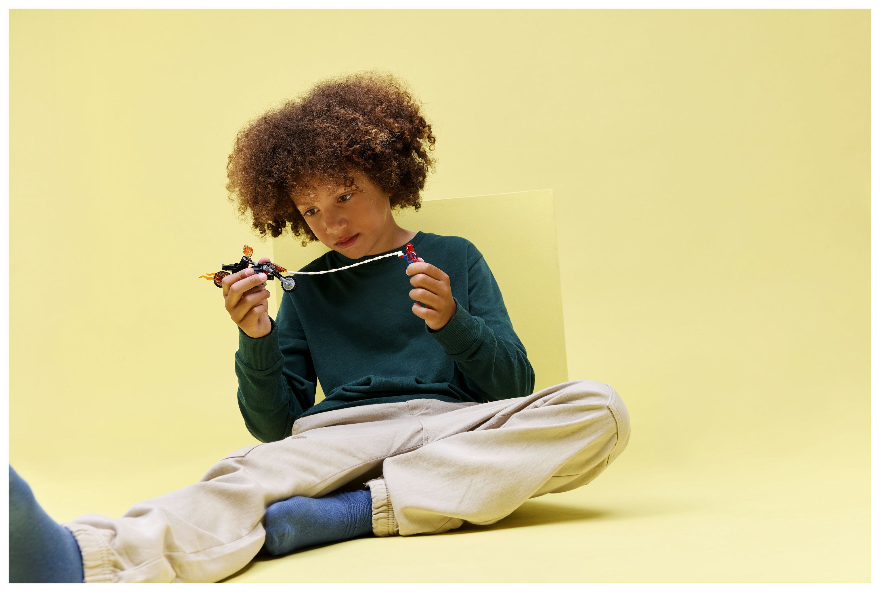 STELL SPANNENDE ACTIONSZENEN NACH: Kinder können Spider-Man an seinem Seil auf Ghost Riders Motorrad schwingen lassen. Aus dem Auspuff und aus den Händen des Bösewichts schlagen Flammen