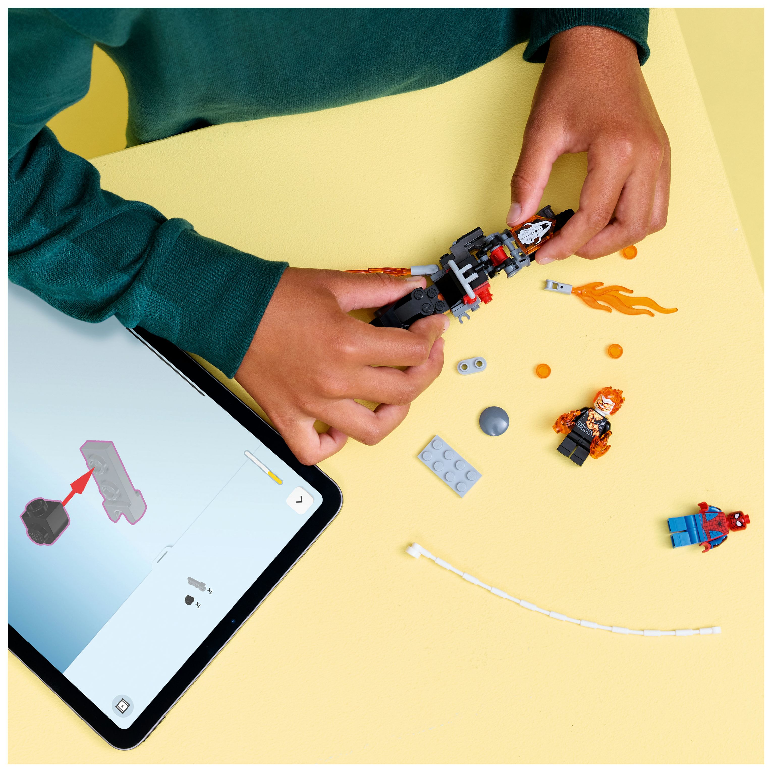 Die Minifigur Ghost Rider ist als Skelett dargestellt, aus dessen Händen und Kopf Flammen schießen. Sein legendäres Motorrad hat 2 eingebaute Shooter und 2 Auspuffrohre, aus denen Flammen schlagen. Spider-Mans Seil kann am Motorrad befestigt werden, um unzählige Rollenspiele zu ermöglichen. Die beiden Minifiguren können sich auf dem rasanten Bike spannende Duelle liefern. Das Bauset ist ein tolles Geburtstagsgeschenk für junge Superhelden, LEGO Baufans und alle, die Spider-Man Fanartikel sammeln. Und die LEGO Builder App mit verständlichen digitalen Bauanleitungen lässt Kinder selbstbewusst bauen, 3D-Modellansichten vergrößern und drehen und den Baufortschritt verfolgen. Das Bauset besteht aus 72 Teilen.