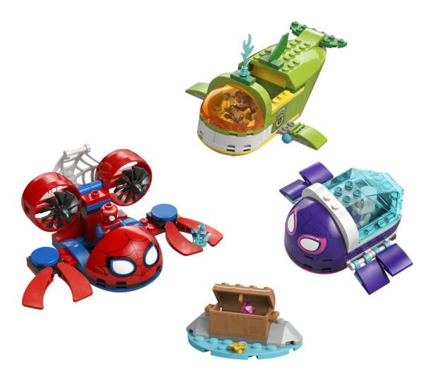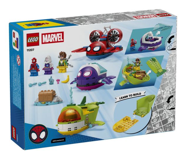 LEGO® ǀ Marvel Spidey: Unterwasserfahrzeuge (11207) schickt Marvel-Fans ab 4 Jahren in viele Unterwasserabenteuer. Beim Spielen mit den Minifiguren Spidey, Ghost-Spider und Doc-Ock in ihren 3 U-Booten entwickeln Kinder viele kreative Fähigkeiten.