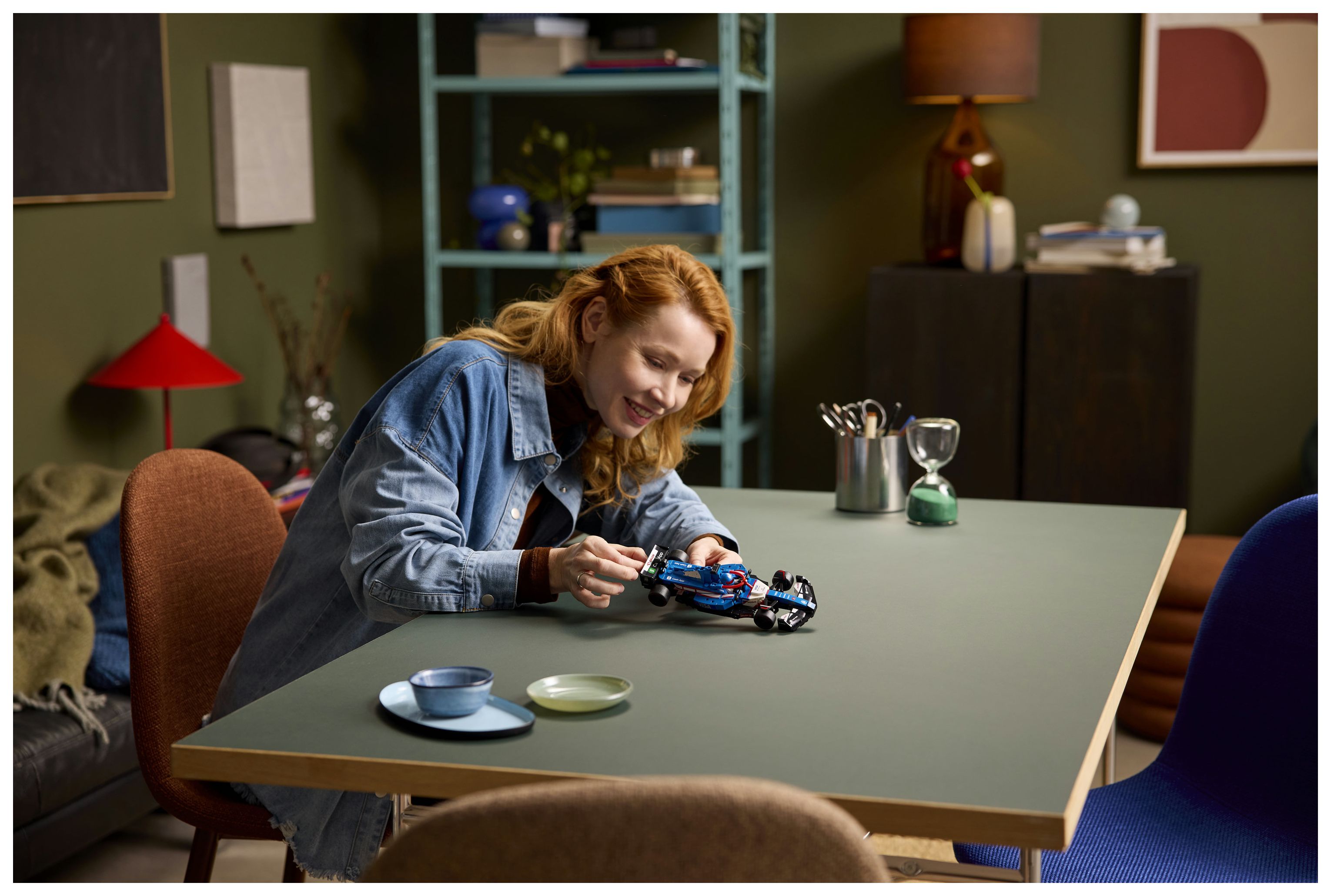 Das Modell des F1-Rennautos hat ein Cockpit, das sich öffnen lässt, indem man den Halo-Bügel hochklappt, einen Heckflügel, einen Querlenker, Sponsorenaufkleber und breitere Hinterreifen mit dem Aufdruck „Pirelli“. Zu dem F1-Rennauto gehört auch eine Rennfahrer-Minifigur im RB-Rennoverall und mit Helm, die man fürs Rennen ins Cockpit setzen kann.