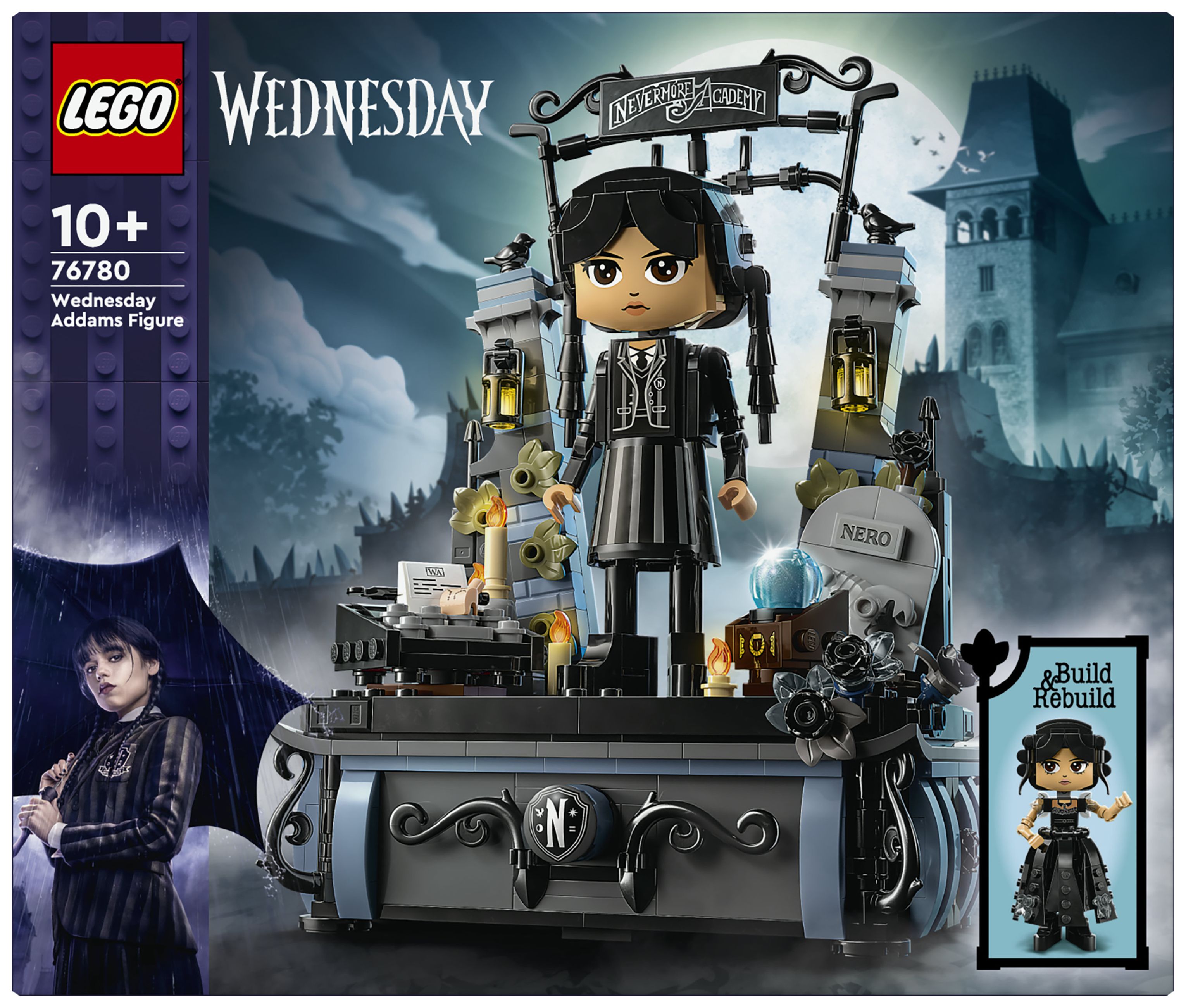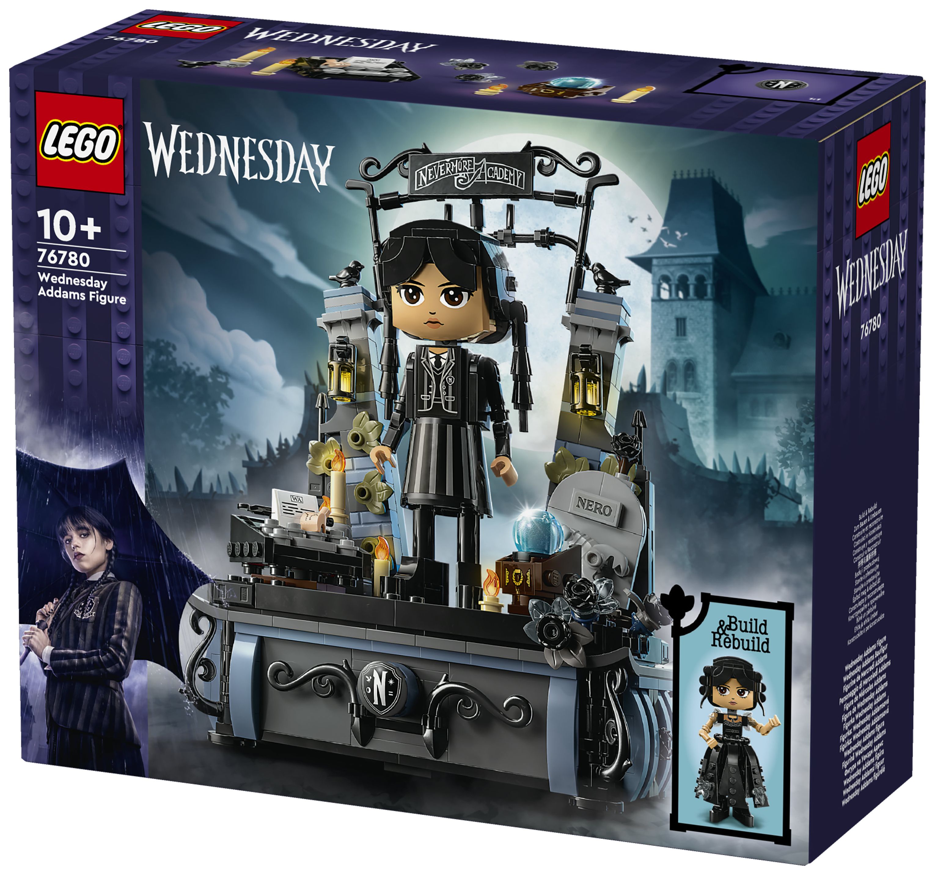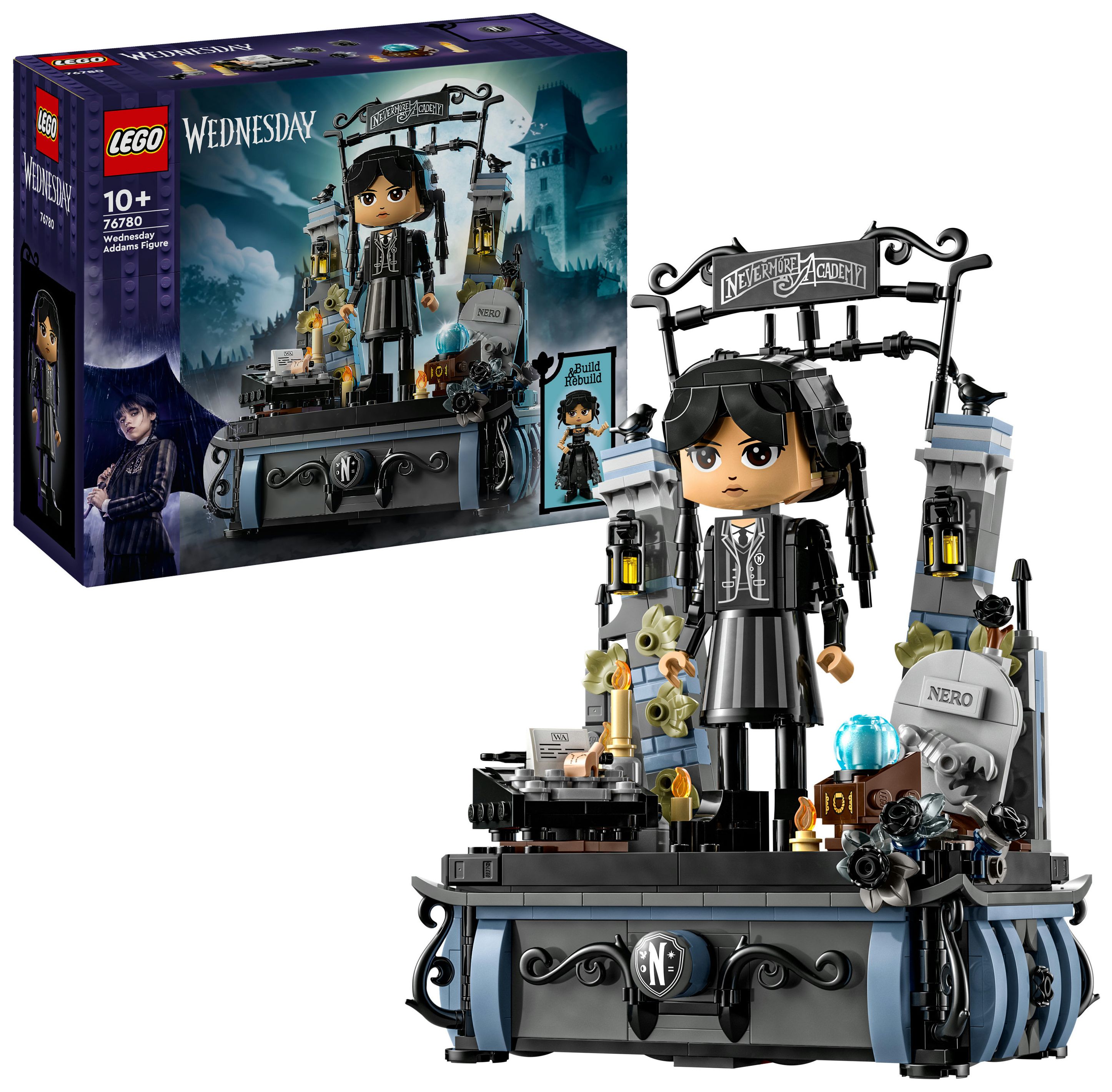 Wednesday Addams Baufigur (76780) ist ein Geschenk zum Sammeln voller Geheimnisse für Kinder ab 10 Jahren. Das LEGO® Wednesday Spielset beinhaltet ein Modell, das Kopf, Arme und Füße bewegen kann, sowie 2 Gesichter und 2 Outfits, um die Figur umgestalten zu können. Auch ihr treuer Begleiter Eiskaltes Händchen und ein Ständer mit schwarzen Dahlien und zwei Geheimfächern für Schätze wie ihr Rave’N Dance-Kleid oder ihre Schuluniform dürfen nicht fehlen. Darüber hinaus sind auch das Tor zur Nevermore Academy und Wednesdays Sachen wie ihre Schreibmaschine, eine Kristallkugel und Neros Grab enthalten.