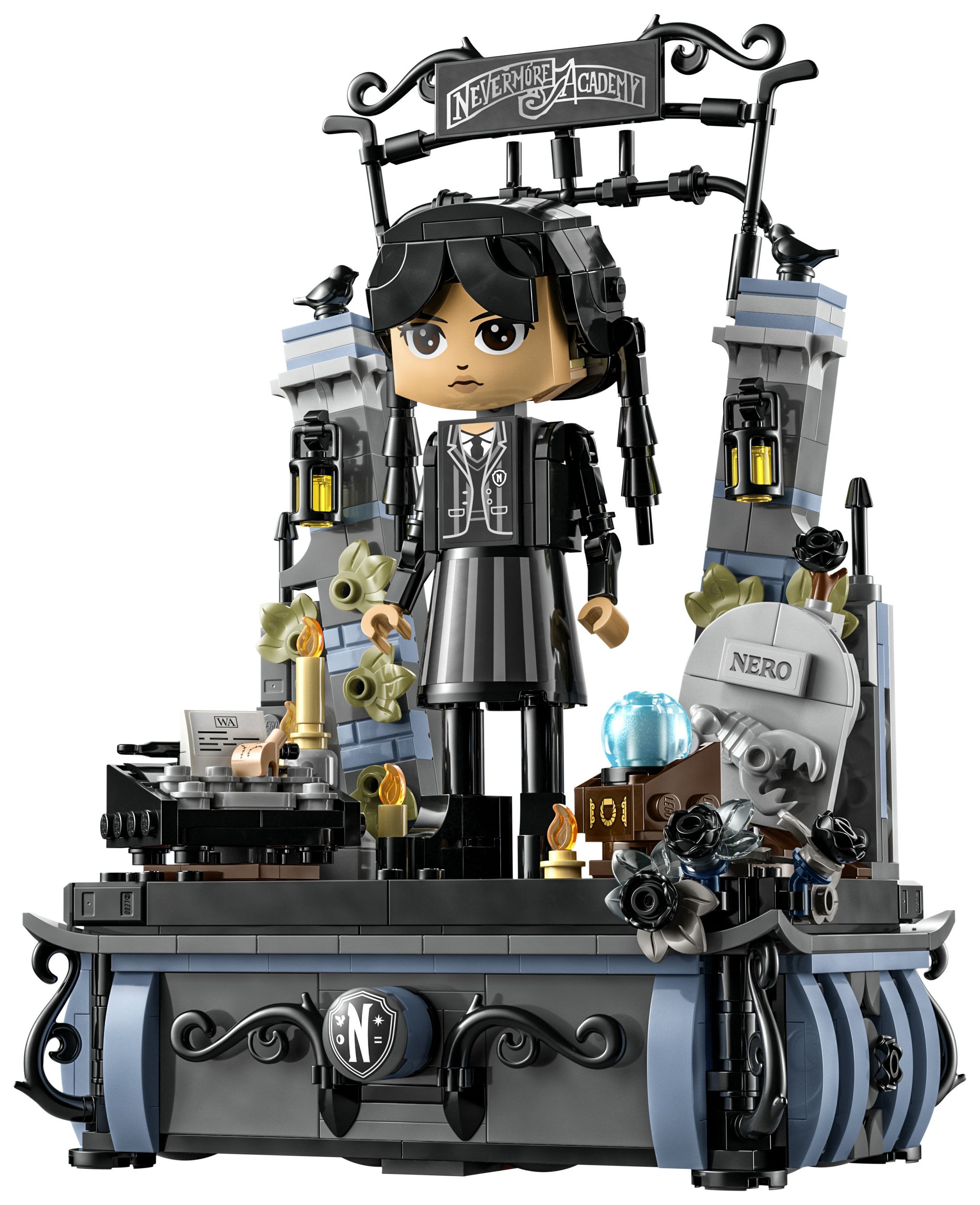 Tor zur Nevermore Academy: Fans der TV-Serie ab 10 Jahren können Wednesday in ihrer Uniform bauen oder sie in das Kleid wechseln lassen, das sie beim Rave’N Dance getragen hat, und sie auf dem Ständer in die richtige Pose bringen