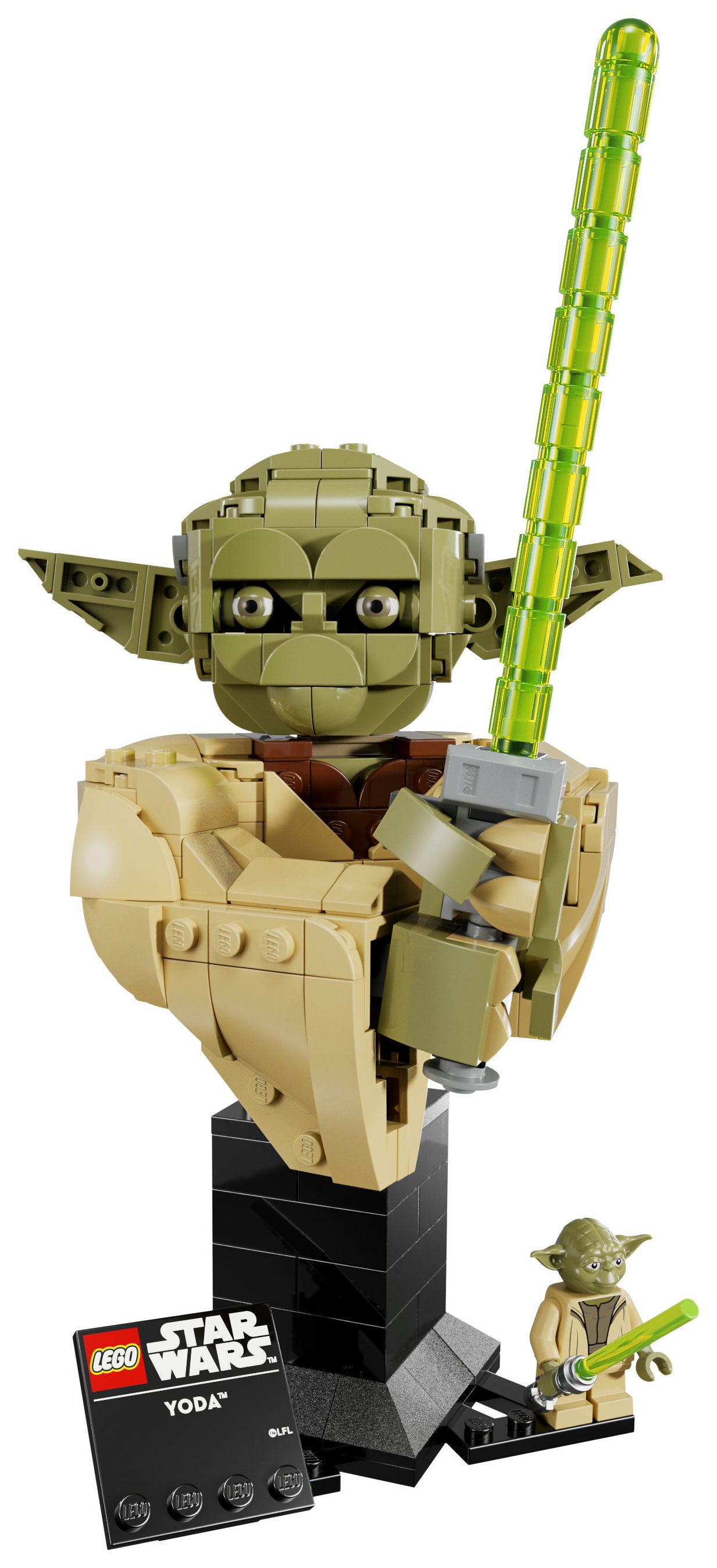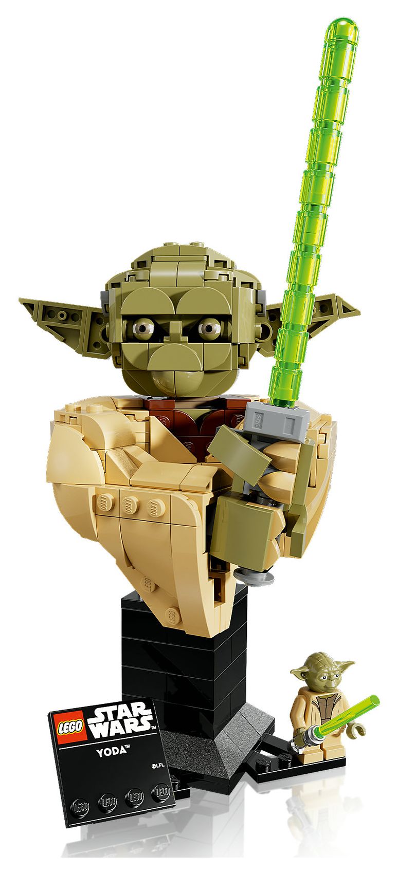 MODELL ZUM AUSSTELLEN: Stell deine Büste auf dem baubaren Ständer (mit Namensschild) neben der LEGO® Star Wars™ Minifigur Yoda aus und dreh die Büste auf dem Ständer, um sie aus jedem Winkel zu betrachten