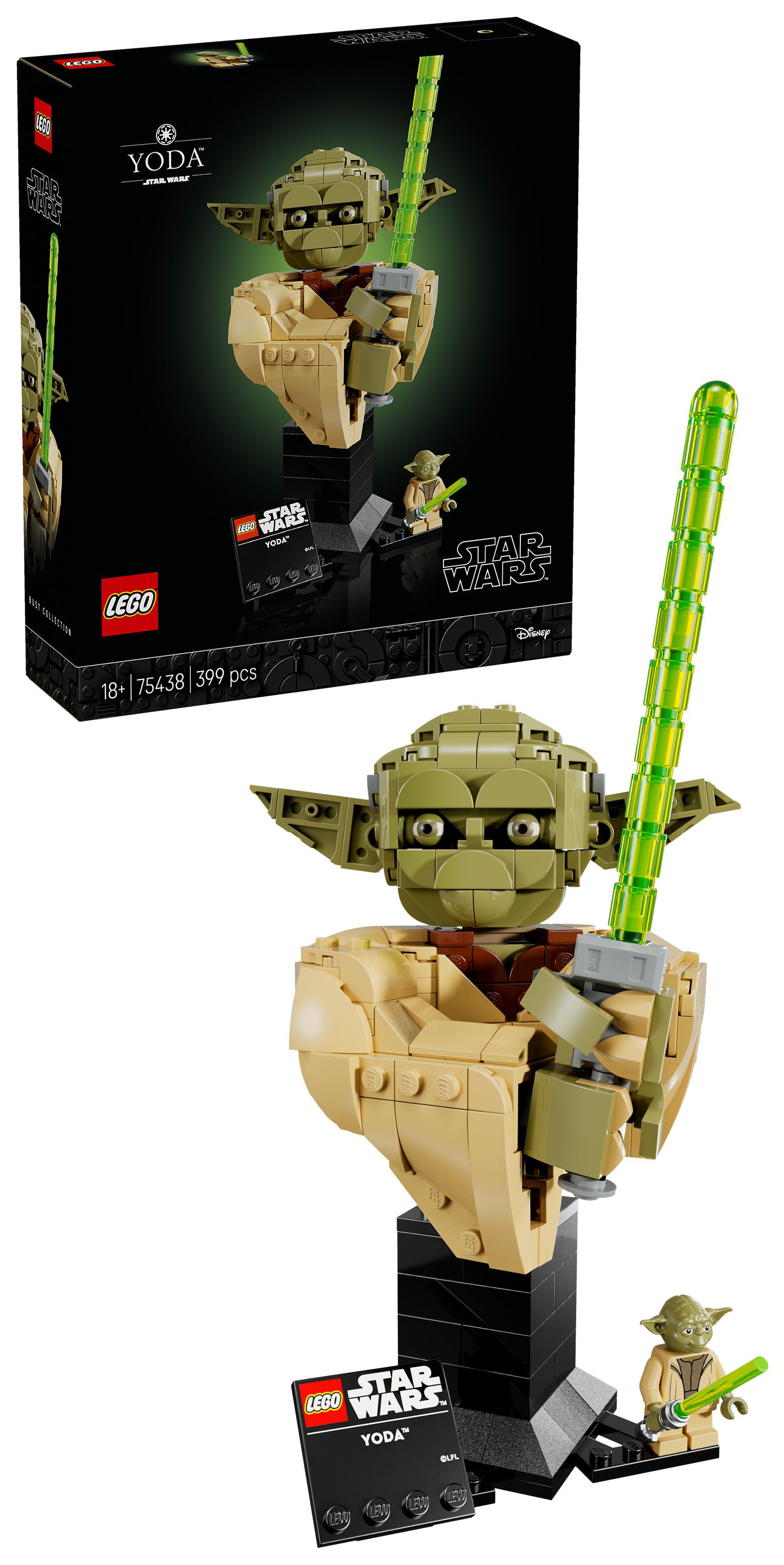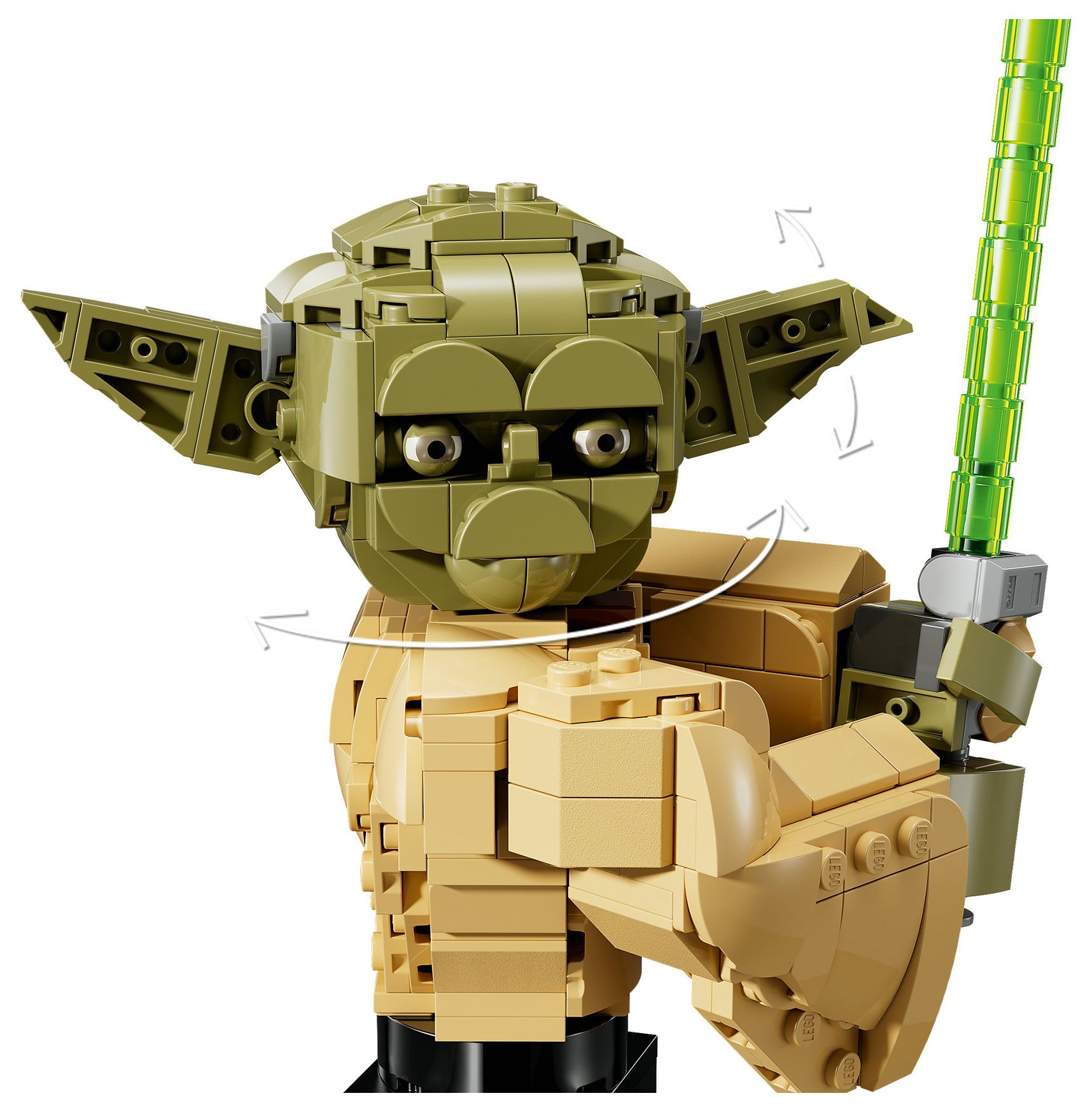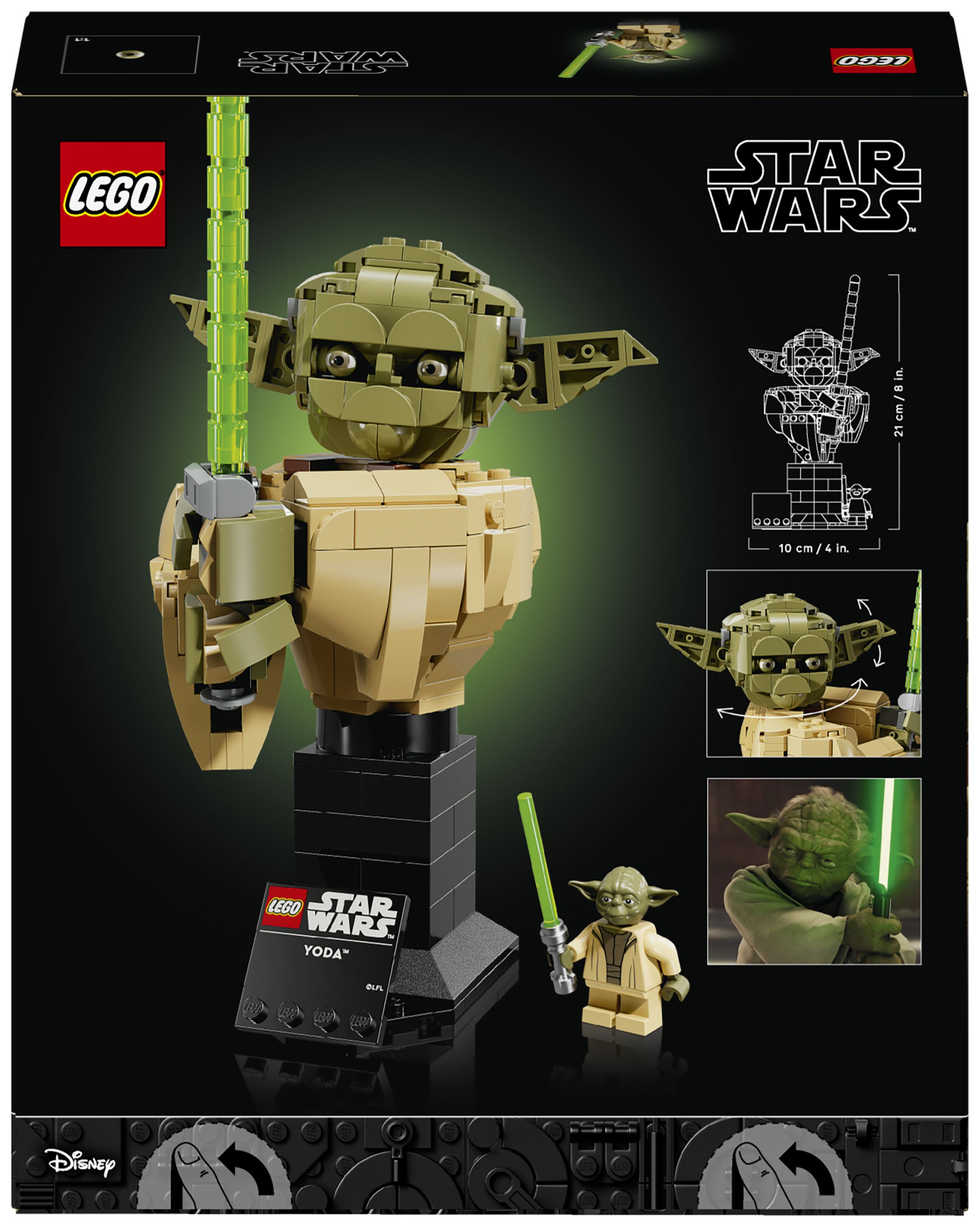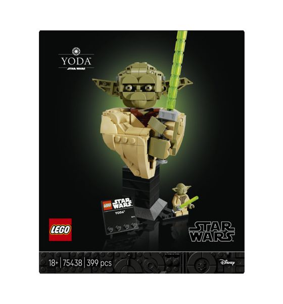 Frei dein Kopf sein muss, um diese äußerst detailreiche LEGO® Star Wars™ Yoda Büste (75438) zu bauen. Nimm dir eine Auszeit und konzentriere dich voll und ganz darauf, Meister Yoda mit allen markanten Details genau wie in Star Wars: Angriff der Klonkrieger nachzubilden. Baue ein Lichtschwert, steck es Yoda in die Hand und stell das Modell auf dem baubaren Ständer mit Namensschild aus. Bewege Yodas Kopf und Ohren, um ihm einen anderen Gesichtsausdruck zu verpassen. Dreh die Büste auf dem Ständer, um sie aus jedem Winkel zu betrachten. Baue den Ständer geringfügig um, damit die beiliegende LEGO Minifigur Yoda mit ihrem Lichtschwert auch noch Platz hat.