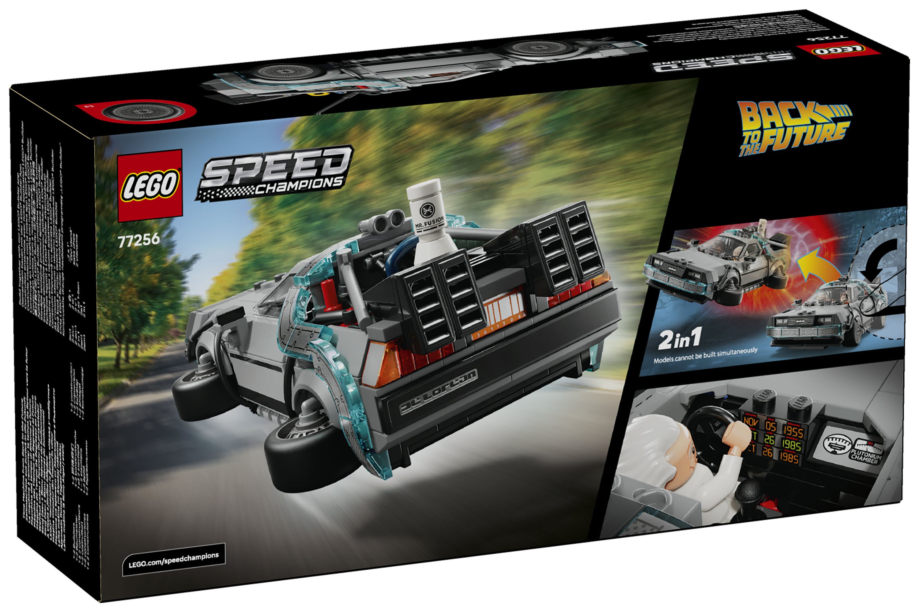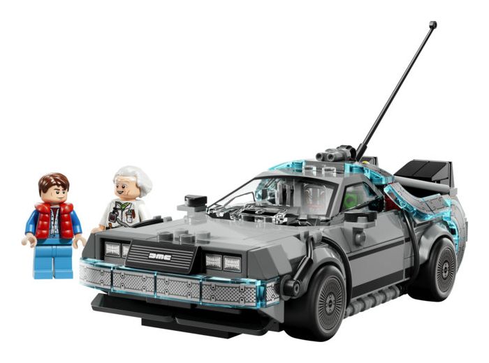 Baue das legendäre Auto mit dem Blitzableiter und dem kalifornischen Nummernschild aus dem ersten Film und baue den Flitzer dann in die fliegende Variante aus dem zweiten Film um, das heißt mit Fusionsgenerator, orangem Nummernschild und umgeklappten Rädern. Beide Versionen haben Luftauslässe am Heck, ein Cockpit, den Fluxkompensator und eine Zeitanzeige.