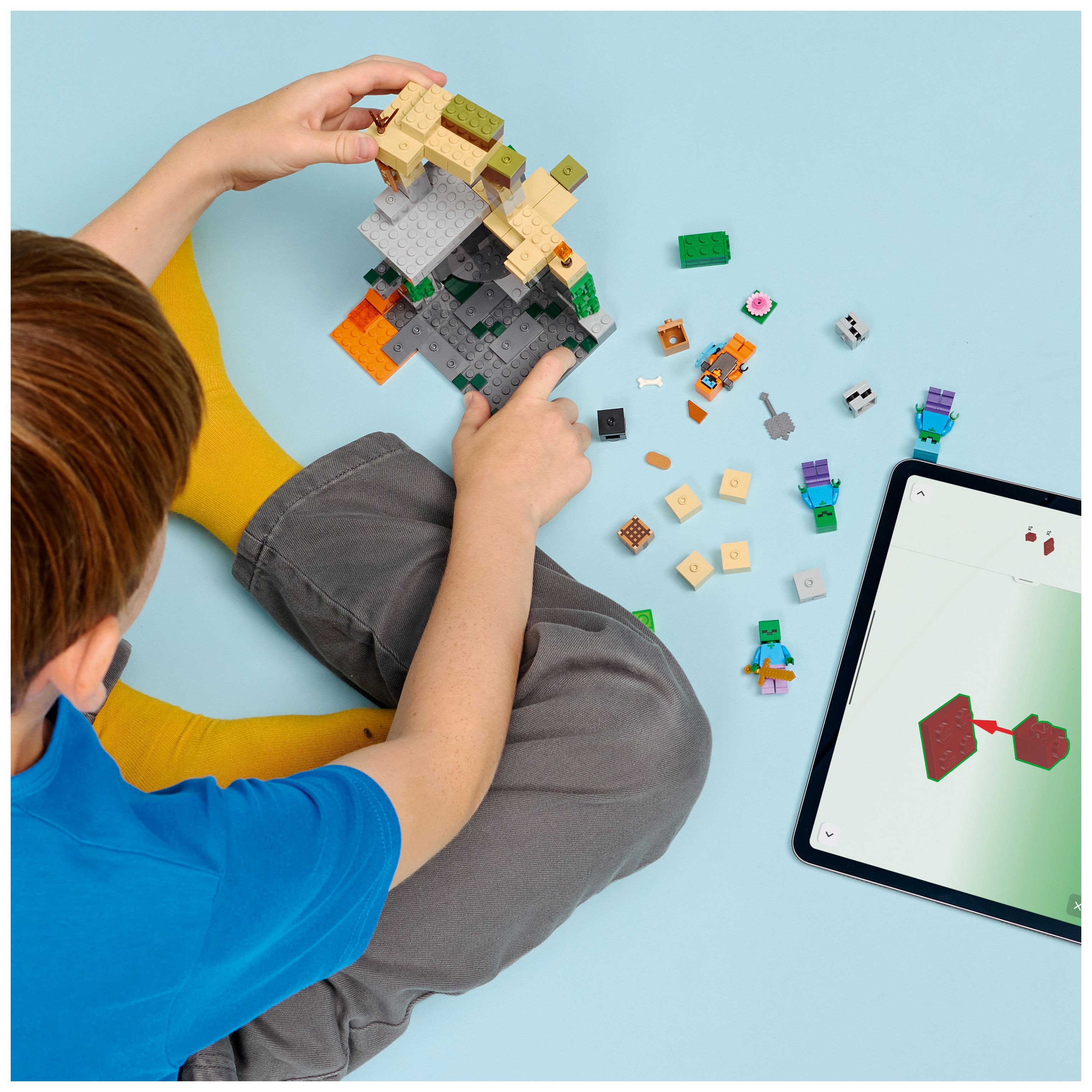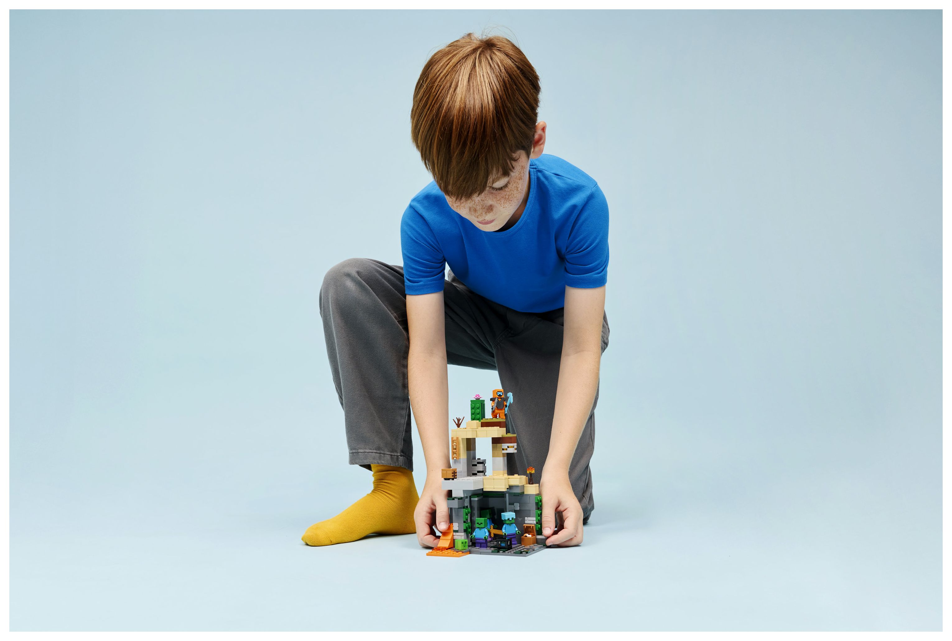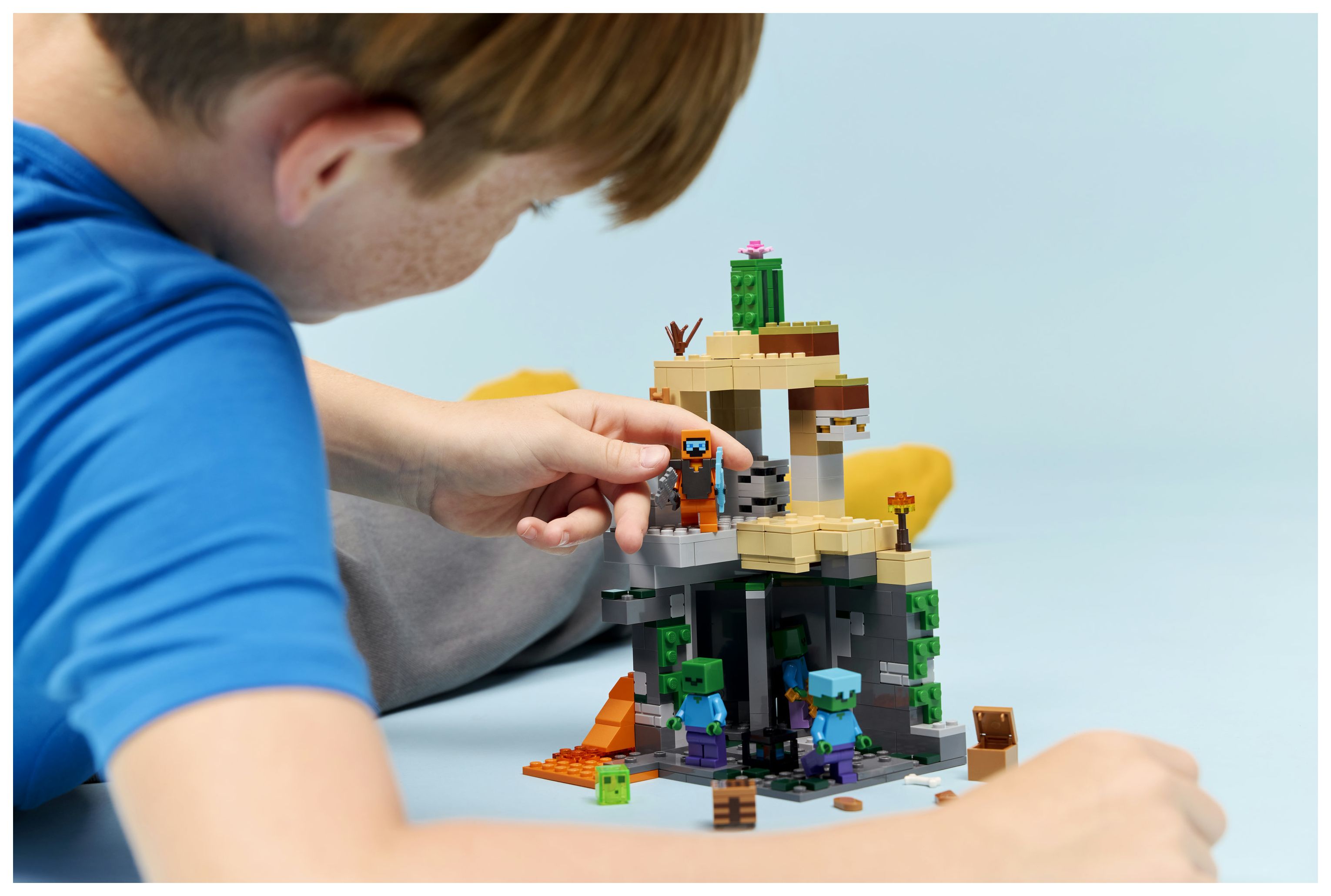 SPIELZEUG FÜR ROLLENSPIELE: Das Set stellt eine Szene im Minecraft-Wüstenbiom dar. Eine rotierende Zombie-Spawning-Kammer und ein Schieber, der einen Felssturz auslöst, laden zum Spielen ein