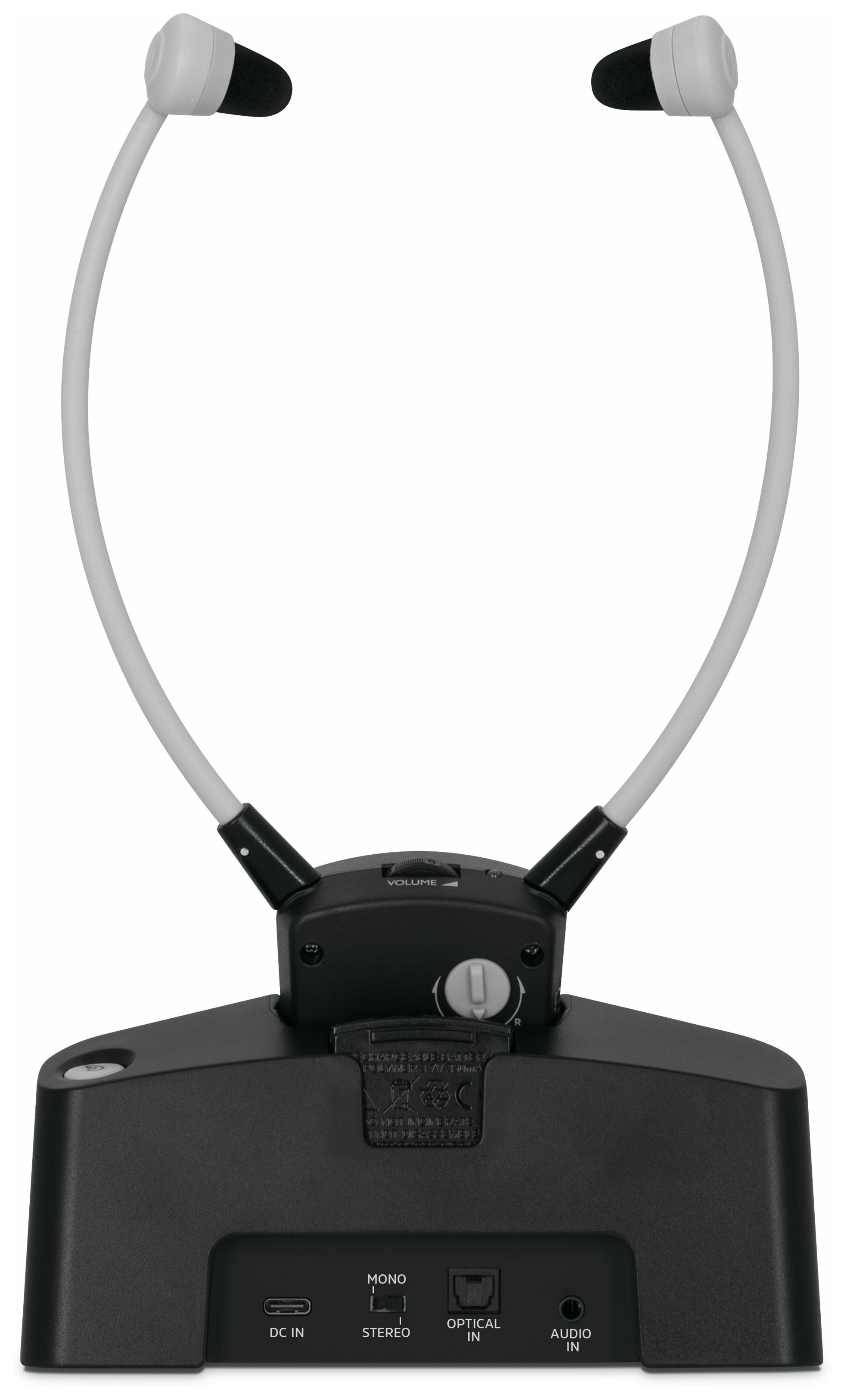 Die Bauweise ermöglicht eine bequeme und unkomplizierte Bedienung der wichtigsten Funktionen wie Lautstärkeregelung oder Ein- und Ausschalten beim Tragen des Kopfhörers. Über den Mute-Knopf am Kopfhörer können Sie zudem den Ton der angeschlossenen Audioquelle ausblenden. So schalten Sie schnell und einfach vom Fernsehton auf Kommunikation um und unterhalten sich jederzeit mit anderen Personen im Raum. Hierbei wird gleichzeitig das integrierte Mikrofon des Kinnbügelhörers aktiviert, wodurch Geräusche und Gespräche aus der direkten Umgebung verstärkt werden.
