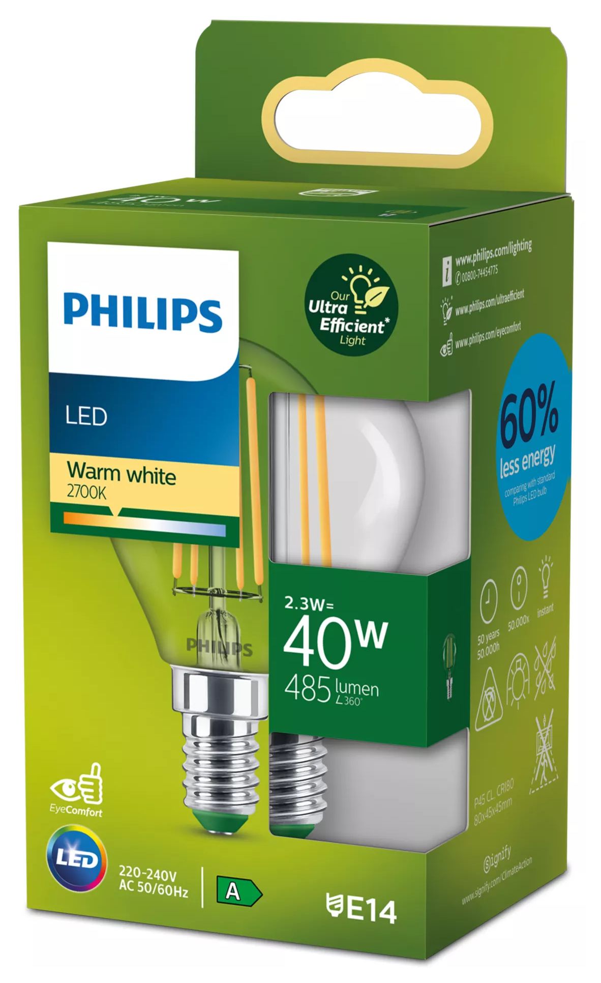 UltraEfficient-LED-Leuchtmittel von Philips sorgen für eine schöne Lichtstimmung, bieten eine außergewöhnlich lange Lebensdauer von 50.000 Stunden und ermöglichen sofort deutliche Energieeinsparungen. Du brauchst die Lampe seltener auszutauschen und kannst Dich dank unserem bewährten EyeComfort-Design über ein augenschonendes Licht freuen.