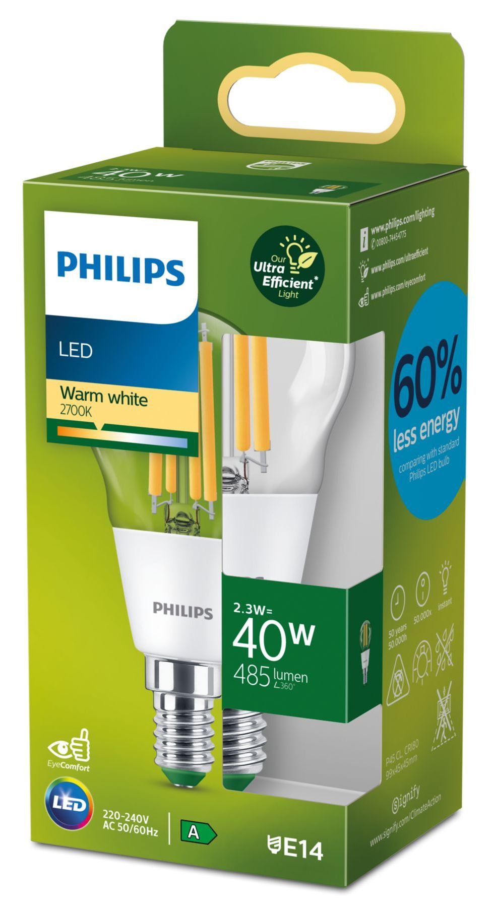 Philips Filament-Kerzenlampe, P45 E14, transparent, 40 W, 2,3 W, 40 W, E14, 485 lm, 50000 h, Warmweiß