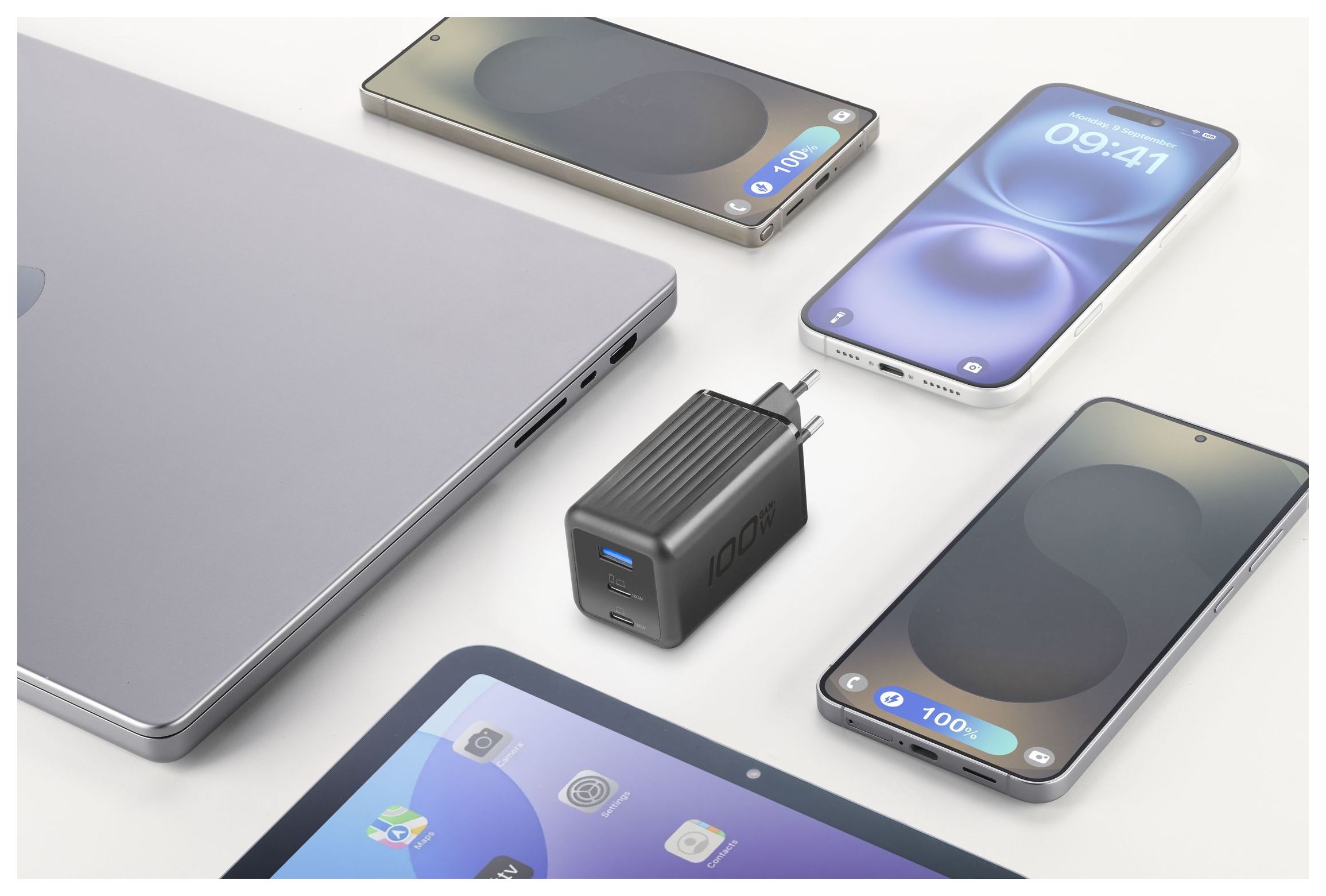 Das 100W GaN+ Wandladegerät ist Teil der MULTIPOWER PERFORMANCE‑Serie von Cellularline. Ausgestattet mit zwei 100W USB‑C Power Delivery Ports und einem 30W USB‑A Quick Charge Port ist es die ideale Lösung, um mehrere Geräte – Smartphone, Tablet und Laptop – gleichzeitig ohne Leistungsverlust zu laden. Dank GaN+‑Technologie bietet es hohe Geschwindigkeit, Sicherheit und maximale thermische Effizienz in einem kompakten, tragbaren Design. Entwickelt für schnelles und stabiles Laden in jeder Situation.
