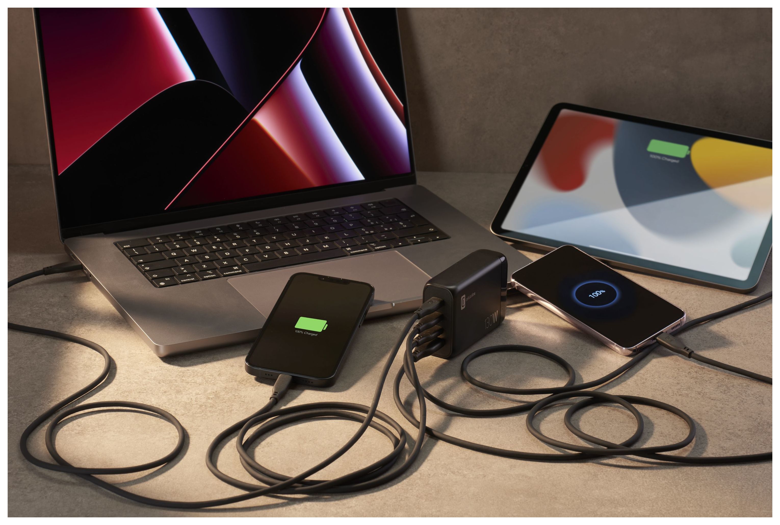 MULTIPOWER DESK GAN 130W ist ein ultrakompaktes Desktop-Ladegerät, das sich ideal zum gleichzeitigen Aufladen von Smartphones, Tablets und Laptops eignet, die mit 100 W und weniger kompatibel sind. Bei gleichzeitiger Nutzung liefern die Anschlüsse maximal bis zu 130 W. Die USB-C Power Delivery 100W-Ports sind mit Samsungs Super Fast Charging kompatibel, während der USB-A-Port adaptives Laden mit bis zu 30W ermöglicht. MULTIPOWER GAN 130W ist mit der GaN-Technologie ausgestattet, die auf Galliumnitrid (GaN) basiert, einem Material, das seit kurzem in Halbleitern für Ladegeräte verwendet wird. Der Hauptvorteil von Galliumnitrid in Bezug auf Batterieladegeräte besteht darin, dass es weniger Wärme erzeugt. Durch die geringere Wärmeentwicklung können die Bauteile näher beieinander liegen, wodurch sich die Größe der Ladegeräte verringert.