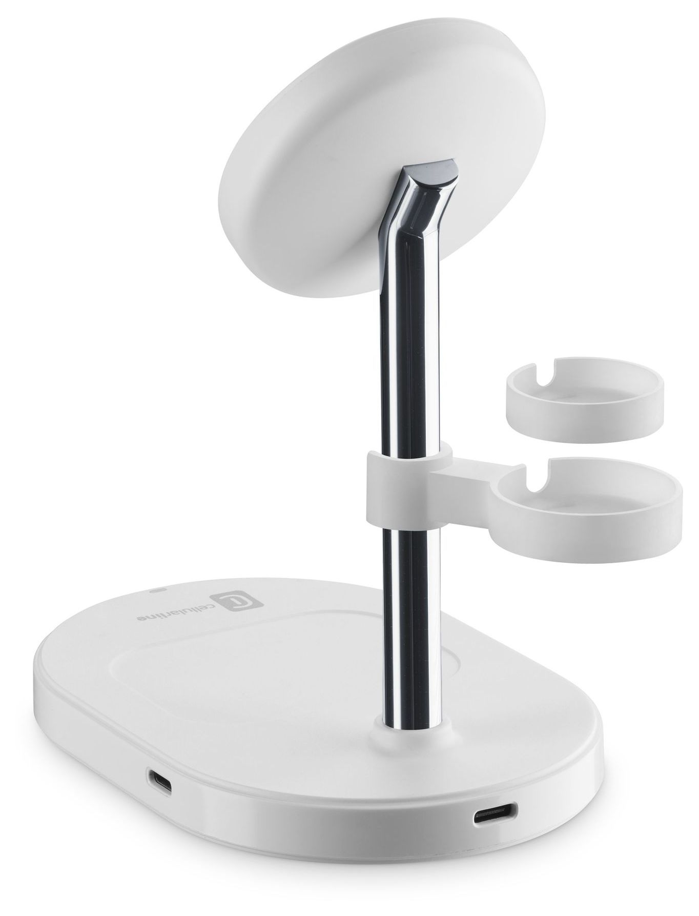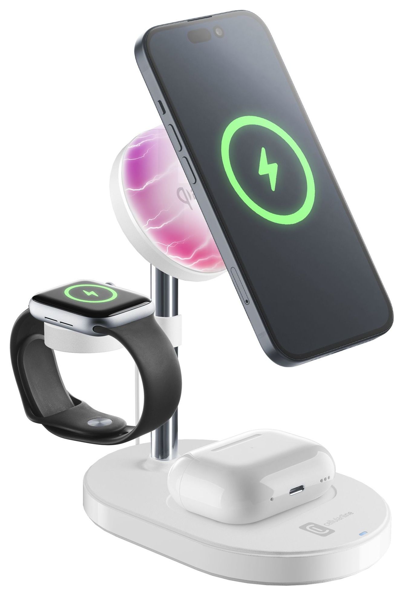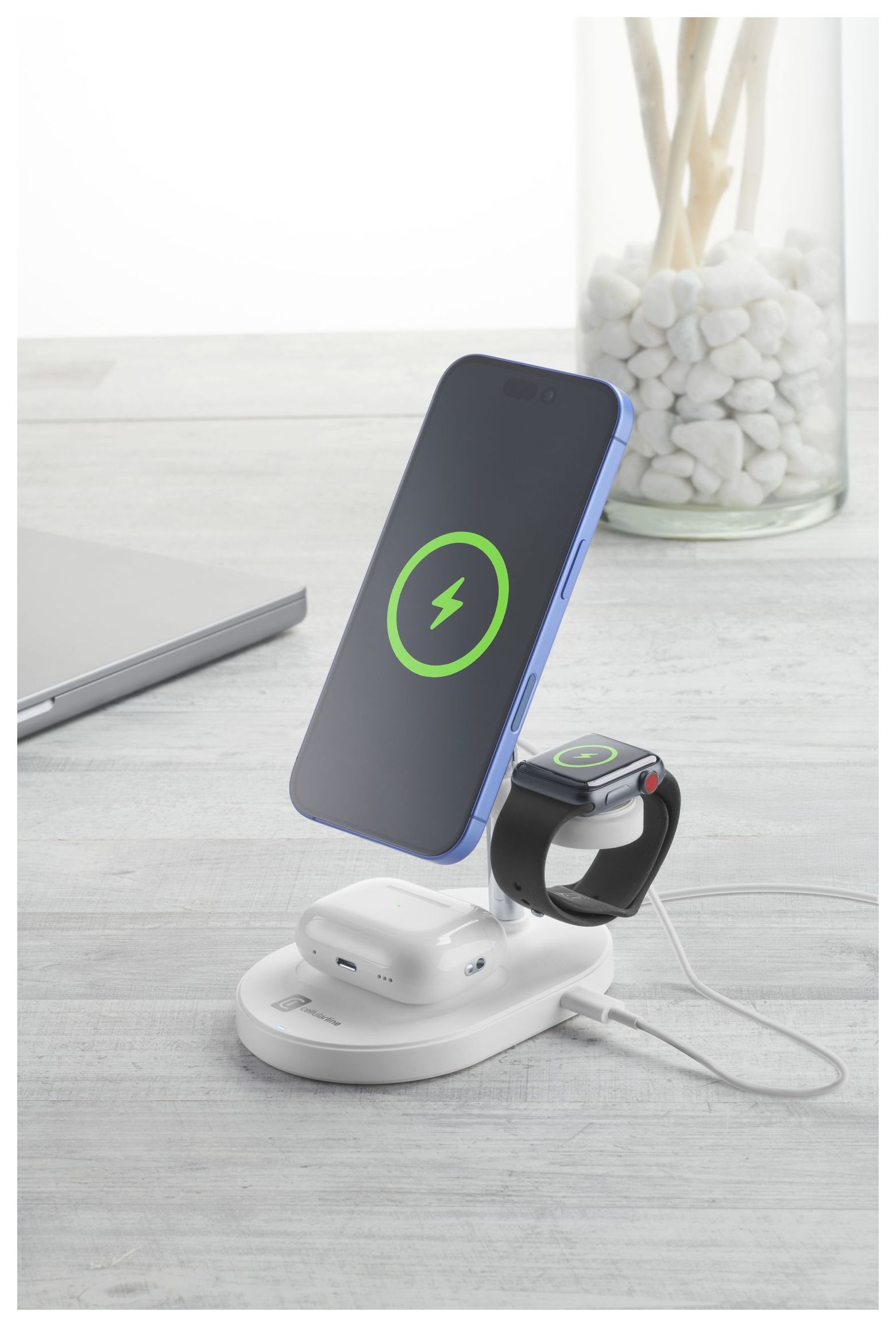 MAG TRIO ist die magnetische drahtlose Ladestation, die dafür entwickelt wurde, Smartphones, kabellose Kopfhörer und Smartwatches gleichzeitig zu laden. Dank der Qi2-Zertifizierung gewährleistet sie schnelles Laden mit bis zu 15W für kompatible Smartphones, mit präziser magnetischer Ausrichtung für maximale Sicherheit und Effizienz. Das magnetische Pad ermöglicht das Positionieren des Smartphones sowohl vertikal als auch horizontal, während die Basis einen speziellen Bereich für das Laden kabelloser Kopfhörer mit einer maximalen Leistung von 5W enthält. Darüber hinaus verfügt MAG TRIO über einen anpassbaren Steckplatz für das Laden von Apple- und Samsung-Smartwatches, in den das Originalkabel (nicht enthalten) eingesetzt werden kann. Im Lieferumfang ist ein Magnetring enthalten, der das kabellose Laden auch bei kompatiblen Smartphones ermöglicht und die Verbindung zwischen Gerät und Zubehör verbessert. MAG TRIO ist die perfekte Lösung für alle, die multifunktionales, sicheres und elegantes Laden suchen, kompatibel mit kabellosen Smartphones, Kopfhörern und Smartwatches.