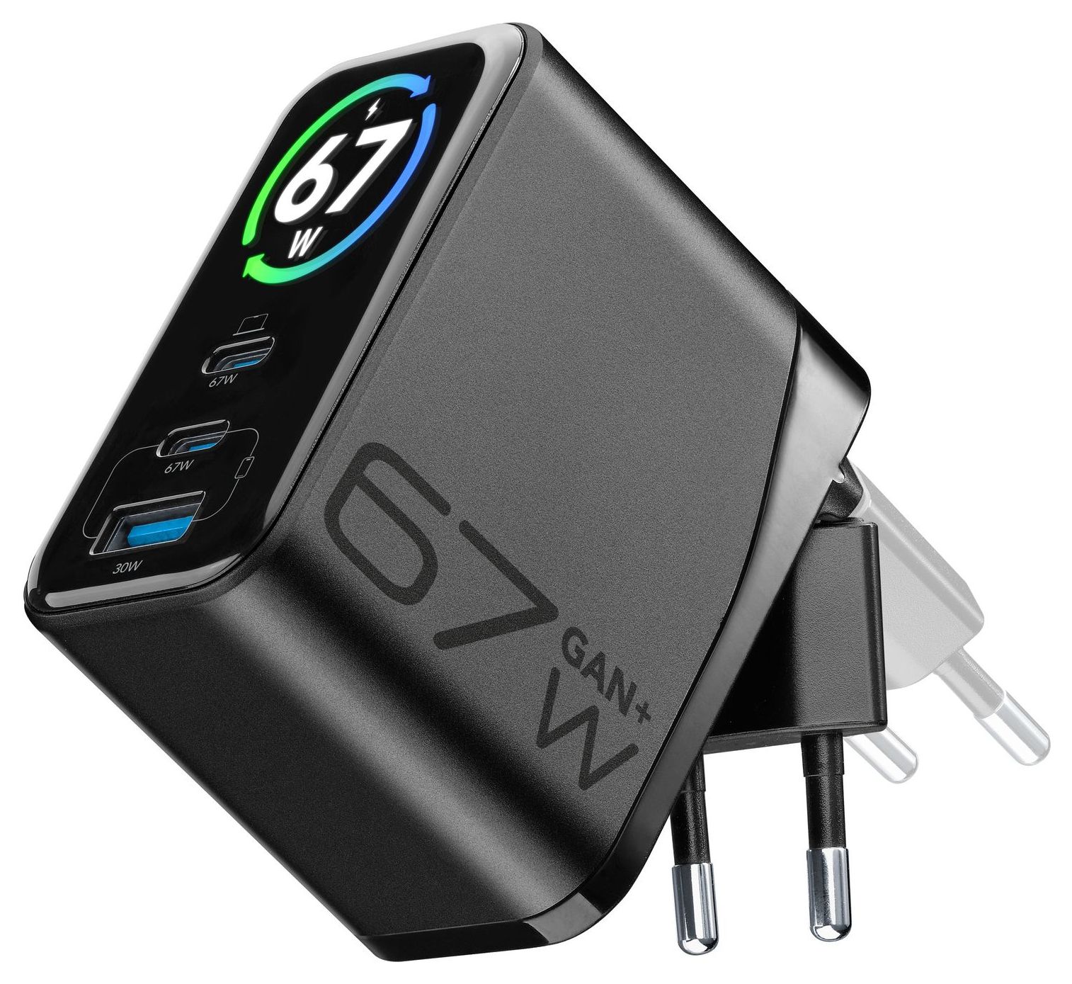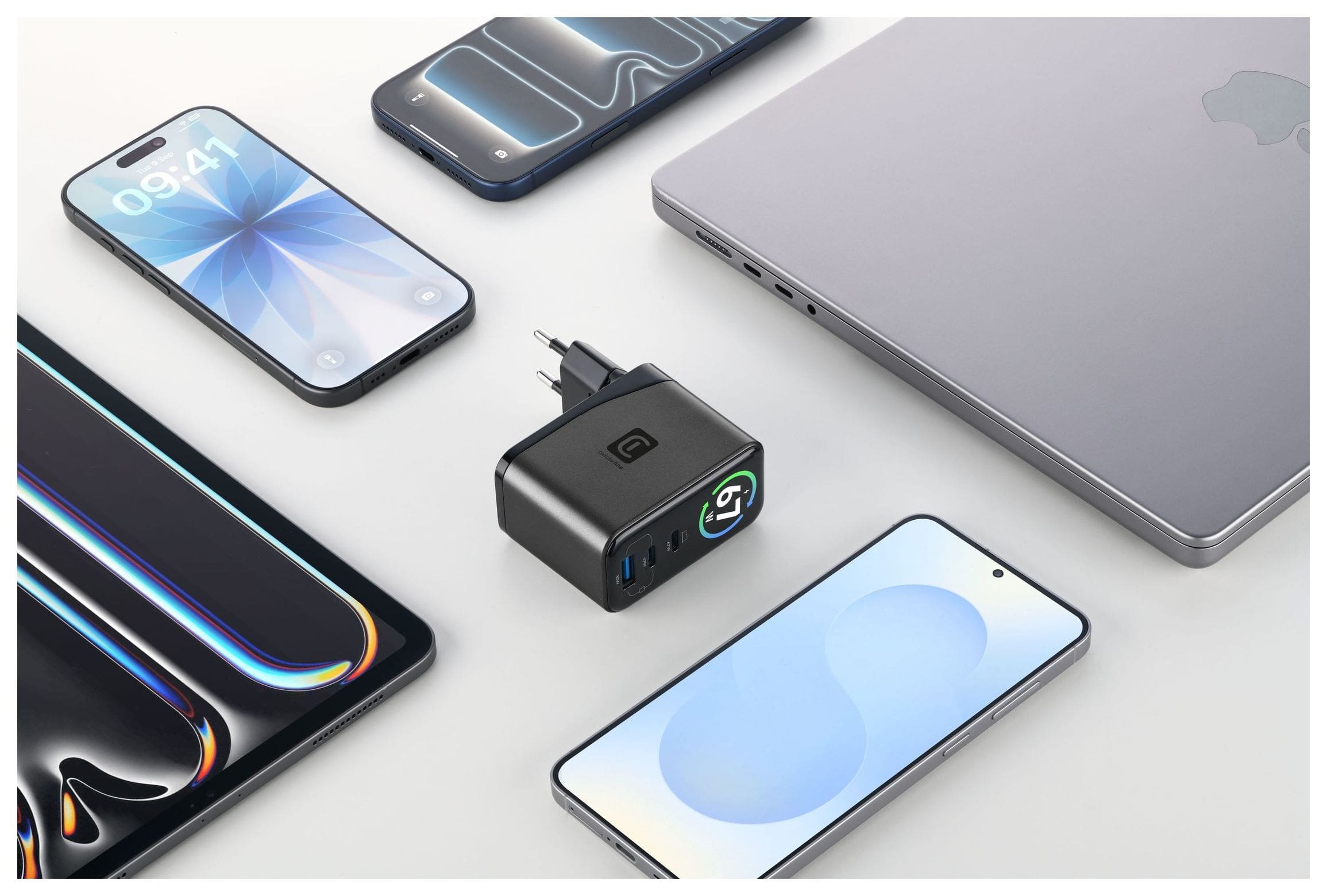 Das PowerView IQ 67W Netzladegerät gehört zur neuen Cellularline Produktlinie für hohe Leistung und maximale Kontrolle. Dank des smarten TFT-Displays werden die Ladedaten jeder Schnittstelle in Echtzeit angezeigt, einschließlich abgegebener Leistung, Wattzahl und Temperatur – für maximale Transparenz und kontinuierliche Leistungsüberwachung. Zwei USB-C-Ports mit 67W sowie ein USB-A-Port mit 30W ermöglichen effizientes Laden von Smartphones, Tablets und Laptops. Die GaN+ Technologie kombiniert hohe Leistung mit kompaktem Design, während der klappbare Stecker die Portabilität erhöht und das Ladegerät beim Transport schützt.
