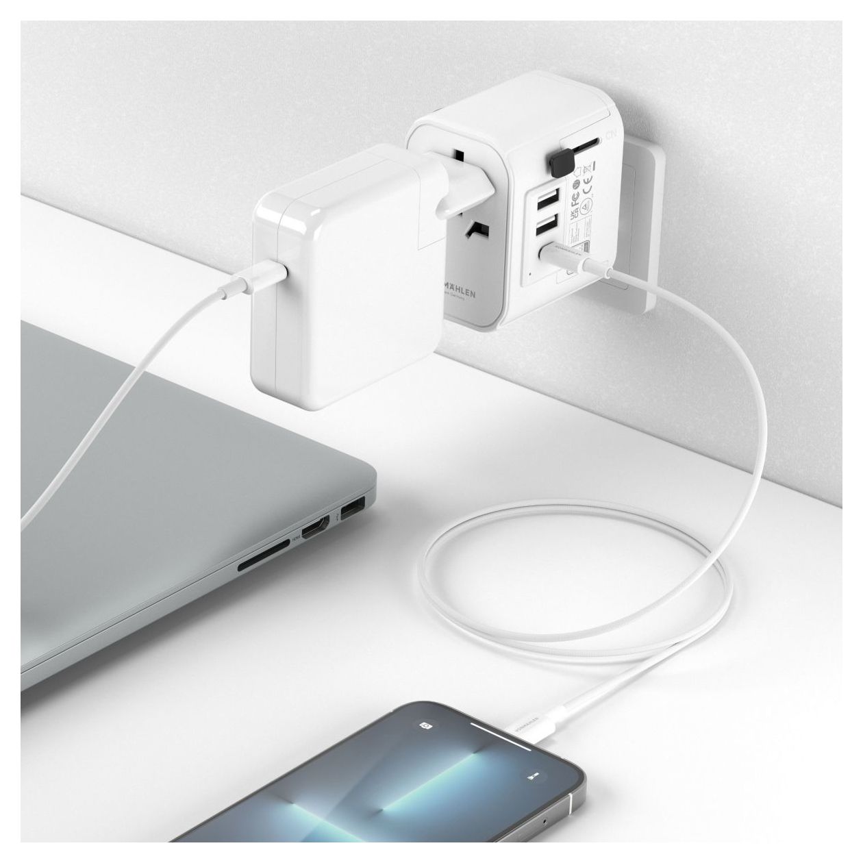 Unity One bietet dir vier unterschiedliche Adapter, die Kompatibilität für über 150 Länder weltweit bieten: Für die USA, Großbritannien, China sowie Europa. Darüber hinaus verfügt Unity One über zwei integrierte USB-A-Ports sowie einen USB-C Port.