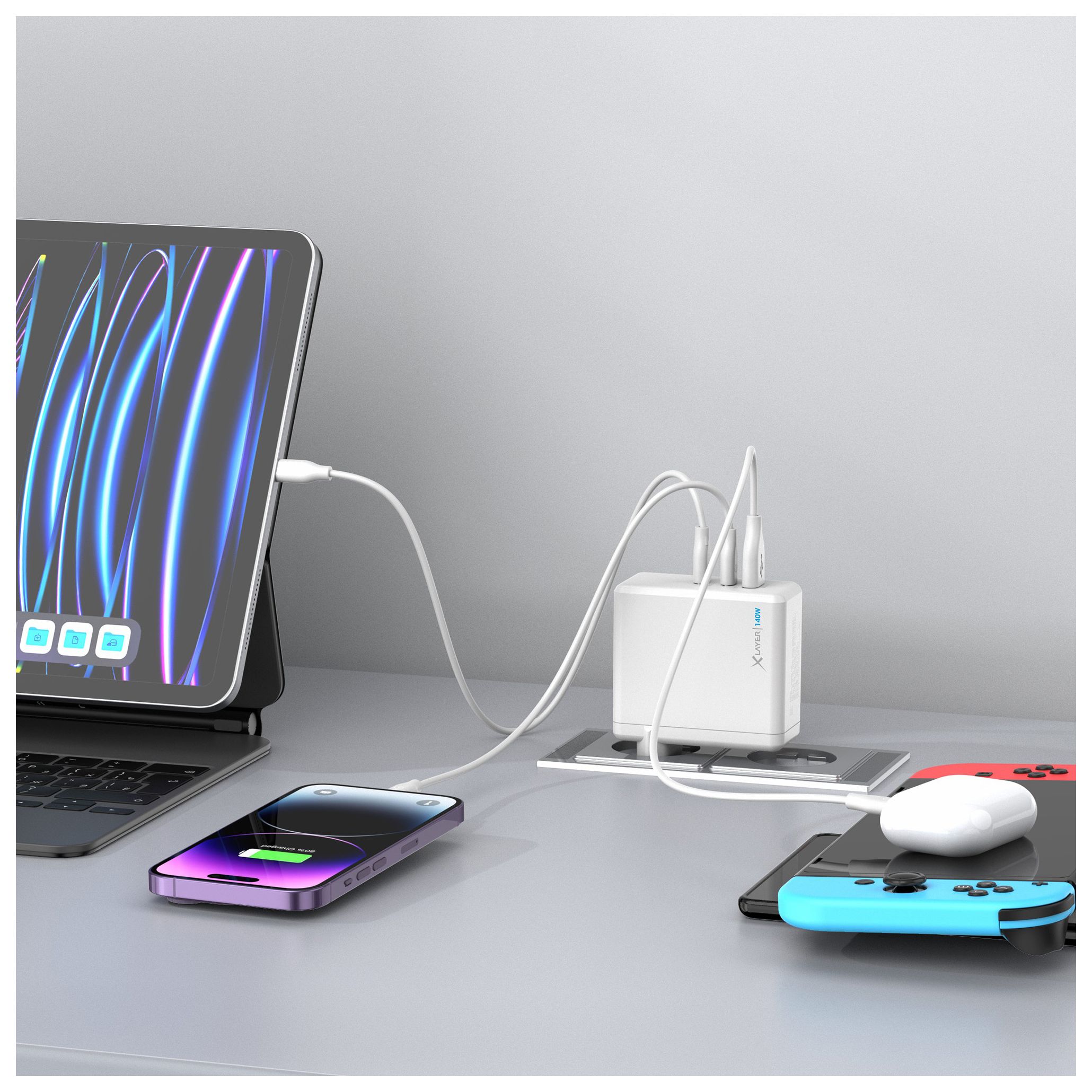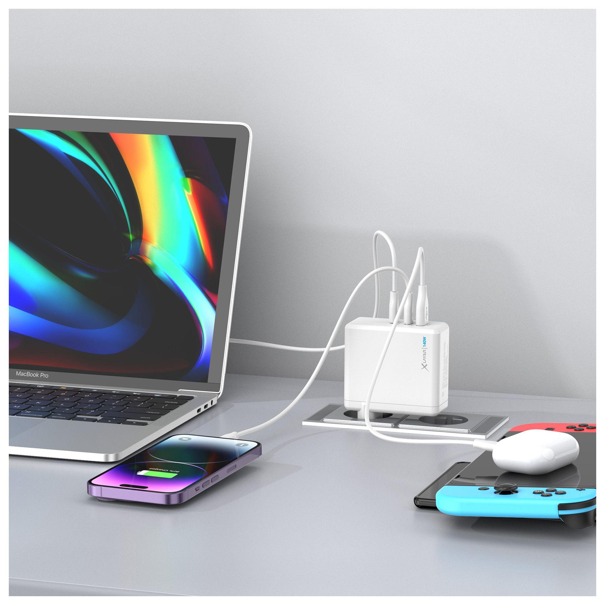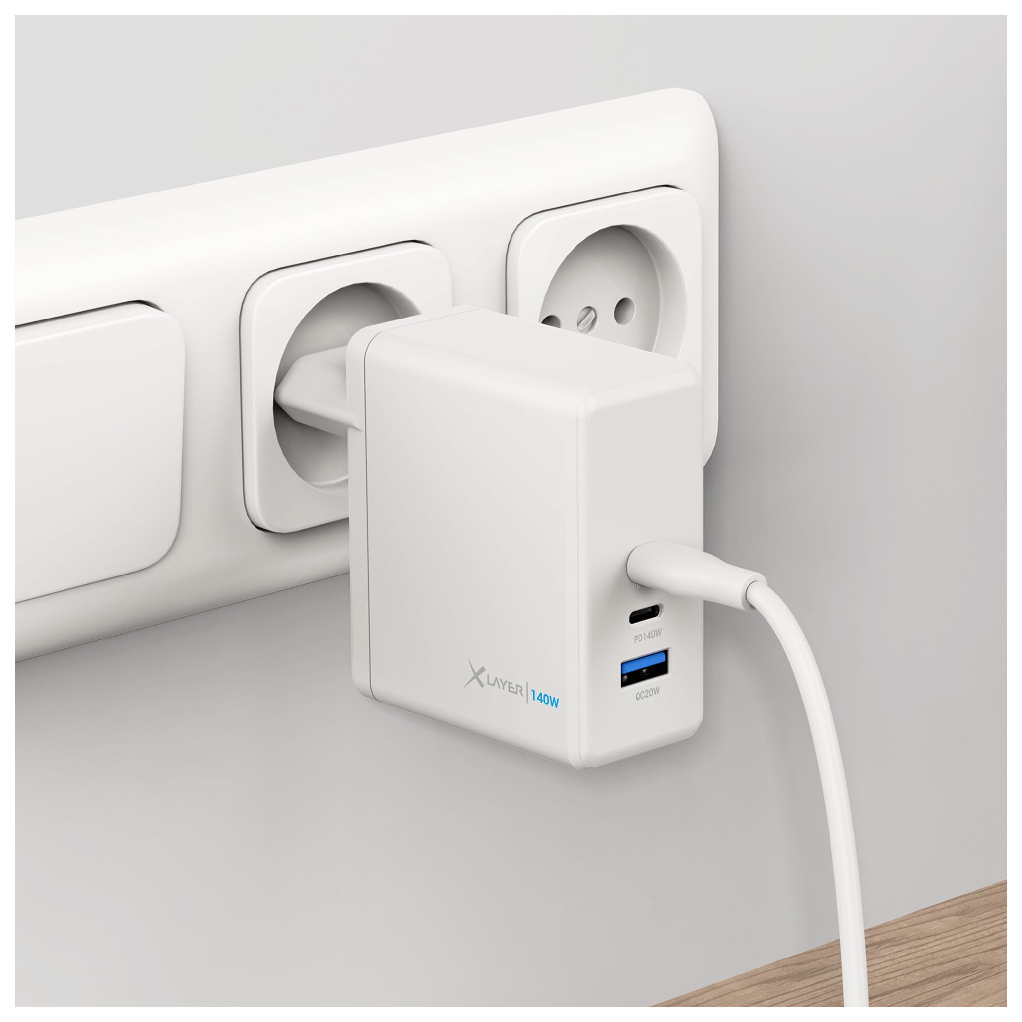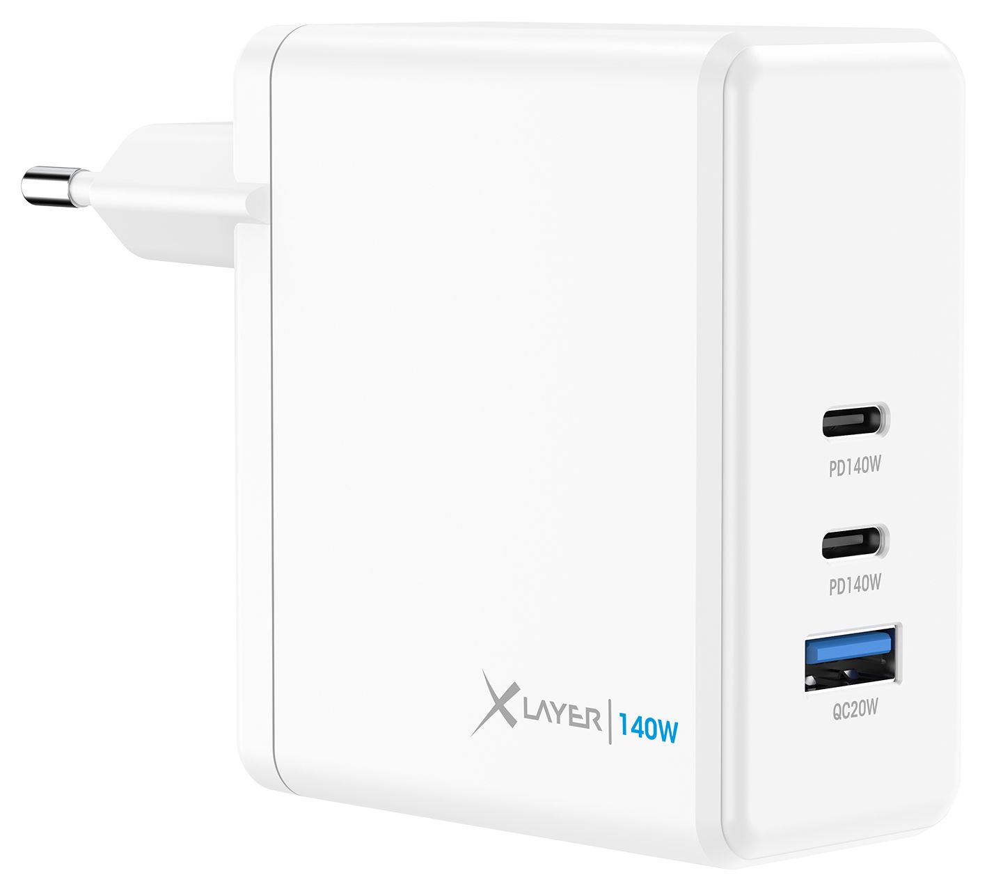 Der Universal 140W Powercharger ist das leistungsstärkste Ladegerät von XLayer. Dank zwei USB Typ C-Anschlüssen mit bis zu 140 Watt Ladeleistung lassen sich selbst High-End-Notebooks schnell und effizient mit Strom versorgen. Ein weiterer USB Typ A-Anschluss mit einer Leistung von bis zu 20 Watt sorgt für maximale Flexibilität im Alltag. So können an einer Steckdose bis zu drei Geräte gleichzeitig geladen werden. Auch die Schnellladefunktion von Smartphones und Tablets wird dank der zukunftsorientierten, hohen Ladeleistung langfristig unterstützt. Mit seinem kompakten Design ist der 140W Powercharger selbst außerhalb des Alltags der ultimative Begleiter.